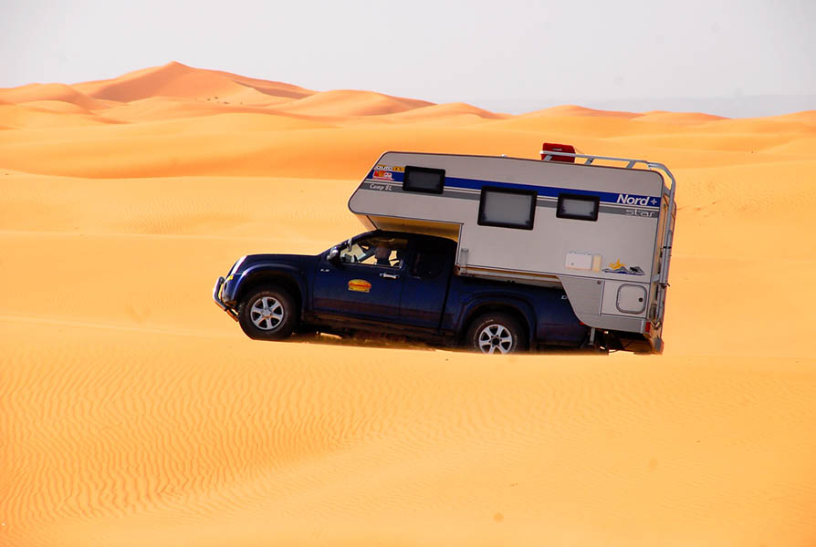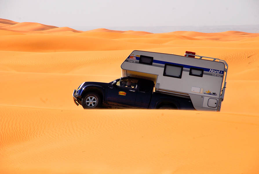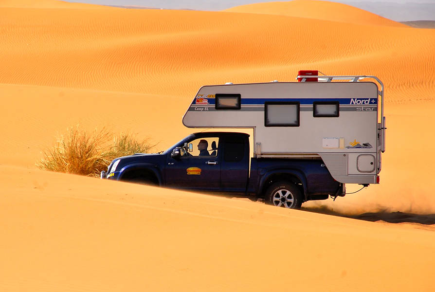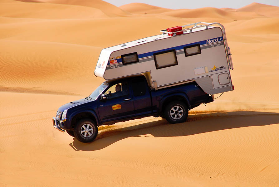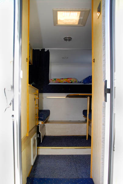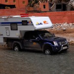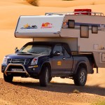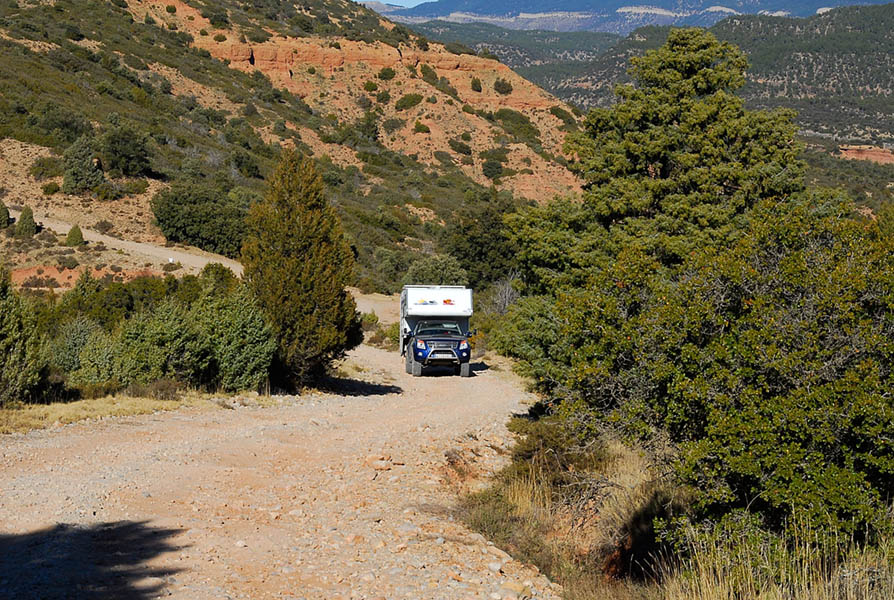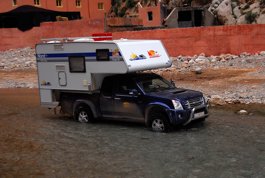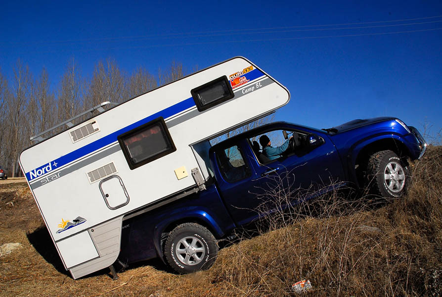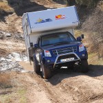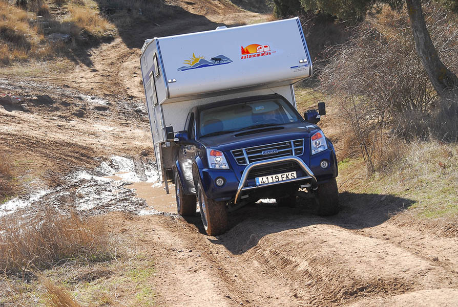 Con la célula encima el comportamiento cambia, pareciéndose más al típico de una autocaravana, el ritmo en carretera baja a unos buenos 110-130 km./h. en los que el consumo se va a alrededor de los 14 l./100km., dependiendo mucho del aire frontal. En curvas, el balanceo de la caja es más apreciable, como no podía ser de otra forma, pero se mantiene dentro de unos límites más que razonables y seguros, aguantando perfectamente inclinaciones realmente grandes tanto en carretera como en off road, donde su principal límite esta en la anchura de los caminos y especialmente en la altura, pues la célula se va a los tres metros de alto y si hay árboles podemos ir “podando” más de la cuenta.