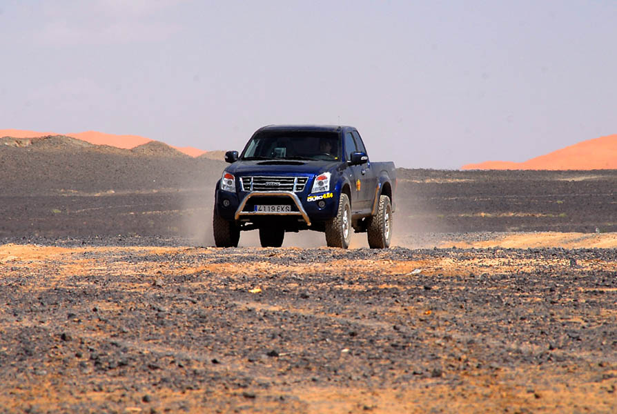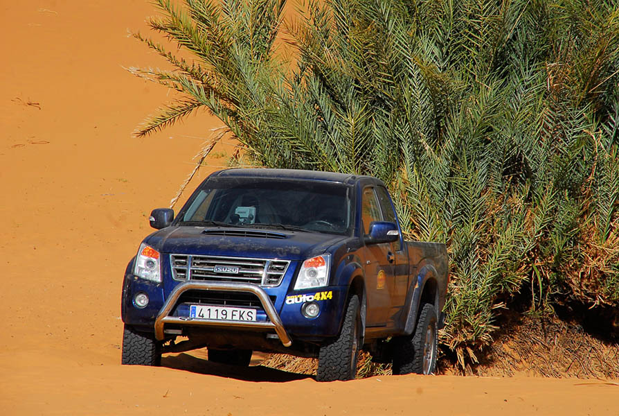 Un gato hidráulico de 2 tn. tipo taller, una pistola eléctrica, un maletín de herramientas profesional, eslingas, grilletes, pala y un pequeño surtido de recambios (amortiguador, correas, filtros, etc.), componen la preparación actual, que solo está a falta de que lleguen un snorkel, para darle a “respirar” mejor aire al motor y una plancha de protección de carter más amplia. Simple y efectivo. La única concesión a la estética ha sido la defensa frontal y el único capricho que a lo mejor le hago es modificar la curva de potencia, no para obtener más CV sino para obtener más par en la zona media (2000-3000 r.p.m.), el mejor régimen para ir tanto por las dunas como por autopista, sin forzar el motor en el primer caso, ni arriesgarte a que te quiten el carné en el segundo.