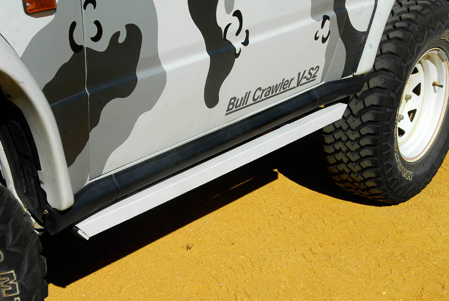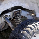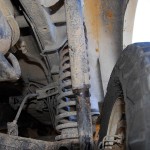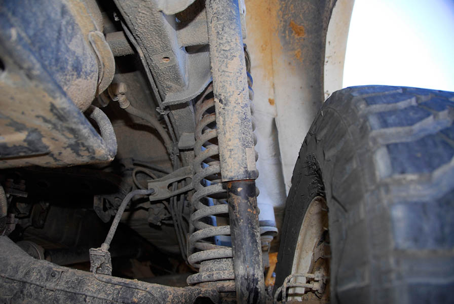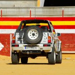 A continuación se subió la suspensión con un Kit Calmini “made in tornero amigo”, entonces nos dimos cuenta de que el coche era muy rebotón, muy duro para las rutas, por lo que le cambiamos toda la suspensión, hasta lograr que el coche, ruteando a una velocidad alta, se comporte bien, por lo que ahora delante lleva muelles Calmini +4 cm además de unos suplementos de + 3,5 cm y amortiguadores Calmini. Detrás lleva muelles Mavilsa para Grand Vitara +4 cm. y unos calzos de +3,5 cm. Además, se le han montado unos calzos para las rotulas, un espaciador para la transmisión, unos soportes para bajar el grupo trasero y unas excéntricas para corregir la caída de las ruedas.
