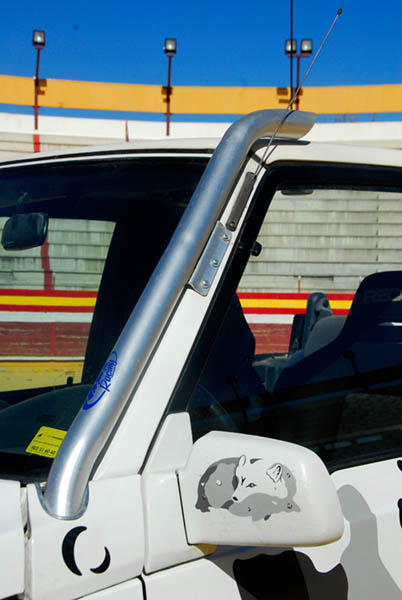 El proceso de preparación comenzó con las ruedas, al ver que con las 295 no andaba, dijimos, aquí pasa algo, le falta algo al coche, y le pusimos una medida mucho más acorde a su tamaño, unas 195. Otra de las primeras cosas que le hice al coche fue ponerle un snorkel de la marca ARC.