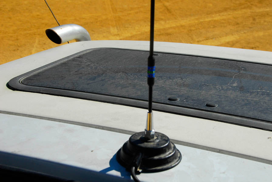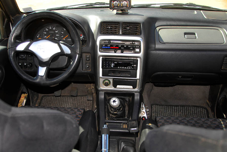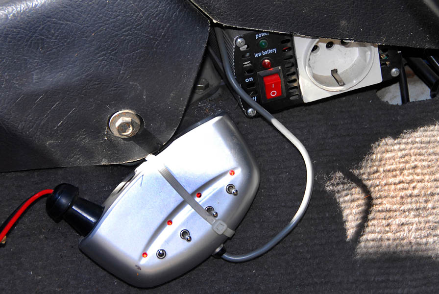 En el interior, instalamos unos semi backets Recaro del modelo Style junto a un volante deportivo, también lleva instalado una toma cuádruple de mechero para poder enchufar todos los accesorios y un inversor de corriente, para poder conectar cosas que vayan a 220V., ya que además de nevera, cargadores, etc. acostumbro a llevar la emisora, una President Billy de 27 Mhz, especialmente cuando salimos de ruta.
