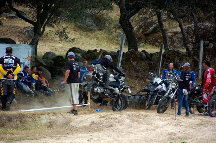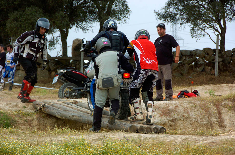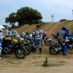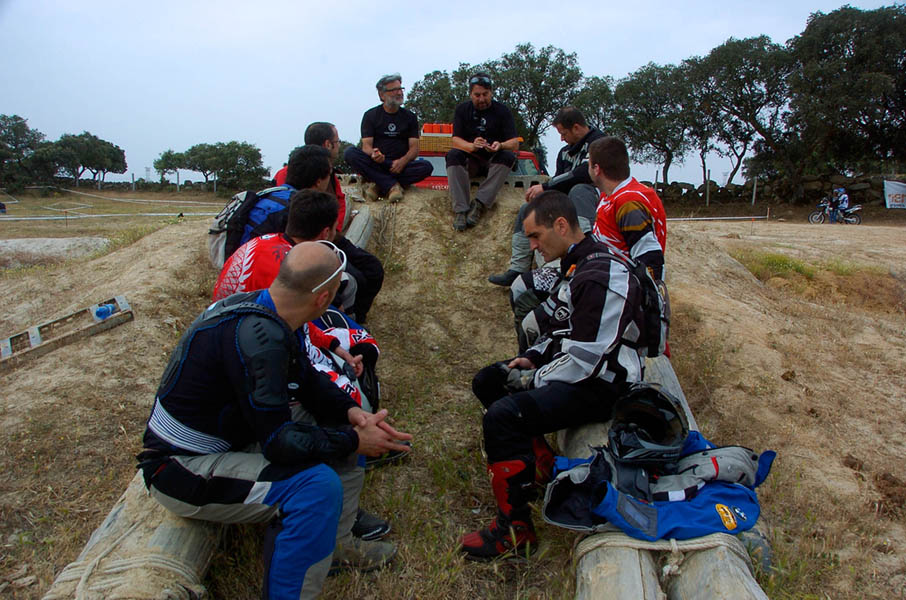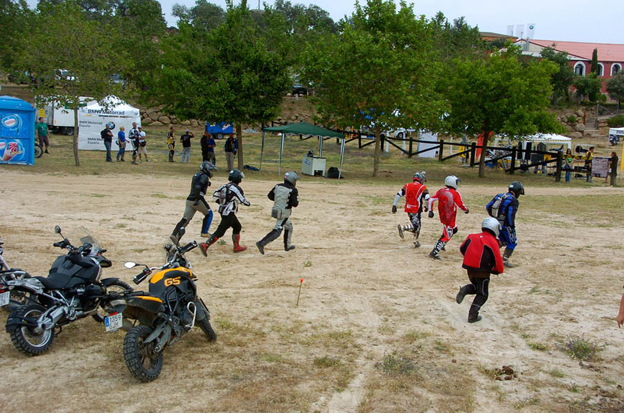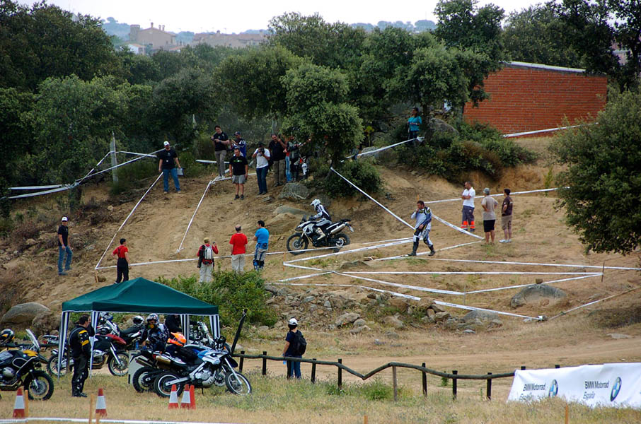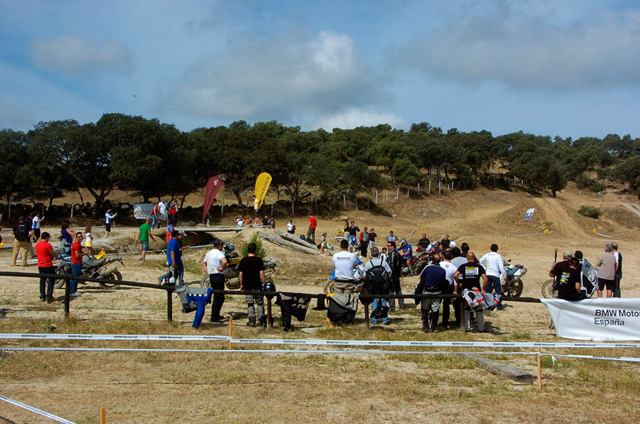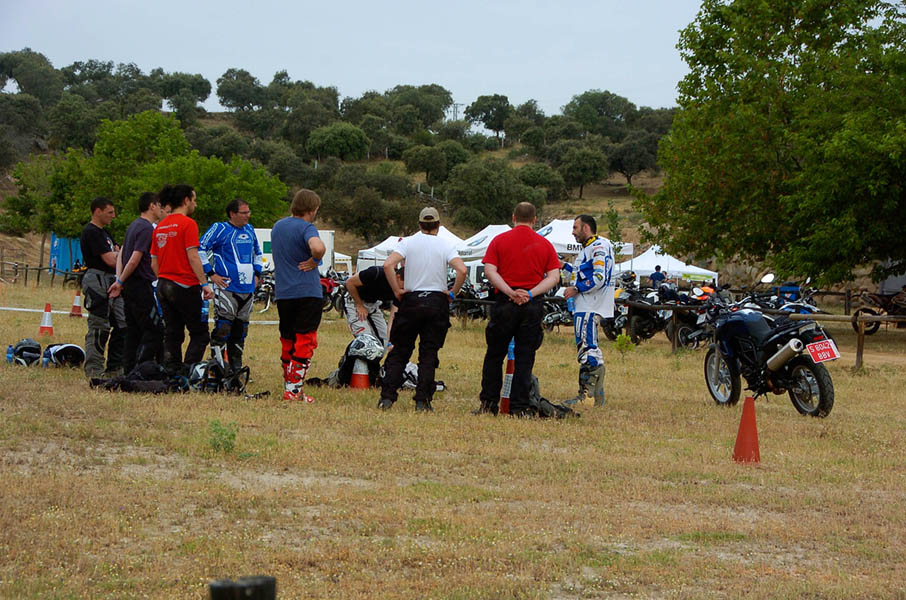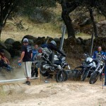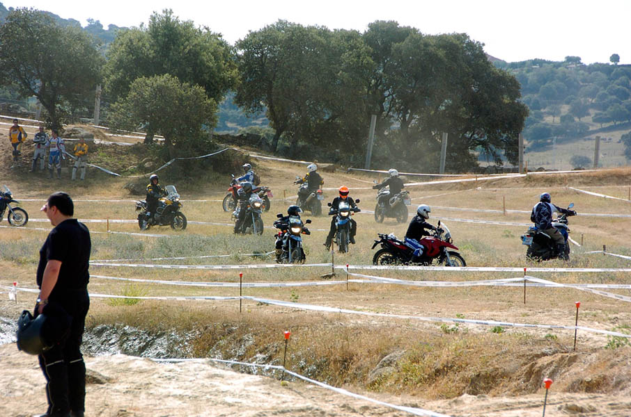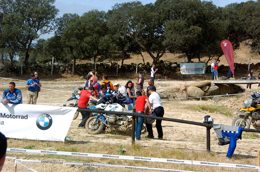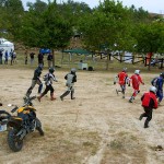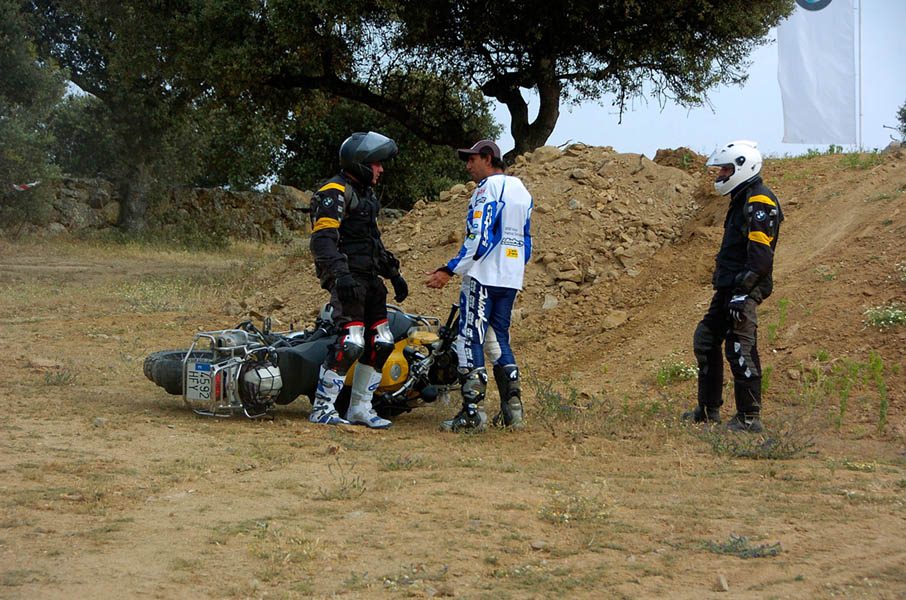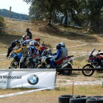 Pasear de un lado a otro del circuito, te permitía compartir momentos de charla con unos y otros, “mezclar” la contemplación de los más hábiles y rápidos pilotos del Desafío GS, con los titubeantes comienzos de muchos de los alumnos de la Escuela GS, que nunca habían pisado tierra con sus motos y, lo que es mejor, comprobar como a lo largo del fin de semana su habilidad y su soltura encima de la moto se multiplicaba por momentos. Ver como caída tras caída, en un medio controlado y con profesores siempre “encima” de los alumnos, se pierde el miedo a afrontar una zona, que en principio pudiera parecer imposible para uno. Disfrutar del trabajo en equipo que los participantes en el Desafío GS también tenían que realizar y como, en muchas ocasiones, el interés individual dejaba paso al “todos a una” como una piña, para trasladar a un “herido” en medio del campo o para sujetar o levantar la moto de un compañero en medio de cualquier trialera…
