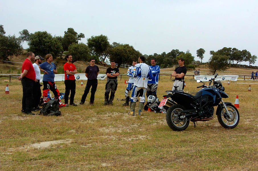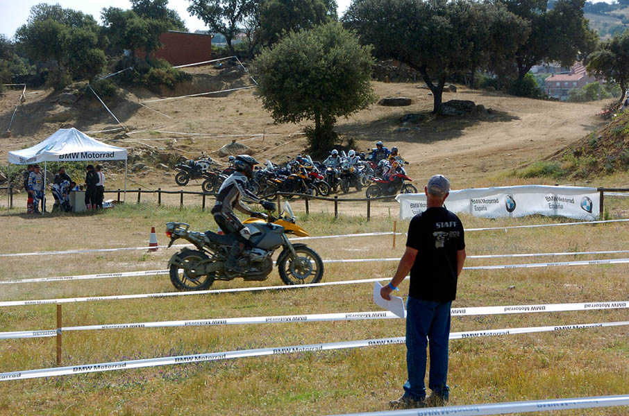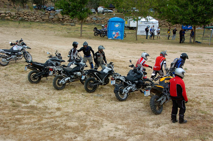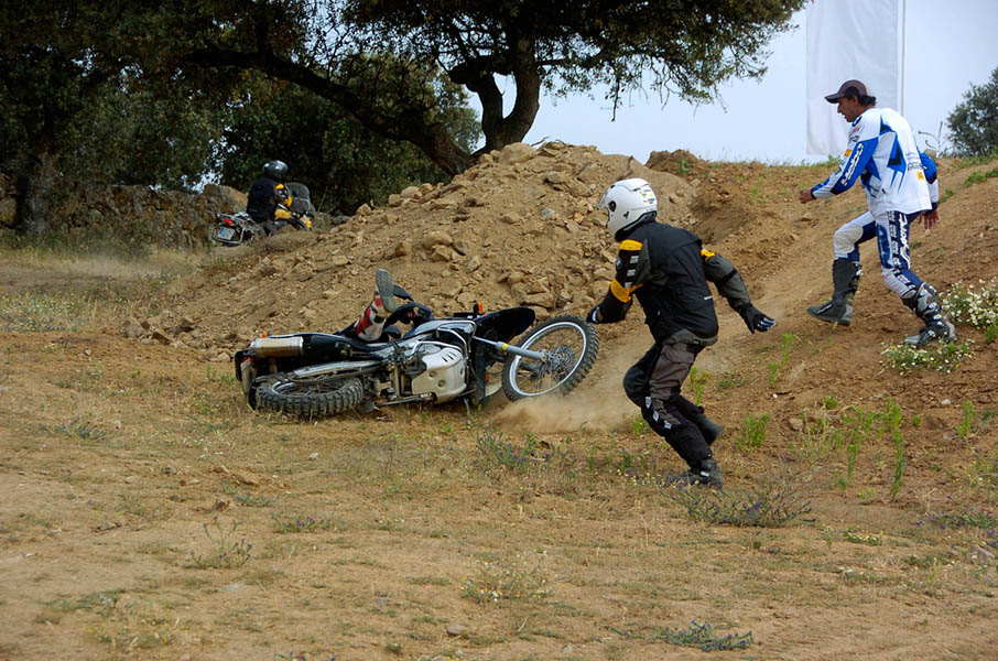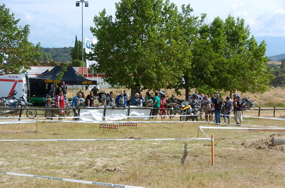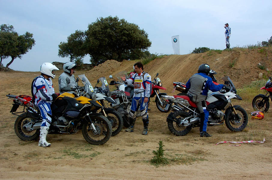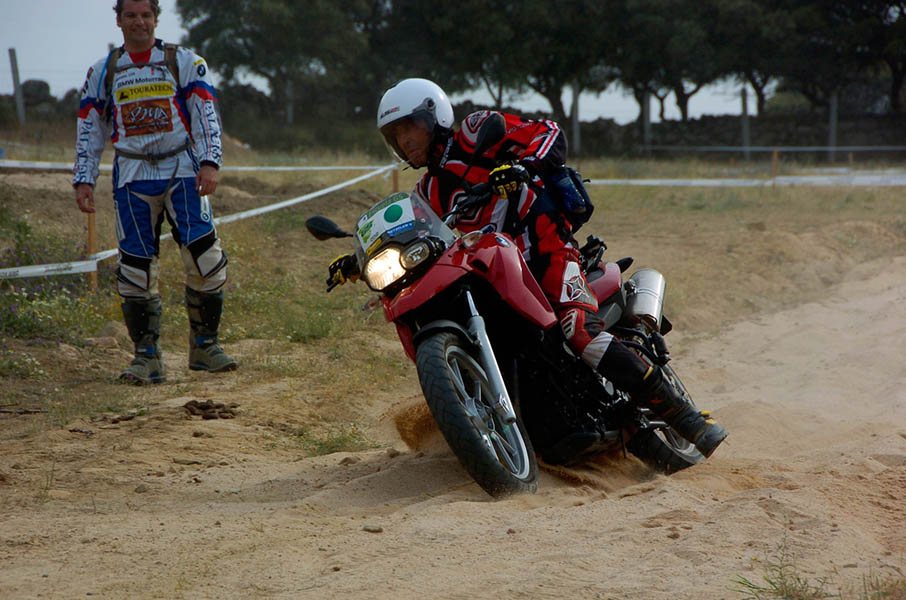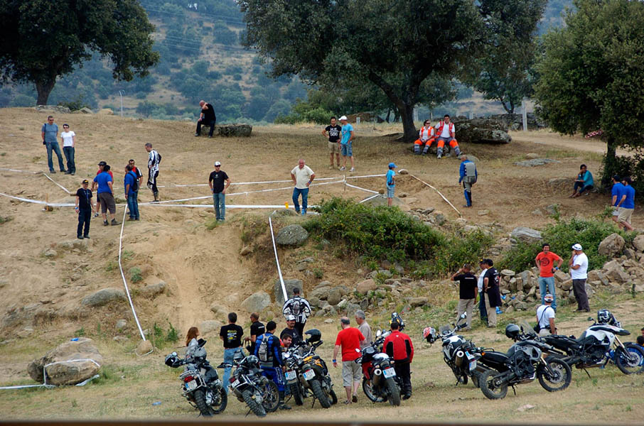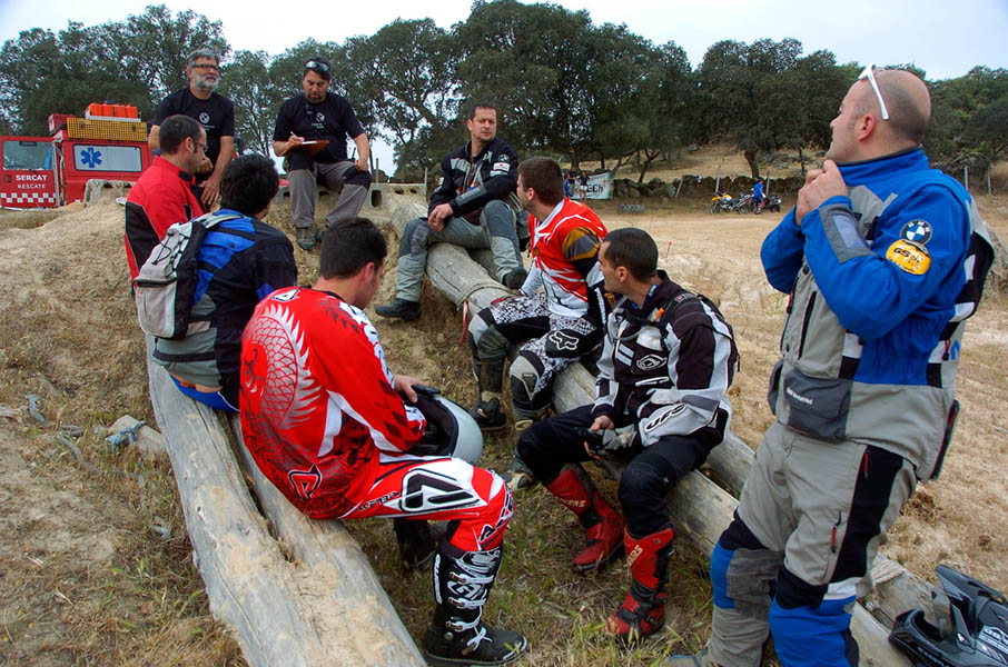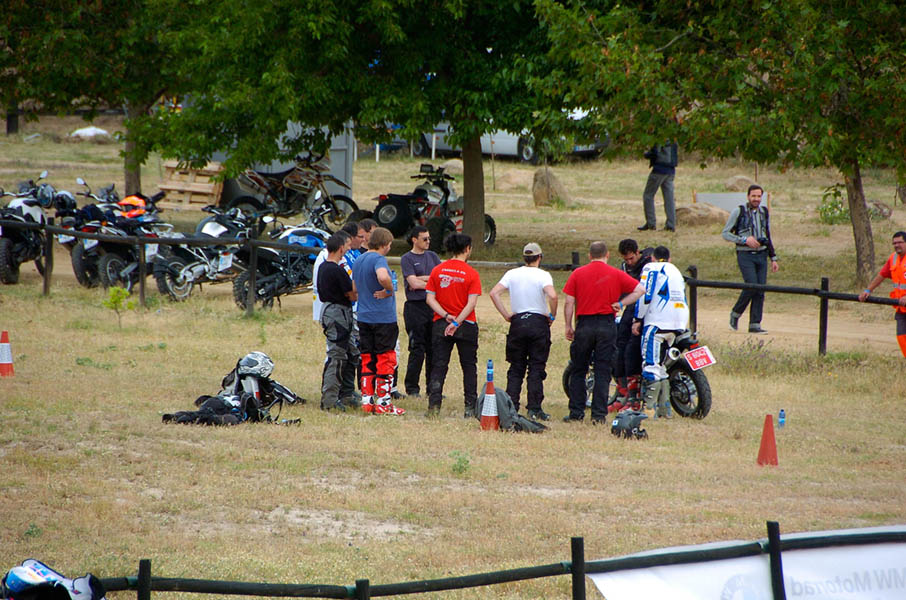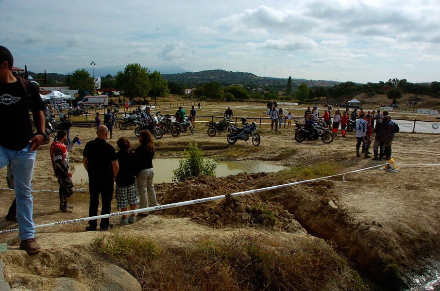 Pasear de un lado a otro del circuito, te permitía compartir momentos de charla con unos y otros, “mezclar” la contemplación de los más hábiles y rápidos pilotos del Desafío GS, con los titubeantes comienzos de muchos de los alumnos de la Escuela GS, que nunca habían pisado tierra con sus motos y, lo que es mejor, comprobar como a lo largo del fin de semana su habilidad y su soltura encima de la moto se multiplicaba por momentos. Ver como caída tras caída, en un medio controlado y con profesores siempre “encima” de los alumnos, se pierde el miedo a afrontar una zona, que en principio pudiera parecer imposible para uno. Disfrutar del trabajo en equipo que los participantes en el Desafío GS también tenían que realizar y como, en muchas ocasiones, el interés individual dejaba paso al “todos a una” como una piña, para trasladar a un “herido” en medio del campo o para sujetar o levantar la moto de un compañero en medio de cualquier trialera…
