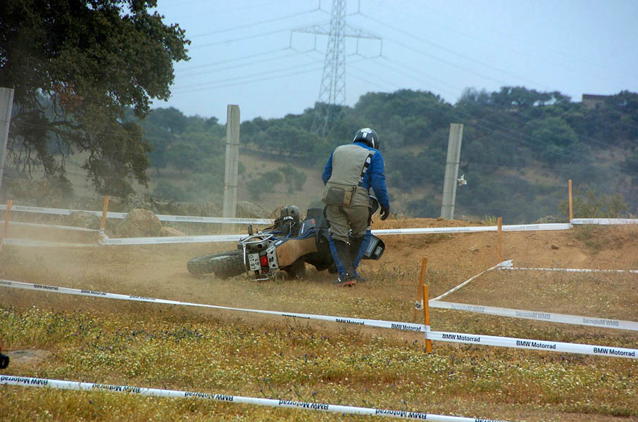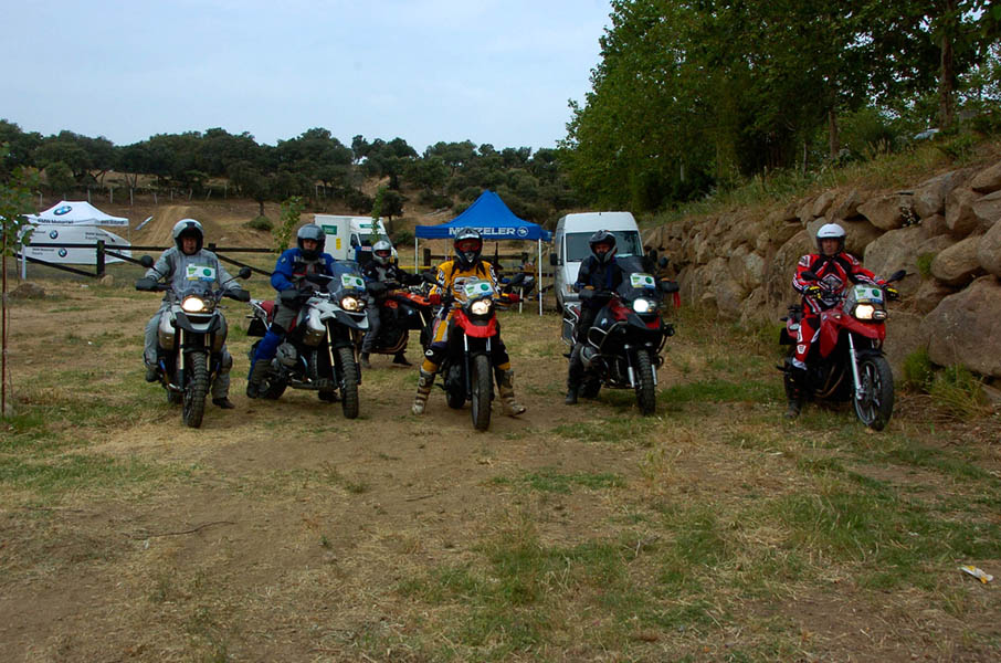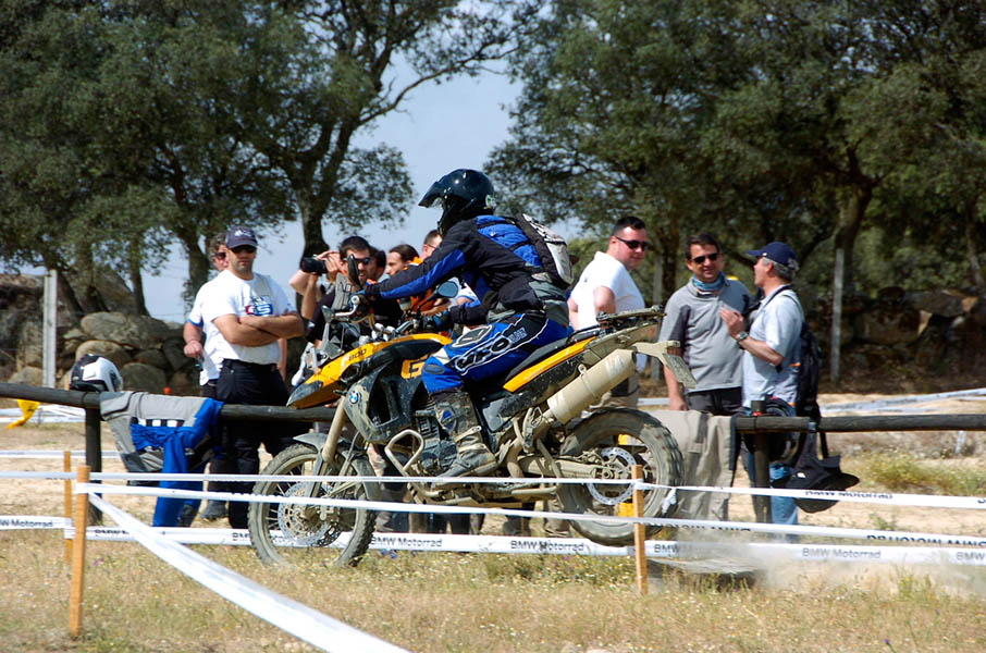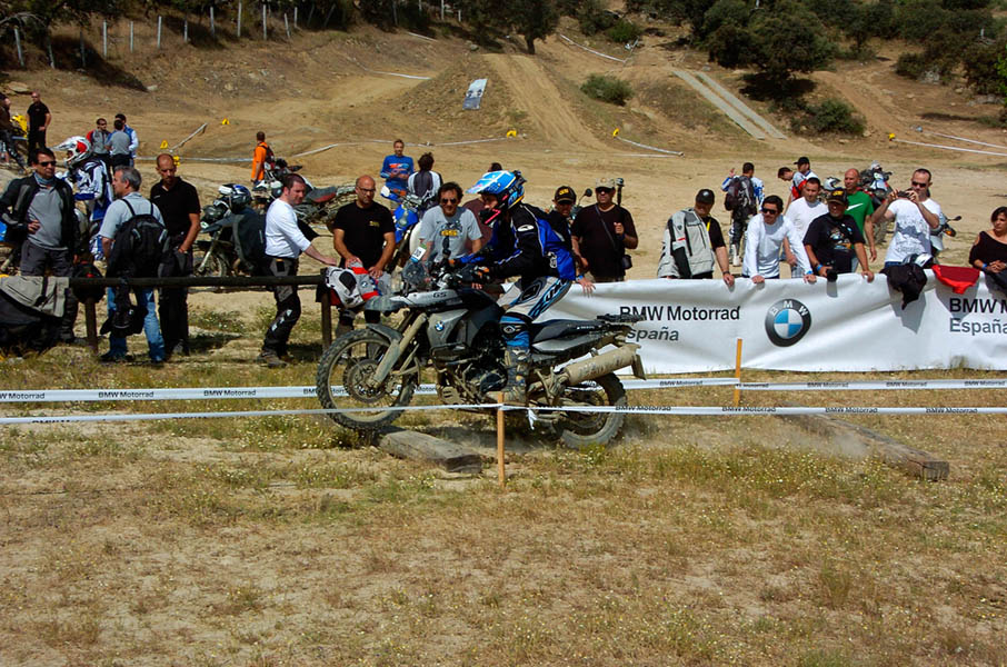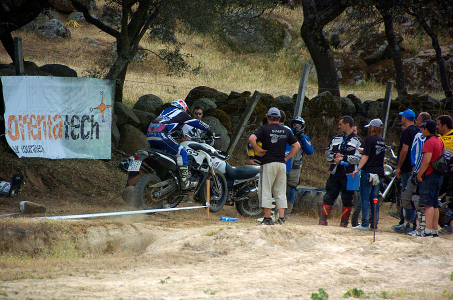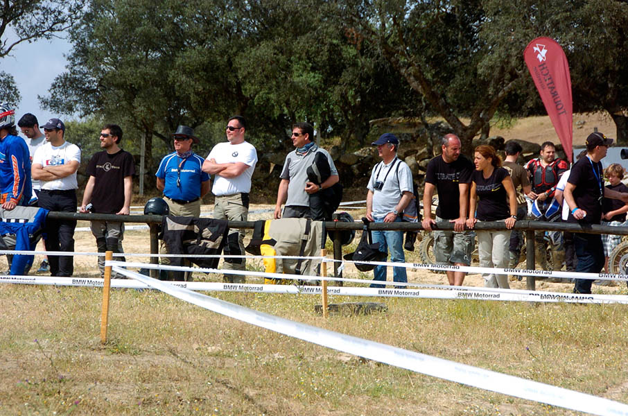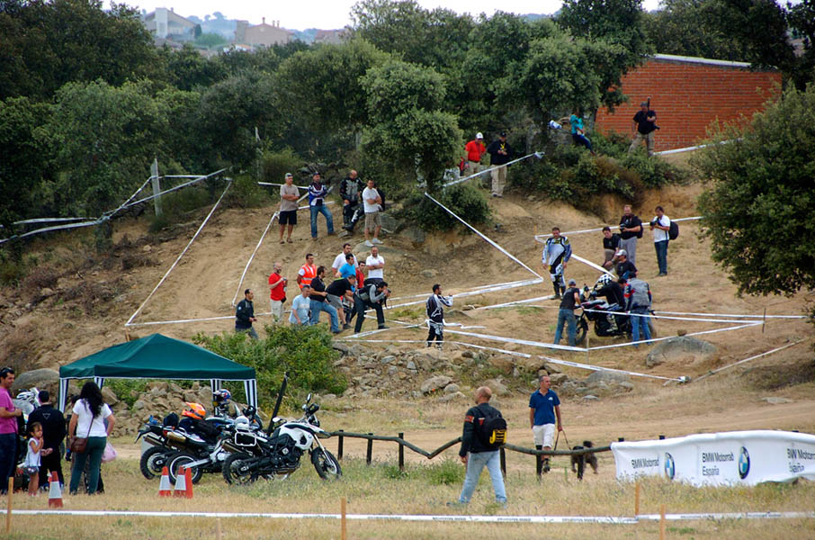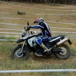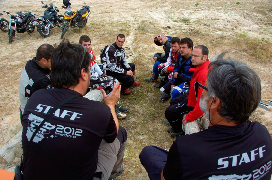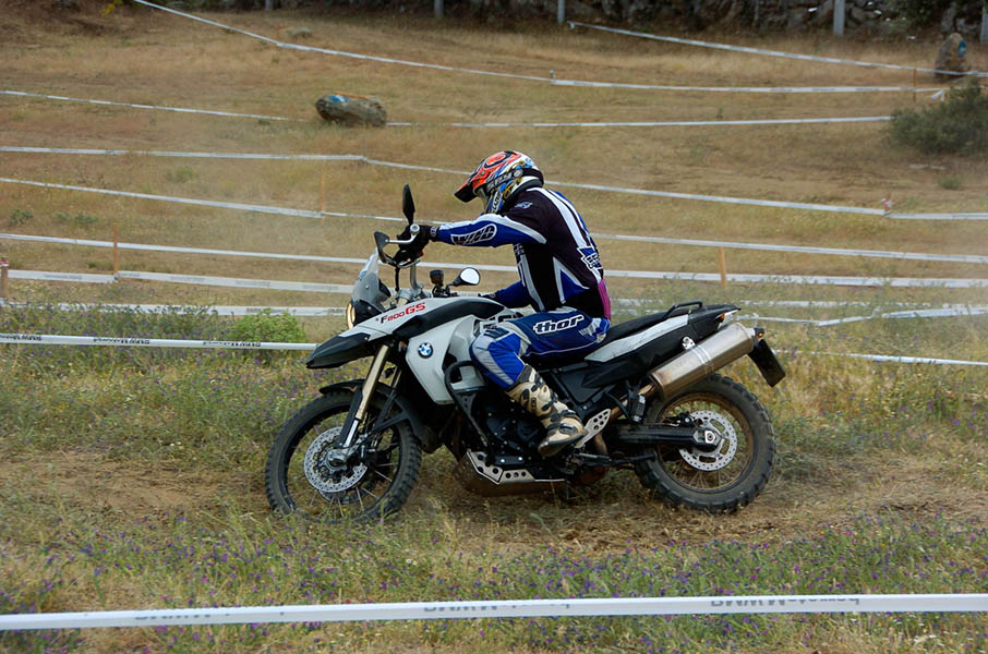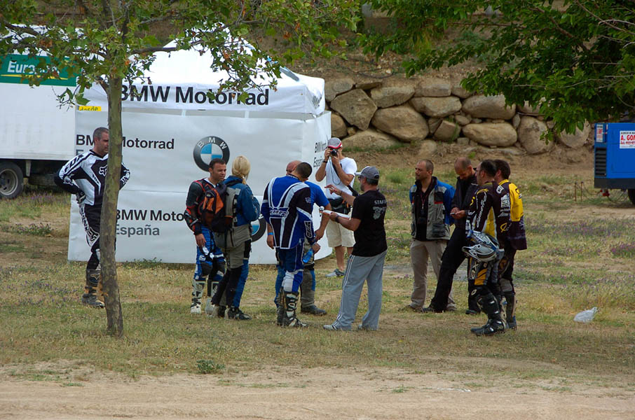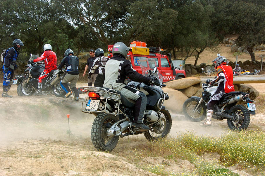 Pasear de un lado a otro del circuito, te permitía compartir momentos de charla con unos y otros, “mezclar” la contemplación de los más hábiles y rápidos pilotos del Desafío GS, con los titubeantes comienzos de muchos de los alumnos de la Escuela GS, que nunca habían pisado tierra con sus motos y, lo que es mejor, comprobar como a lo largo del fin de semana su habilidad y su soltura encima de la moto se multiplicaba por momentos. Ver como caída tras caída, en un medio controlado y con profesores siempre “encima” de los alumnos, se pierde el miedo a afrontar una zona, que en principio pudiera parecer imposible para uno. Disfrutar del trabajo en equipo que los participantes en el Desafío GS también tenían que realizar y como, en muchas ocasiones, el interés individual dejaba paso al “todos a una” como una piña, para trasladar a un “herido” en medio del campo o para sujetar o levantar la moto de un compañero en medio de cualquier trialera…
