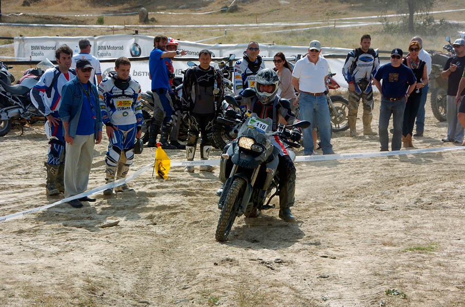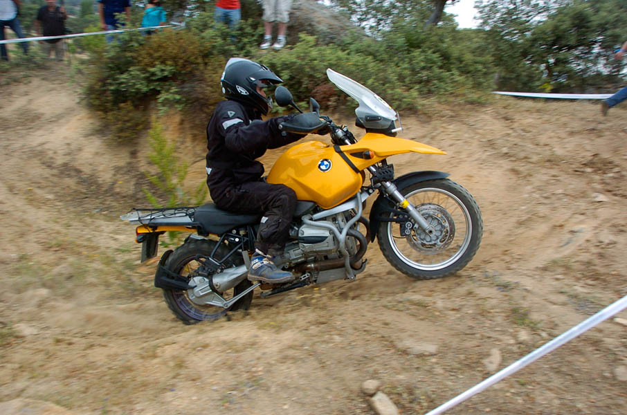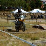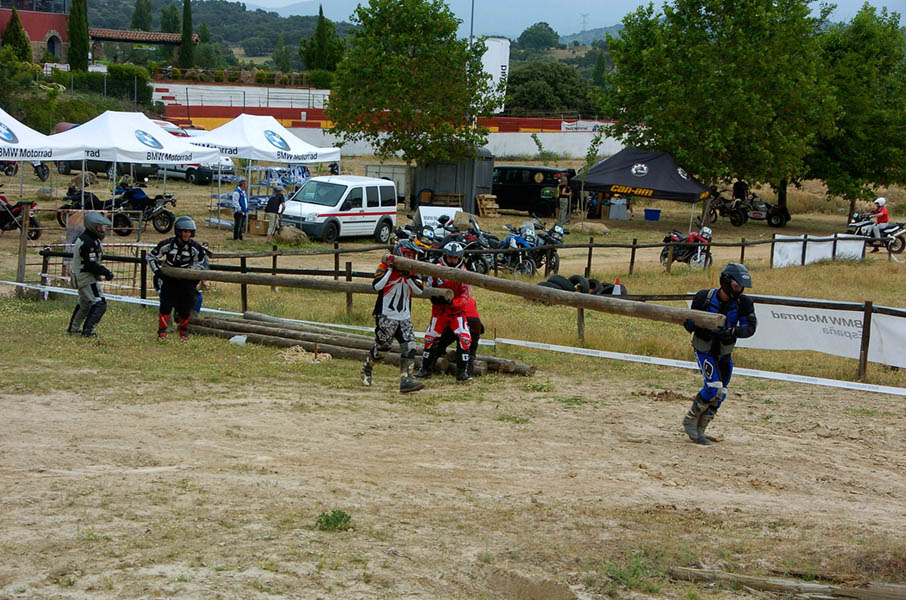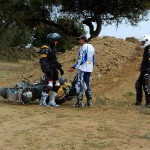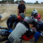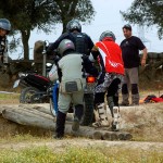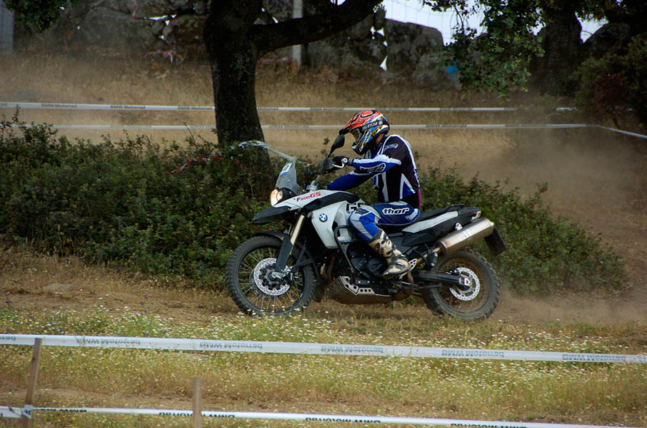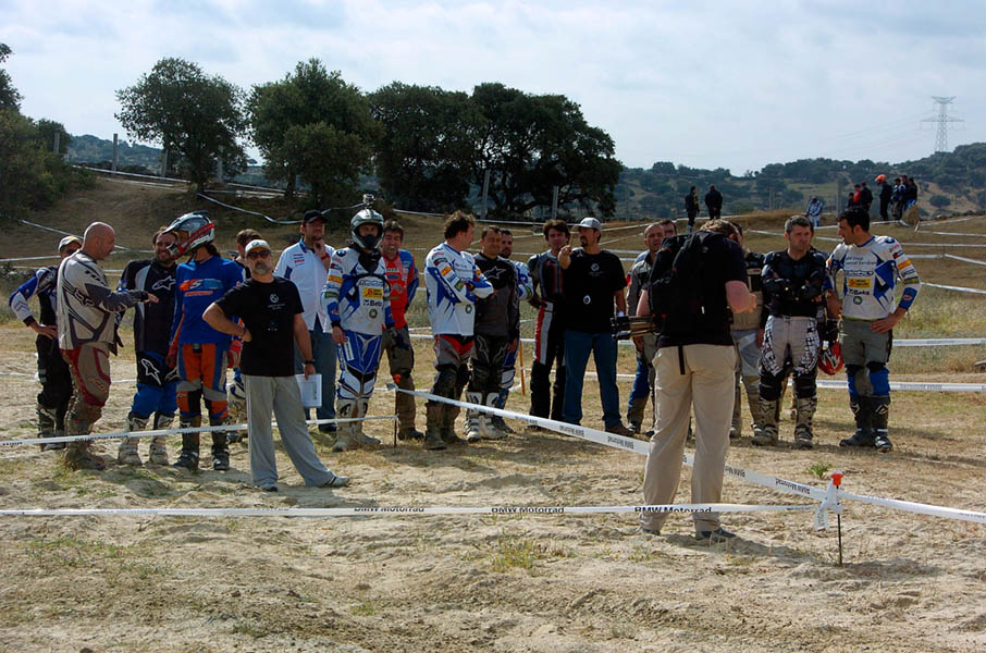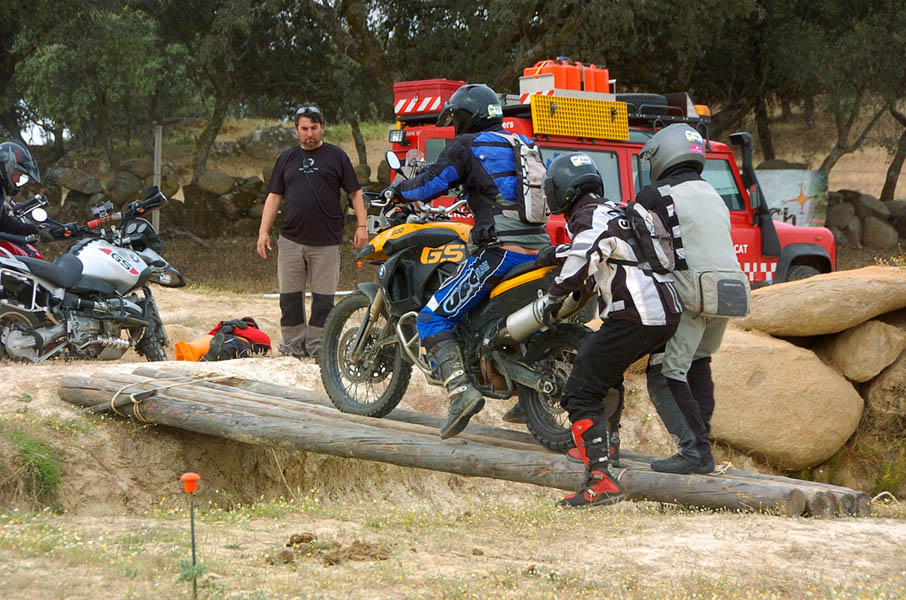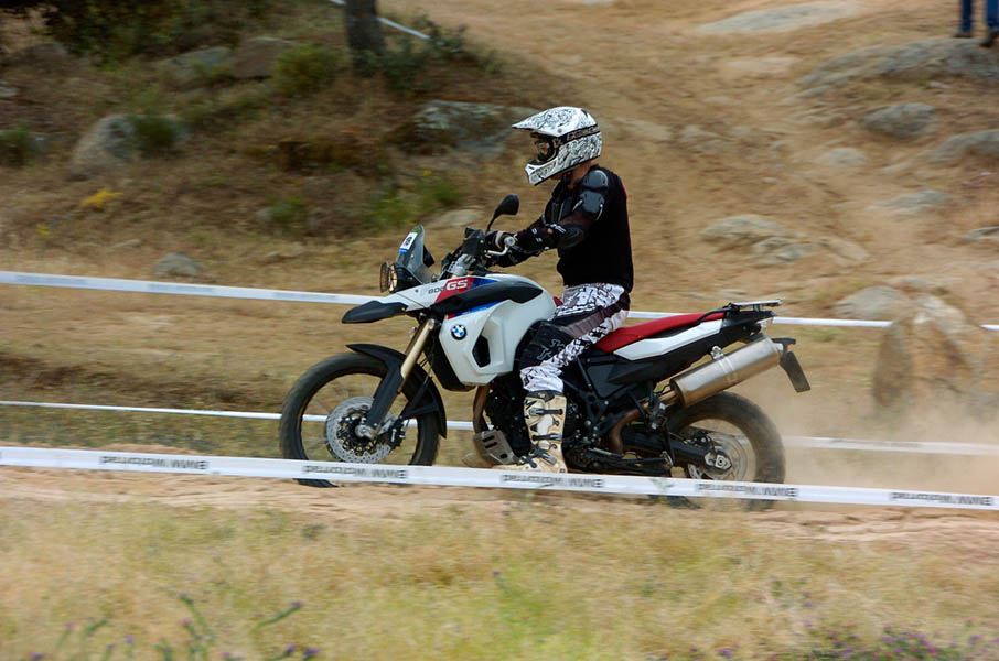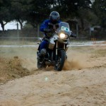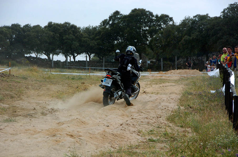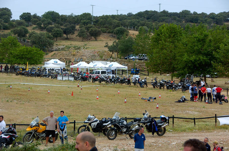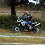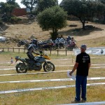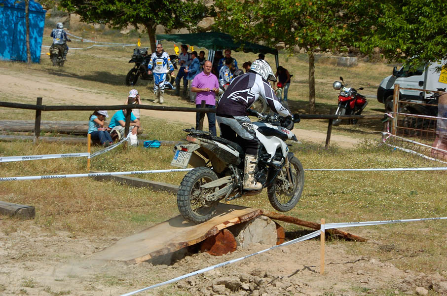 Pasear de un lado a otro del circuito, te permitía compartir momentos de charla con unos y otros, “mezclar” la contemplación de los más hábiles y rápidos pilotos del Desafío GS, con los titubeantes comienzos de muchos de los alumnos de la Escuela GS, que nunca habían pisado tierra con sus motos y, lo que es mejor, comprobar como a lo largo del fin de semana su habilidad y su soltura encima de la moto se multiplicaba por momentos. Ver como caída tras caída, en un medio controlado y con profesores siempre “encima” de los alumnos, se pierde el miedo a afrontar una zona, que en principio pudiera parecer imposible para uno. Disfrutar del trabajo en equipo que los participantes en el Desafío GS también tenían que realizar y como, en muchas ocasiones, el interés individual dejaba paso al “todos a una” como una piña, para trasladar a un “herido” en medio del campo o para sujetar o levantar la moto de un compañero en medio de cualquier trialera…