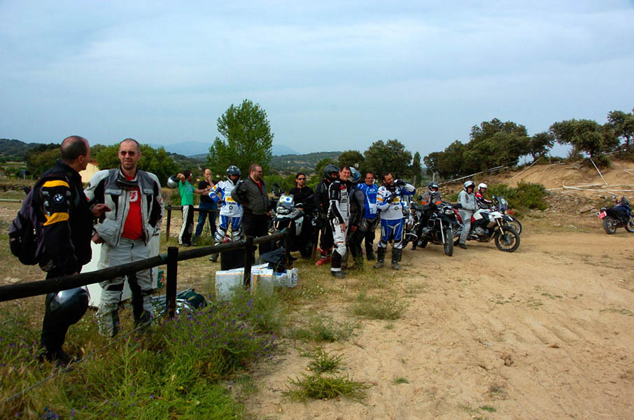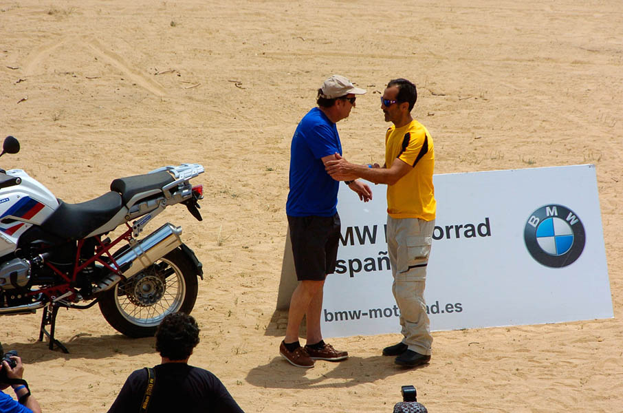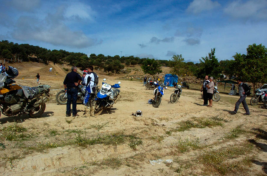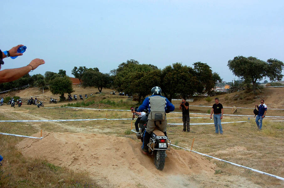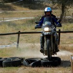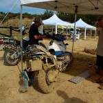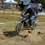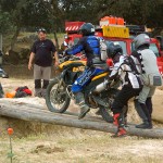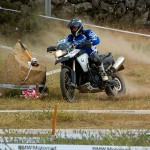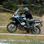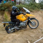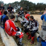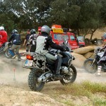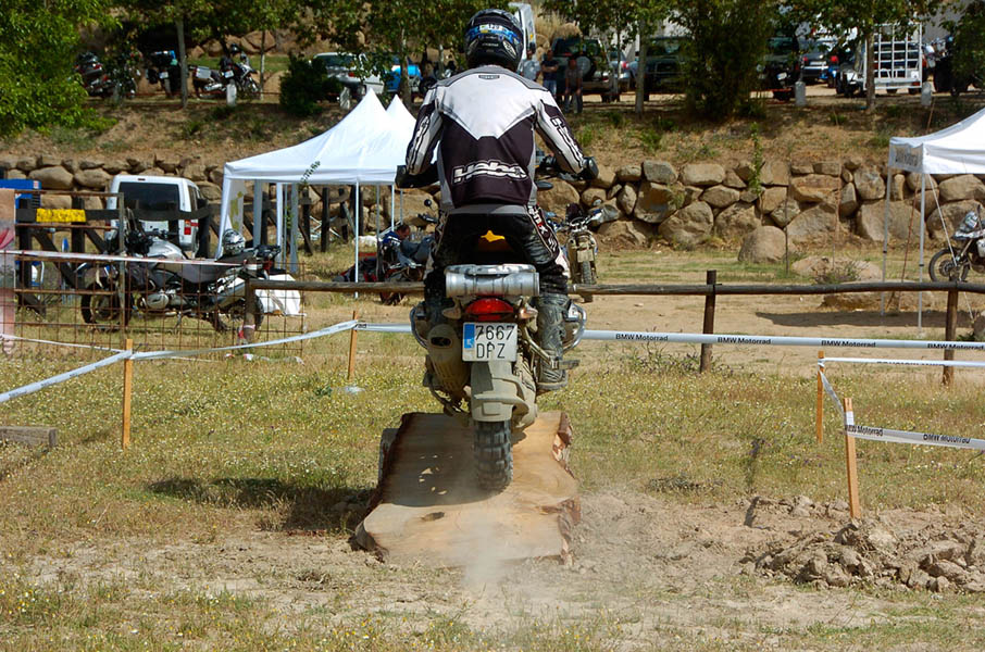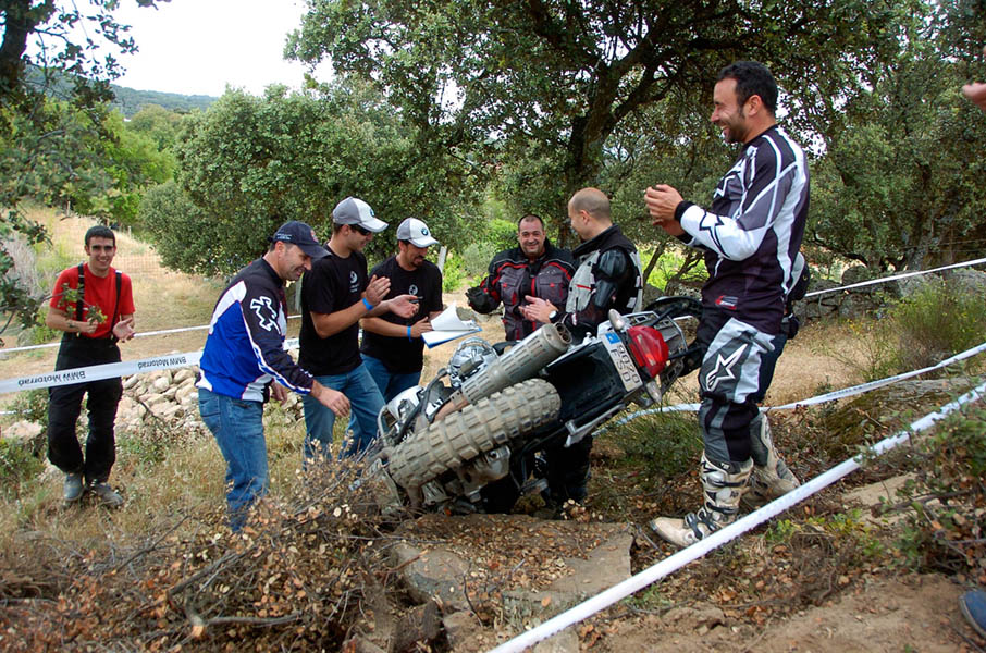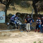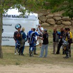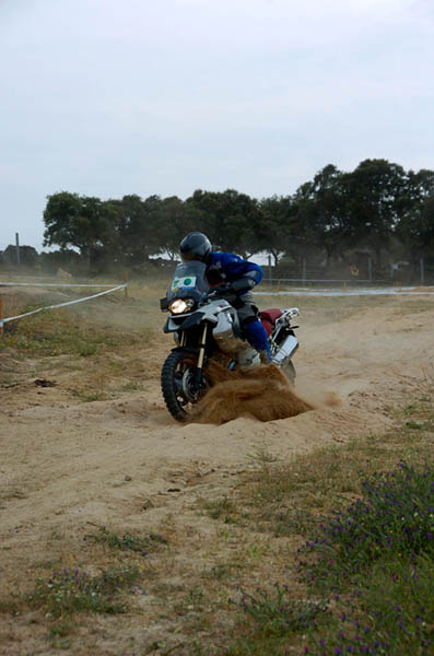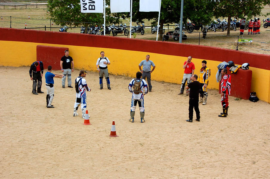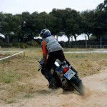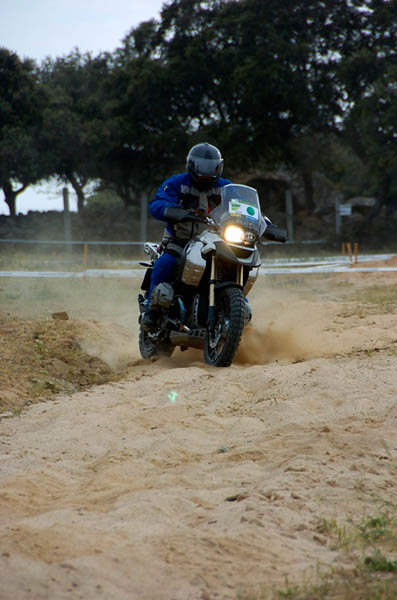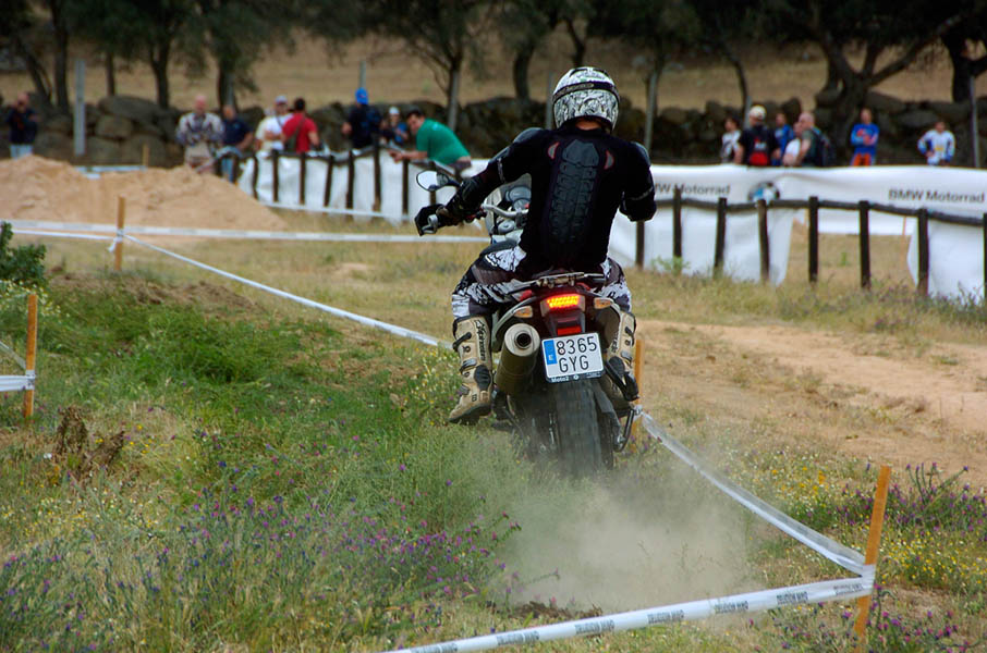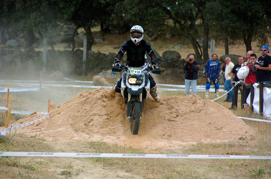 Pasear de un lado a otro del circuito, te permitía compartir momentos de charla con unos y otros, “mezclar” la contemplación de los más hábiles y rápidos pilotos del Desafío GS, con los titubeantes comienzos de muchos de los alumnos de la Escuela GS, que nunca habían pisado tierra con sus motos y, lo que es mejor, comprobar como a lo largo del fin de semana su habilidad y su soltura encima de la moto se multiplicaba por momentos. Ver como caída tras caída, en un medio controlado y con profesores siempre “encima” de los alumnos, se pierde el miedo a afrontar una zona, que en principio pudiera parecer imposible para uno. Disfrutar del trabajo en equipo que los participantes en el Desafío GS también tenían que realizar y como, en muchas ocasiones, el interés individual dejaba paso al “todos a una” como una piña, para trasladar a un “herido” en medio del campo o para sujetar o levantar la moto de un compañero en medio de cualquier trialera…