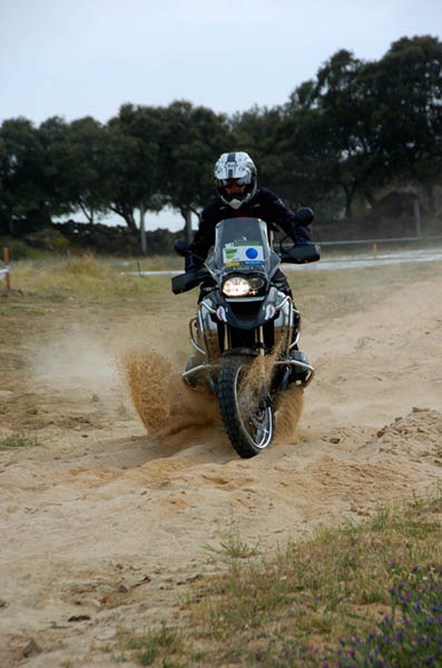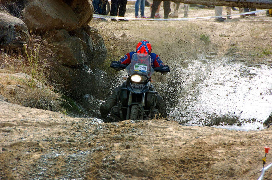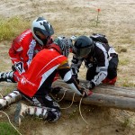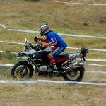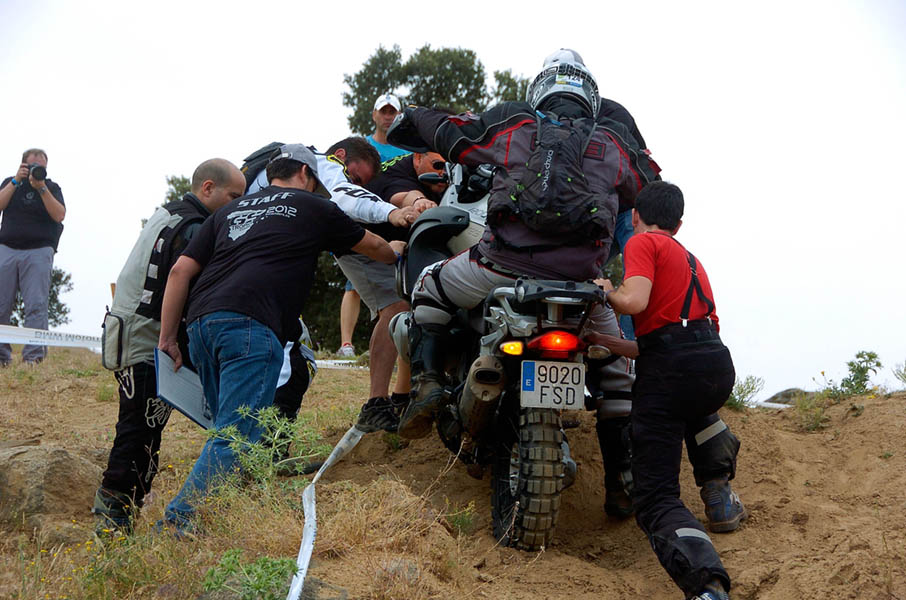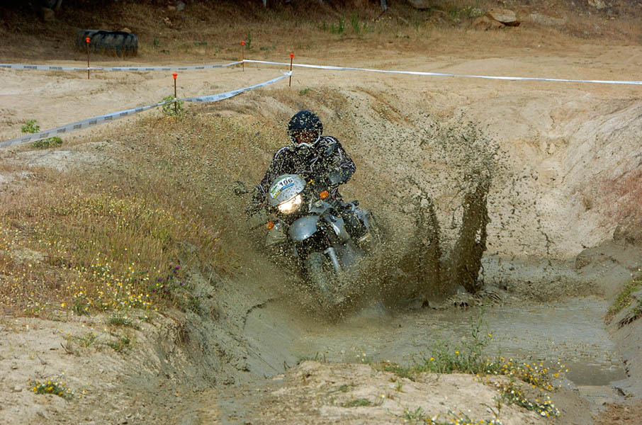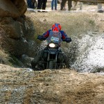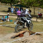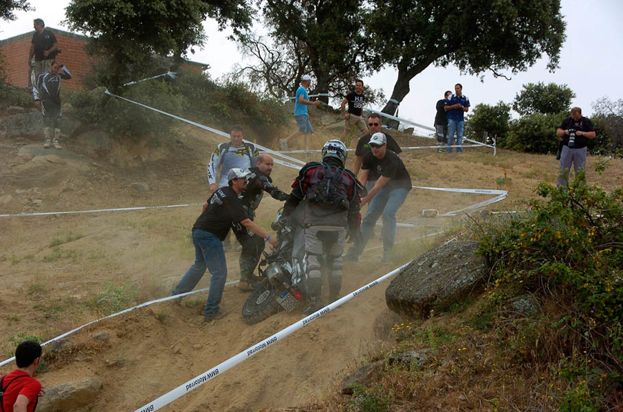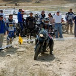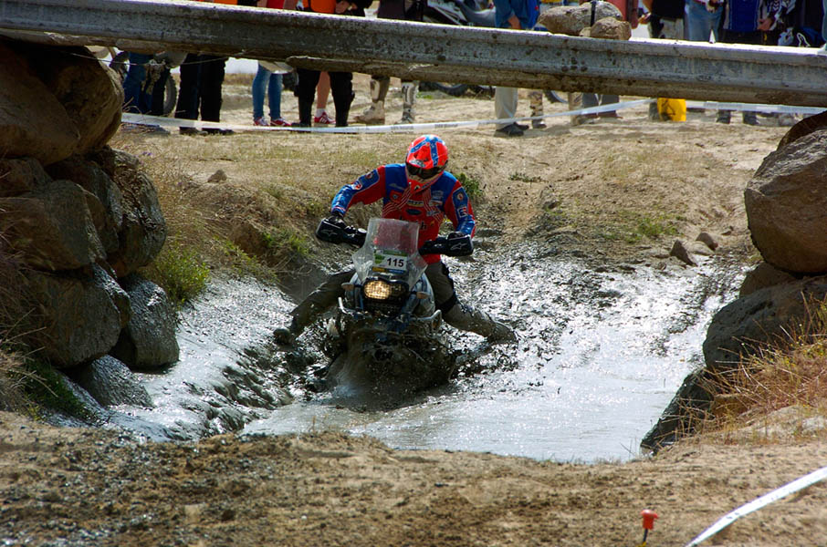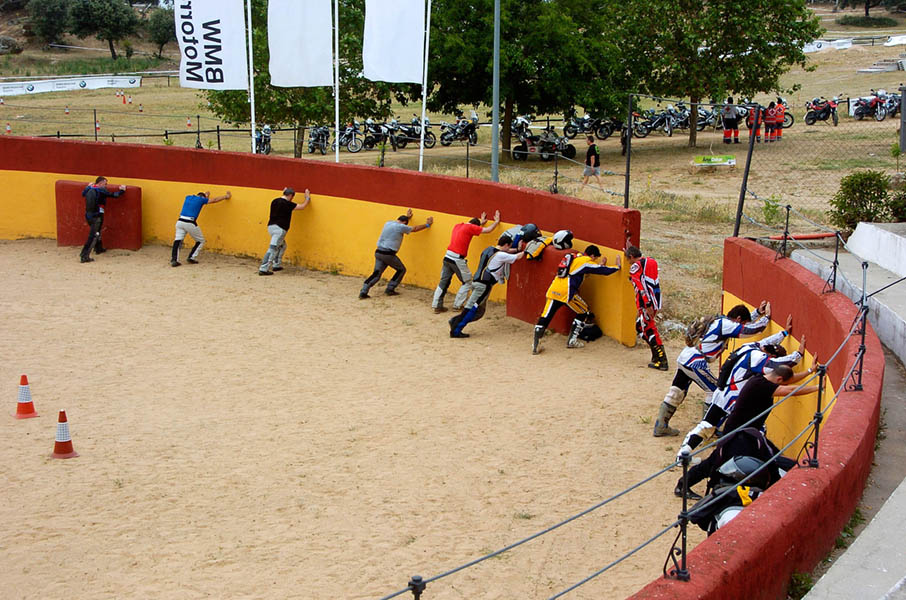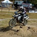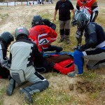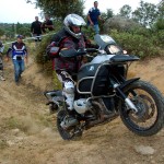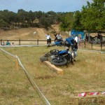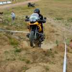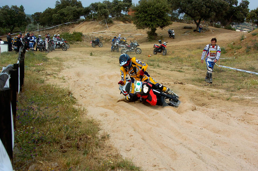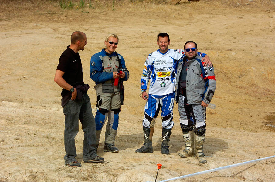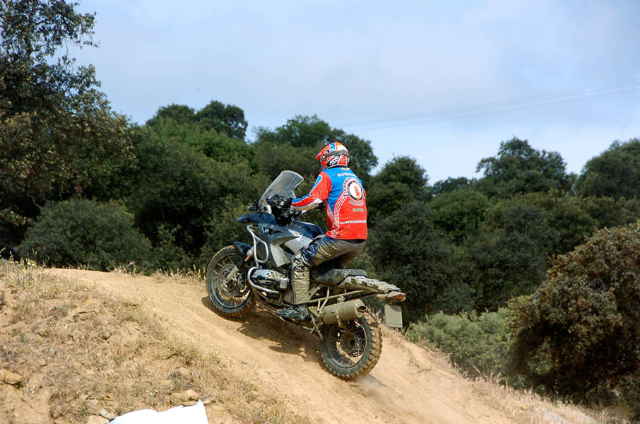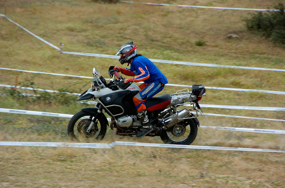 Pasear de un lado a otro del circuito, te permitía compartir momentos de charla con unos y otros, “mezclar” la contemplación de los más hábiles y rápidos pilotos del Desafío GS, con los titubeantes comienzos de muchos de los alumnos de la Escuela GS, que nunca habían pisado tierra con sus motos y, lo que es mejor, comprobar como a lo largo del fin de semana su habilidad y su soltura encima de la moto se multiplicaba por momentos. Ver como caída tras caída, en un medio controlado y con profesores siempre “encima” de los alumnos, se pierde el miedo a afrontar una zona, que en principio pudiera parecer imposible para uno. Disfrutar del trabajo en equipo que los participantes en el Desafío GS también tenían que realizar y como, en muchas ocasiones, el interés individual dejaba paso al “todos a una” como una piña, para trasladar a un “herido” en medio del campo o para sujetar o levantar la moto de un compañero en medio de cualquier trialera…