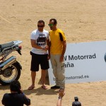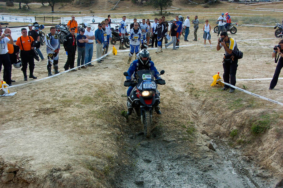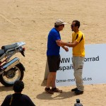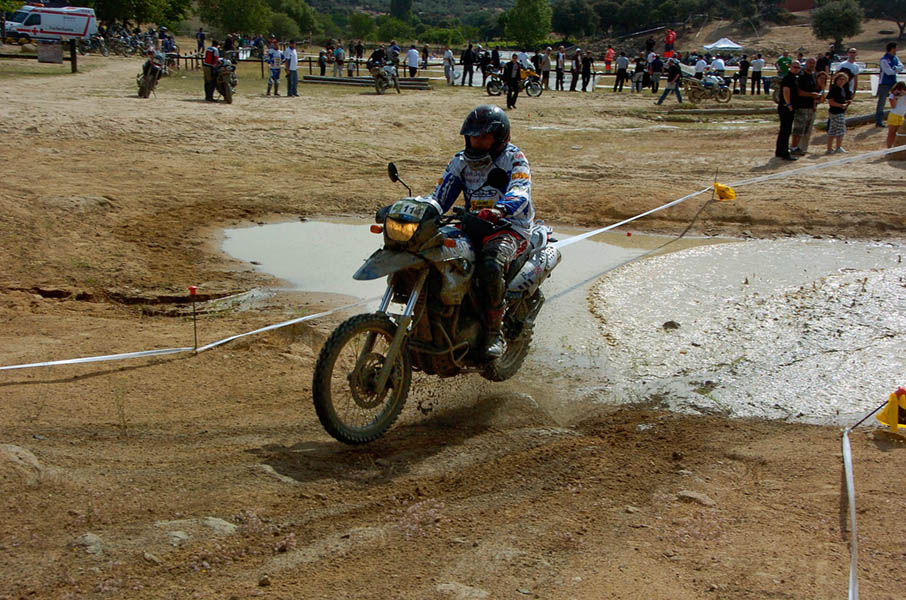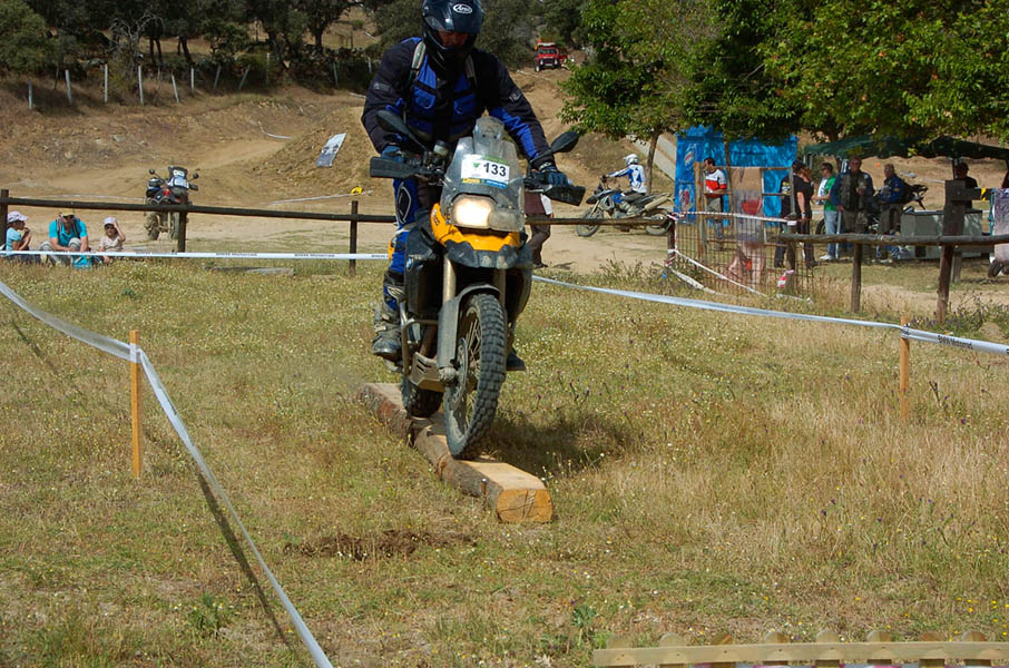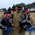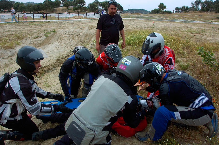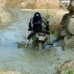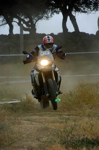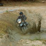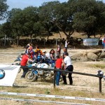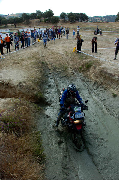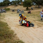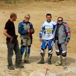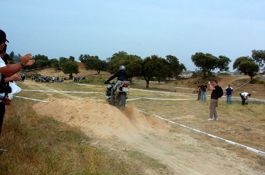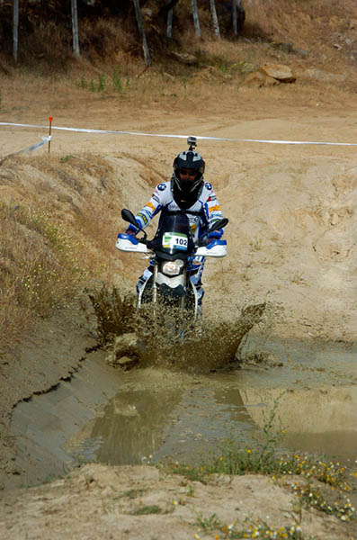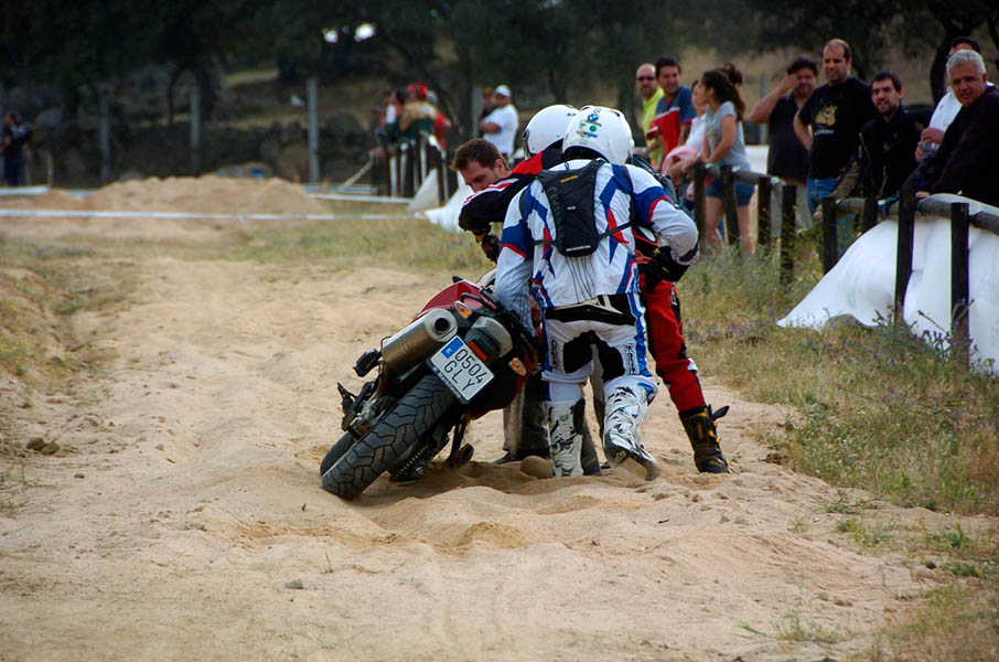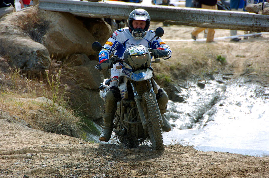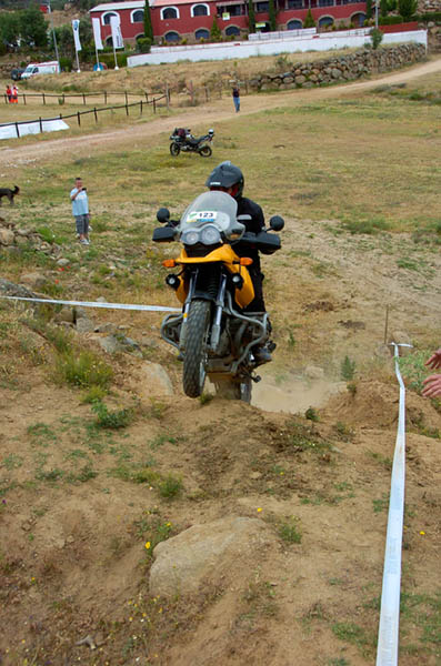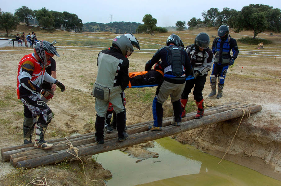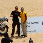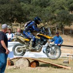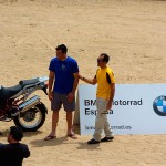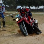 Pasear de un lado a otro del circuito, te permitía compartir momentos de charla con unos y otros, “mezclar” la contemplación de los más hábiles y rápidos pilotos del Desafío GS, con los titubeantes comienzos de muchos de los alumnos de la Escuela GS, que nunca habían pisado tierra con sus motos y, lo que es mejor, comprobar como a lo largo del fin de semana su habilidad y su soltura encima de la moto se multiplicaba por momentos. Ver como caída tras caída, en un medio controlado y con profesores siempre “encima” de los alumnos, se pierde el miedo a afrontar una zona, que en principio pudiera parecer imposible para uno. Disfrutar del trabajo en equipo que los participantes en el Desafío GS también tenían que realizar y como, en muchas ocasiones, el interés individual dejaba paso al “todos a una” como una piña, para trasladar a un “herido” en medio del campo o para sujetar o levantar la moto de un compañero en medio de cualquier trialera…