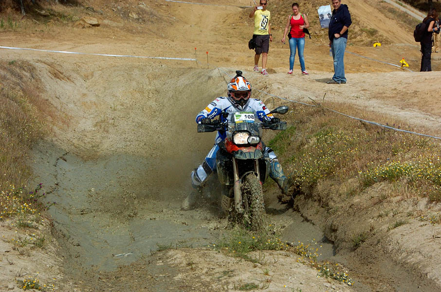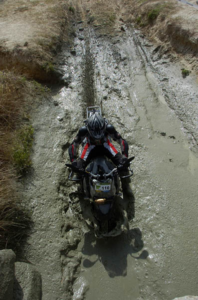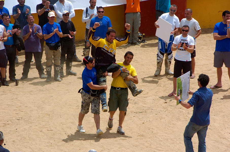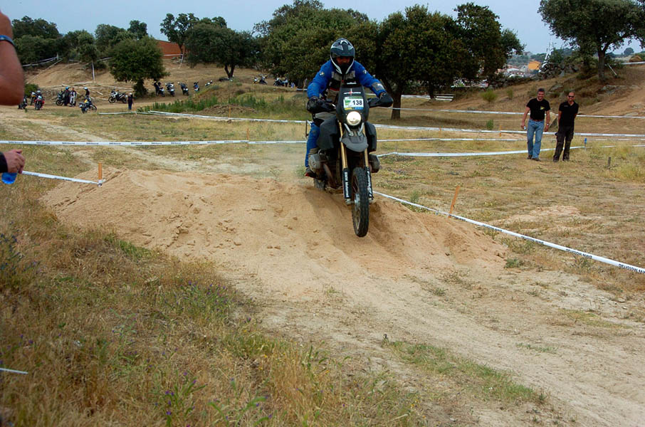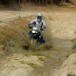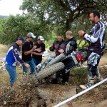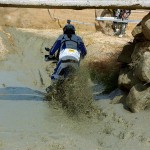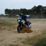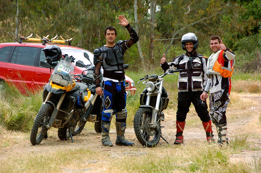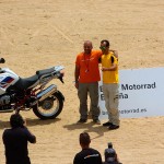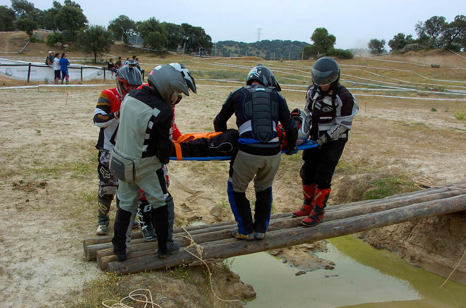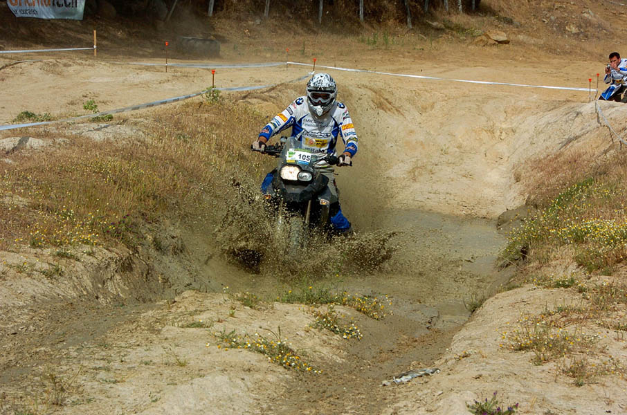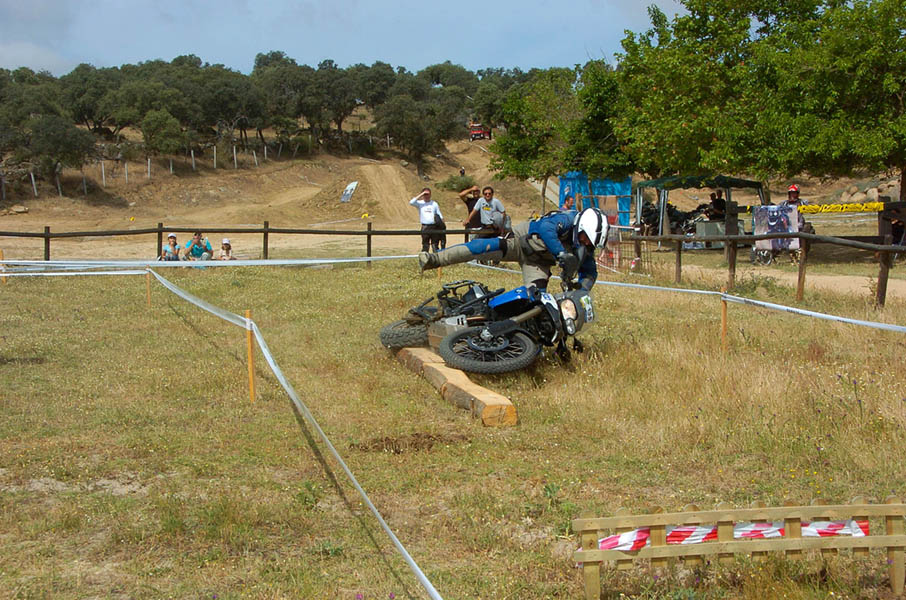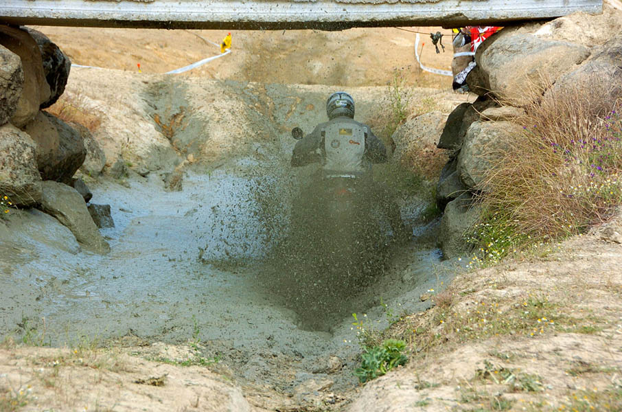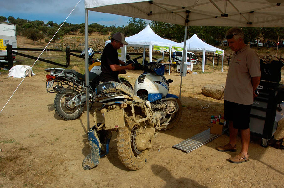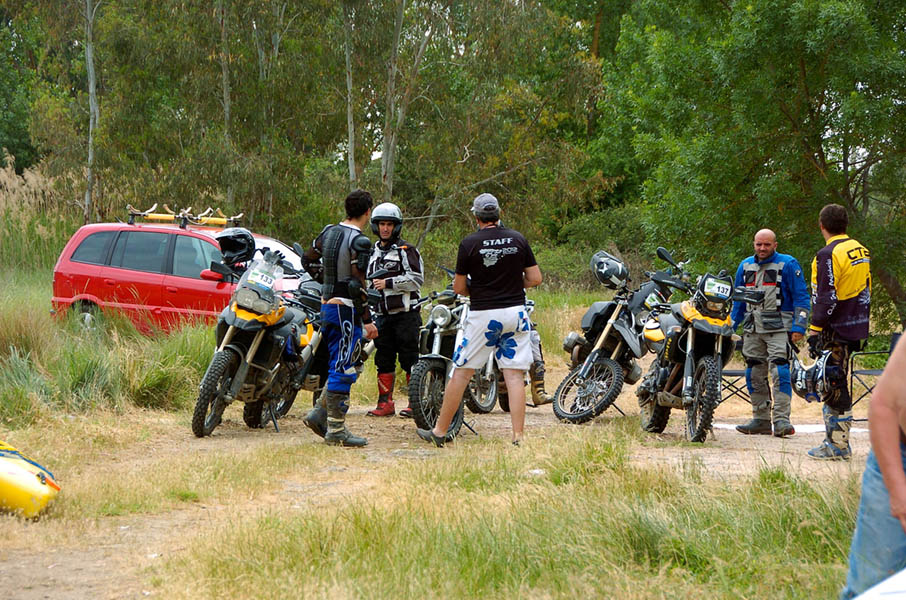 Pasear de un lado a otro del circuito, te permitía compartir momentos de charla con unos y otros, “mezclar” la contemplación de los más hábiles y rápidos pilotos del Desafío GS, con los titubeantes comienzos de muchos de los alumnos de la Escuela GS, que nunca habían pisado tierra con sus motos y, lo que es mejor, comprobar como a lo largo del fin de semana su habilidad y su soltura encima de la moto se multiplicaba por momentos. Ver como caída tras caída, en un medio controlado y con profesores siempre “encima” de los alumnos, se pierde el miedo a afrontar una zona, que en principio pudiera parecer imposible para uno. Disfrutar del trabajo en equipo que los participantes en el Desafío GS también tenían que realizar y como, en muchas ocasiones, el interés individual dejaba paso al “todos a una” como una piña, para trasladar a un “herido” en medio del campo o para sujetar o levantar la moto de un compañero en medio de cualquier trialera…