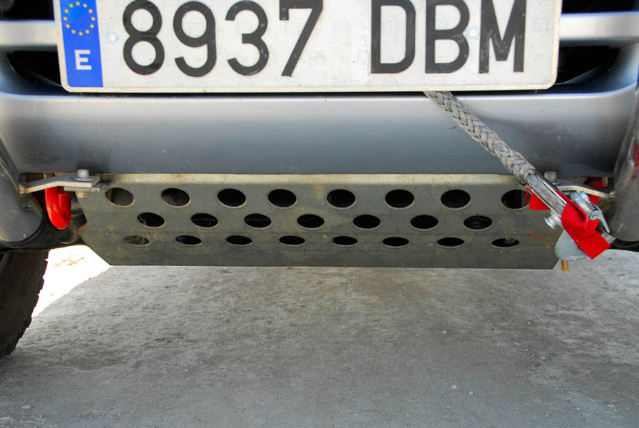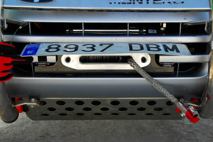 La última instalación en la parte externa del coche ha sido un cabrestante de 12.000 Lbs. con cable de plasma, guía fija y totalmente oculto detrás del paragolpes original, con mando inalámbrico y, oculta tras el paragolpes delantero, la caja de relés con su toma de mando por cable, además, el desconectador de batería del cabrestante, va instalado en el interior del habitáculo, bajo el volante.