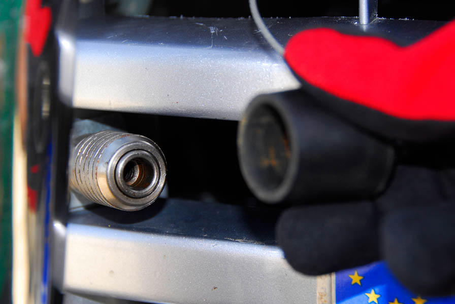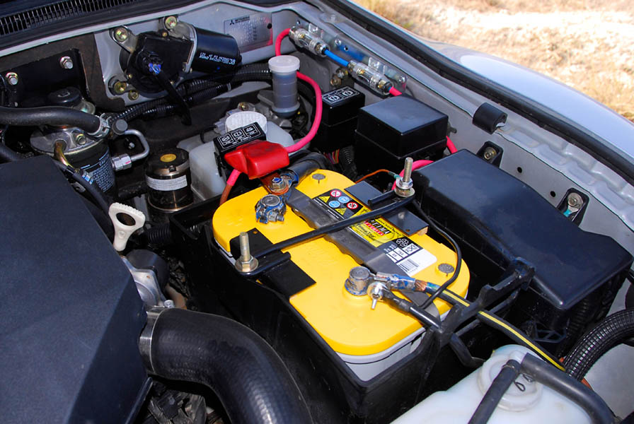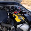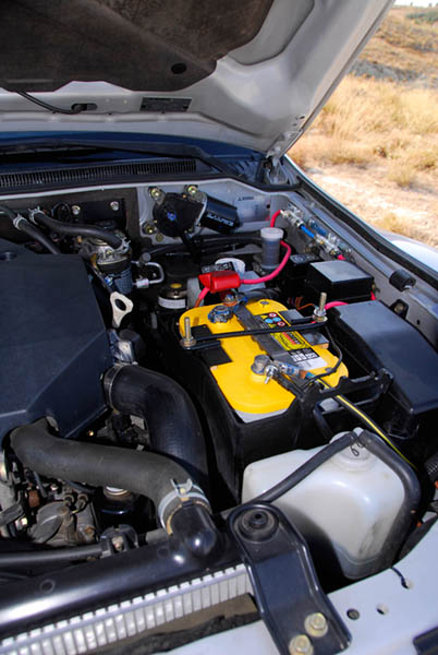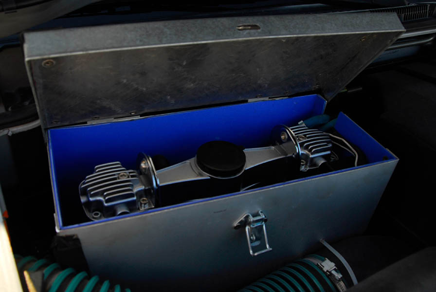 En el interior del vano motor, y dentro de una caja instalada en el lugar reservado para la segunda batería, se ha montado un compresor de doble pistón, con doble salida de aire, una ubicada en el paragolpes delantero y otra junto al tapón de llenado del combustible, también podemos ver una batería Optima Yellow Top.