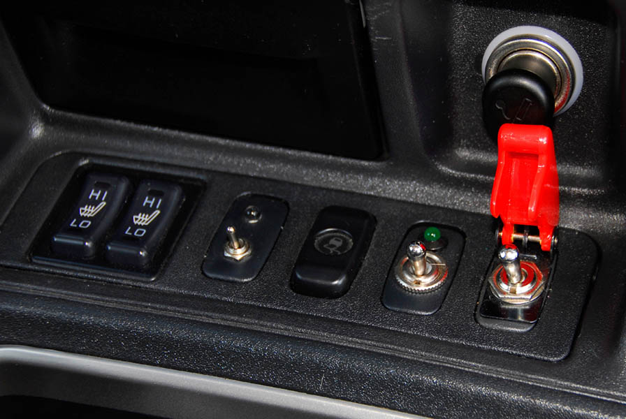 En el interior del habitáculo, al igual que en el exterior, no vemos ninguna “estridencia”, y solo se han añadido los controles necesarios para que las cosas funciones mejor en campo, así, junto a los botones de los asientos calefactables, hay instalada una nueva botonera que, de izquierda a derecha controla el desconectador del ABS, el del control de tracción, los faros largo alcance y el compresor.