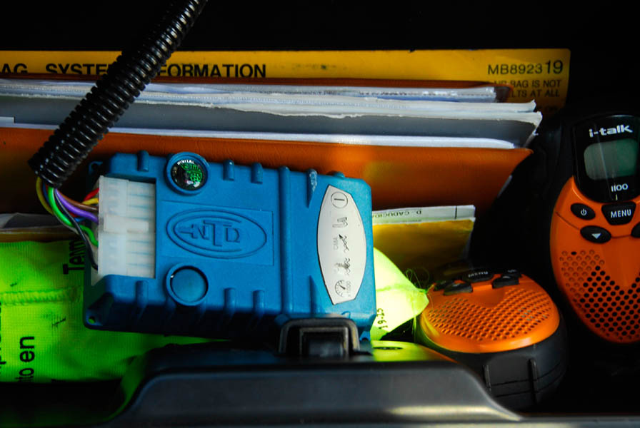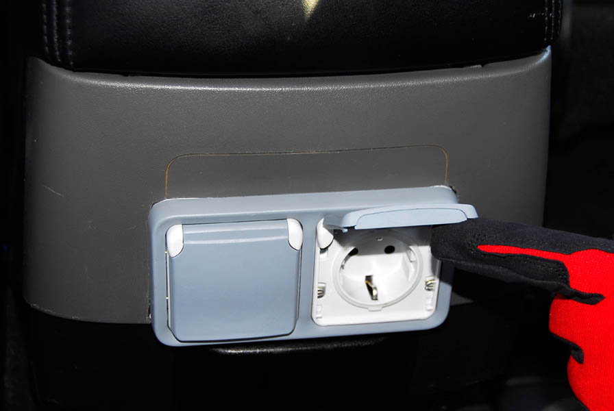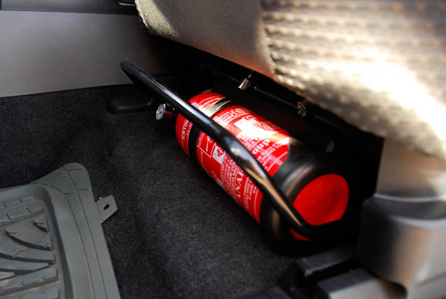 Bajo el asiento del conductor lleva instalado un extintor y un inversor de corriente de 1200 W de pico con dos tomas de corriente instaladas en la parte posterior del apoyabrazos delantero.