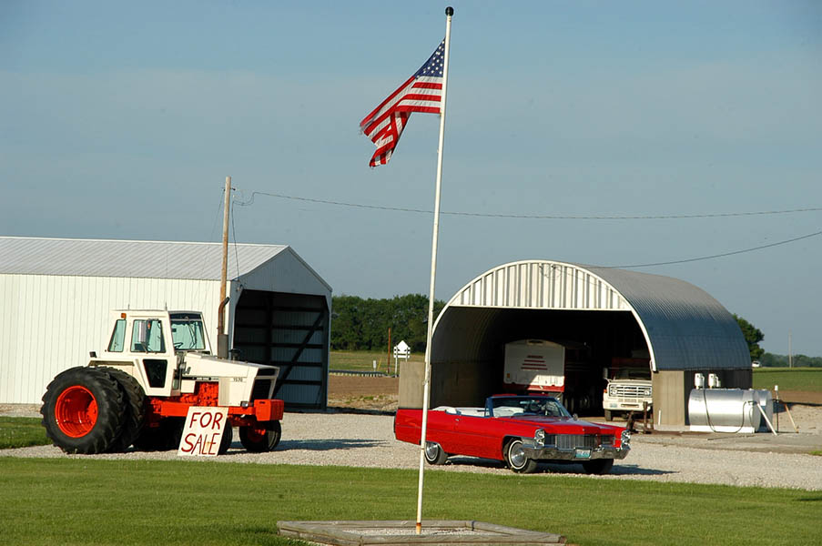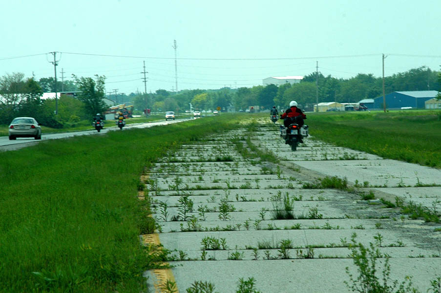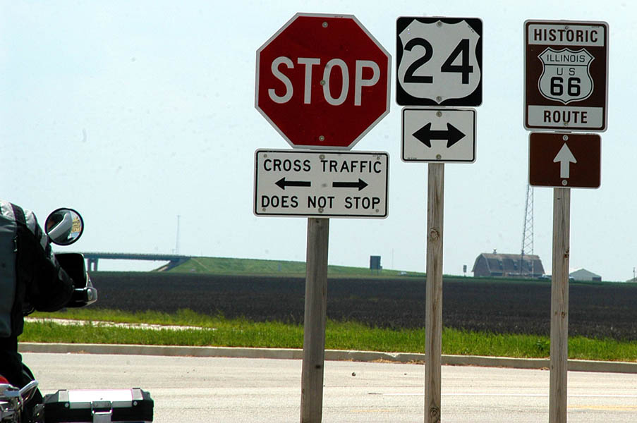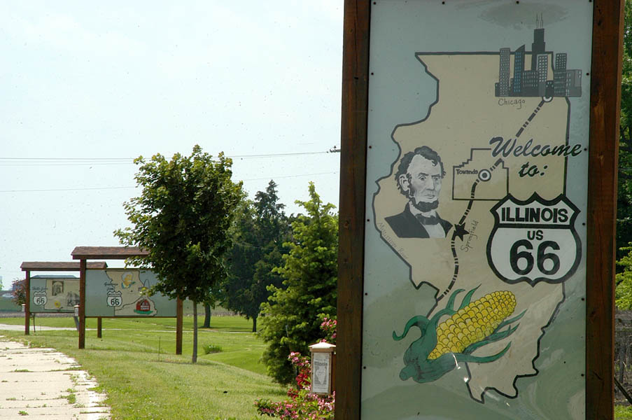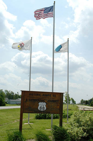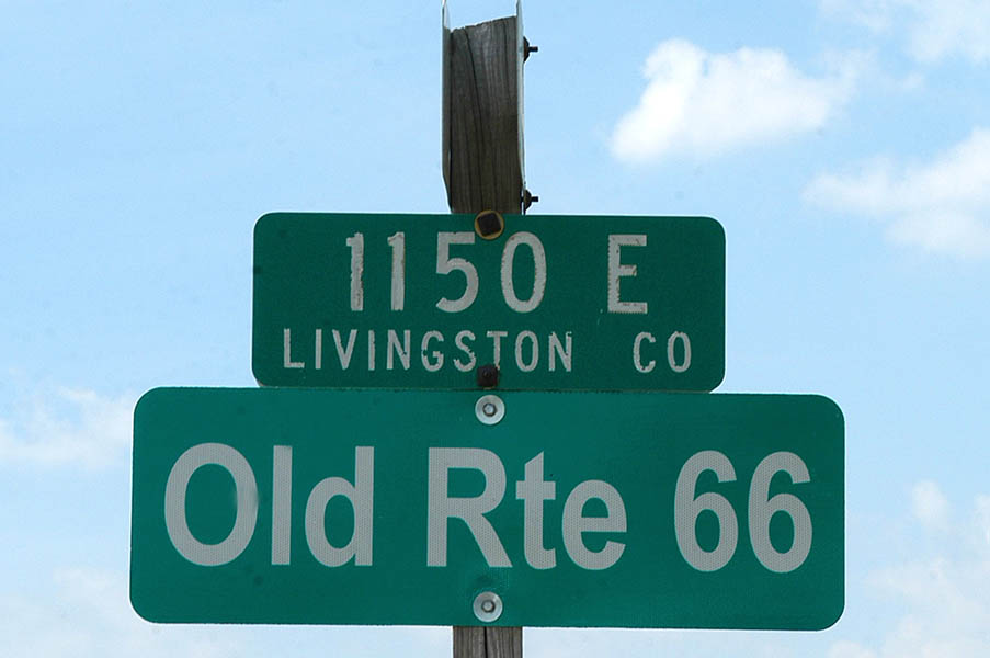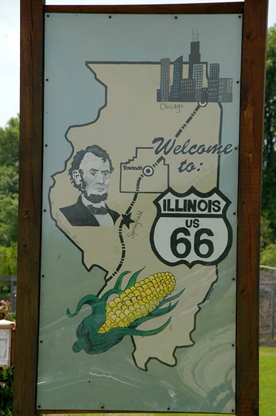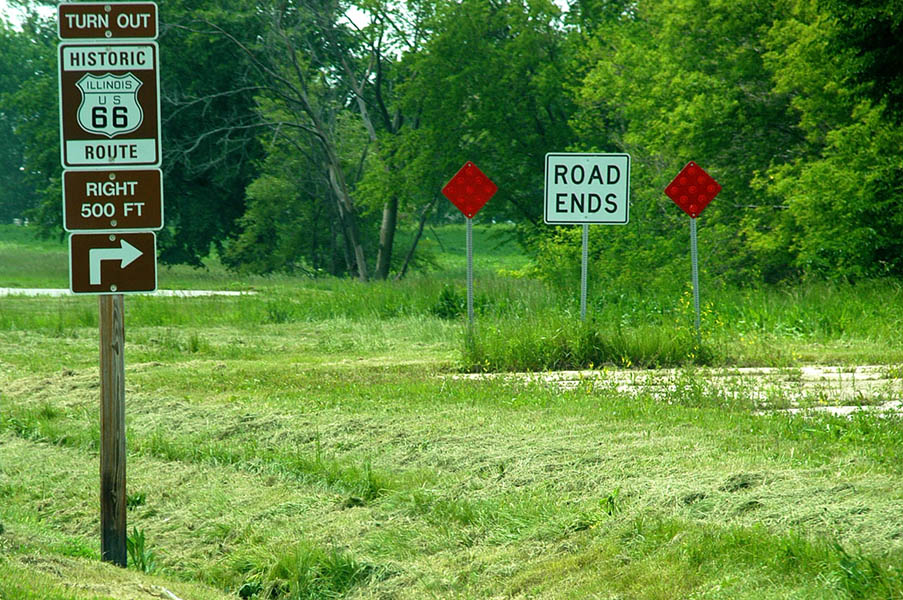 En esta carretera es cuando tenemos nuestro primer contacto con la vieja Ruta 66, ya que en esta zona transcurre paralela a ella, y algo que nos sorprende es comprobar como esta no es más que un estrecho tramo de asfalto comido por la hierba en muchas zonas, cortado continuamente por carteles de “Road Ends”, en los puntos en que se cruzan otras carreteras o simplemente salen caminos de las fincas adyacentes. La satisfacción de este primer contacto con tan “noble” ruta y el poder rodar, aunque sea a cortos tramos, por ella, nos anima y nos hace ver el monótono paisaje, de extensas llanuras y plantaciones de maíz, más bonito de lo que realmente es; en cualquier caso la ruta ha ganado en calidad desde que abandonamos la autopista y el cruzar los pequeños pueblos que nos vamos encontrando por el camino nos hace mucho más ameno el viaje.