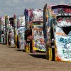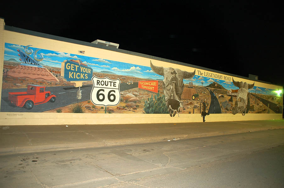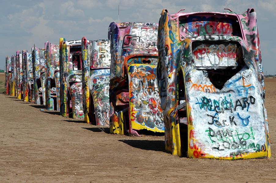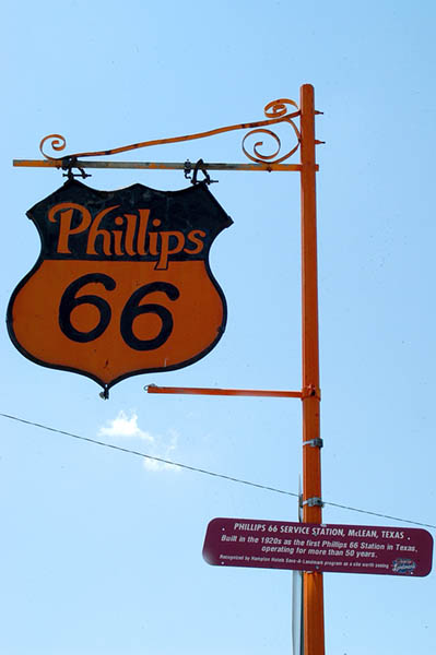 En Mc Clean, aparte de otro museo de la Ruta 66, está la primera gasolinera Phillips 66, construida en 1920 y que estuvo en servicio más de 50 años, se mantiene conservada en su antigua ubicación junto a sus surtidores y un camión cisterna de la época. La Interestatal 40 nos sigue transportando a nuevos destinos dignos de fotografiarse, como el Cadillac Ranch, en Amarillo. Paralelo a la autopista, la vieja 66, y unos 100 metros más adentro, en medio de un inmenso rancho, diez Cadillac clavados en el suelo todos con la misma inclinación, más adentro el rancho del “ocurrente” ranchero al que se le ocurrió la idea de tan particular monumento, al cual Bruce Springsteen le dedicó una canción en la que cuenta como James Dean en un Mercury del 49 se acerca a Cadillac Ranch para juntarse con Burt Reynolds y su Trans Am negro.
