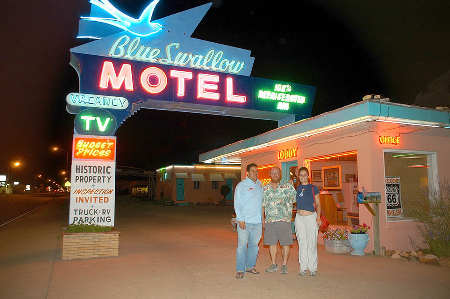 El Motel Blue Swallow en Tucumcari, es de esos lugares míticos dentro de la ya mítica Ruta 66, y donde de poder, hay que pasar al menos una noche. Abierto desde 1939, en la actualidad esta regentado por Bill, un divertido y amable tipo que disfrutará contándote anécdotas sobre la historia del hotel y de la propia ruta; además de poderte comprar camisetas, gorras y demás artículos de la ruta o del hotel, te invitará a que cojas una cerveza de una nevera que tiene en la misma recepción, “invitándote” a que dejes un dollar de propina o colaboración, esto es así porque él, como en muchos otros locales de hostelería no tiene licencia para vender alcohol, con lo cual el no está vendiendo sino que te está invitando, algo que supongo si debe de ser legal. Tucumcari es un curioso pueblo en medio de la nada, que casi se limita a una largiiiiiisima avenida con unas pocas calles a los lados en el que se pueden ver grandes pintadas que hacen referencia a la Ruta 66. Es domingo 28 de mayo, hoy hemos hecho 535 Km., esta es nuestra tercera noche de viaje, ya hemos visto un montón de cosas curiosas y estamos a los pies de las Montañas Rocosas, la parte más espectacular del viaje está aún por llegar, pero para poder saber que es lo que vivimos, deberás esperarte hasta el próximo capitulo.