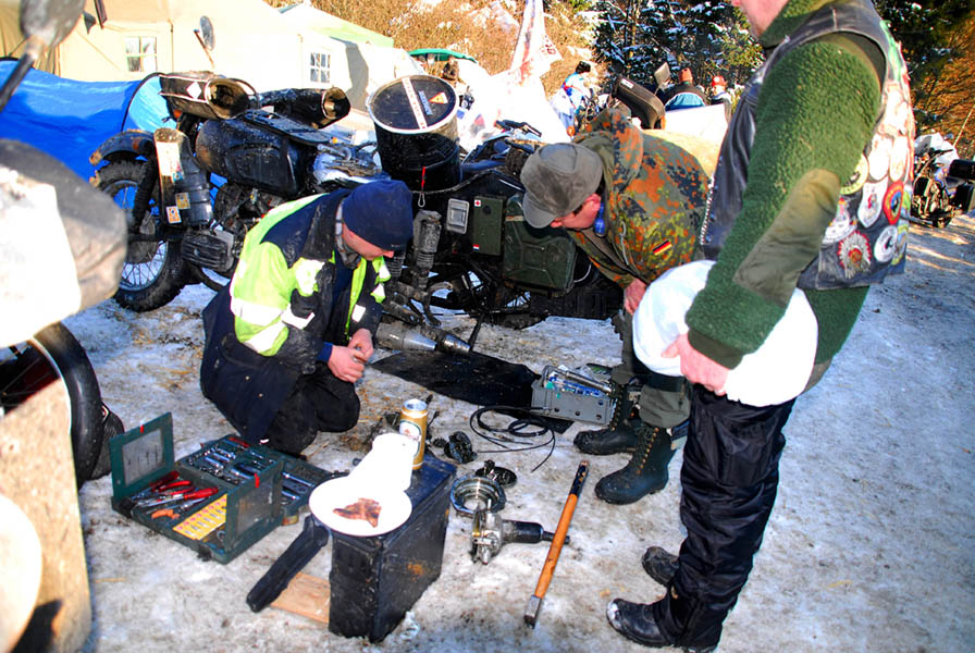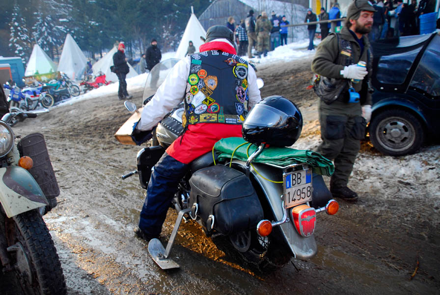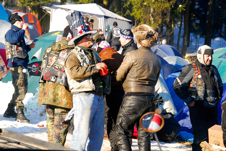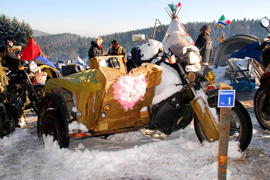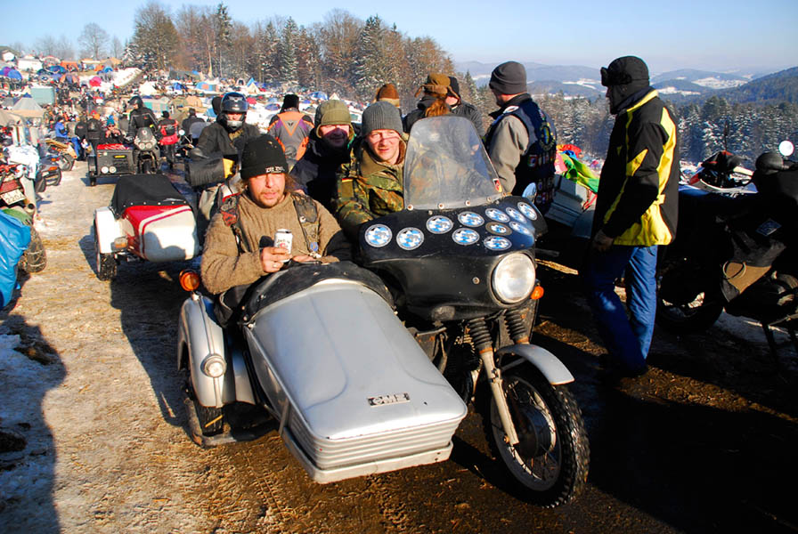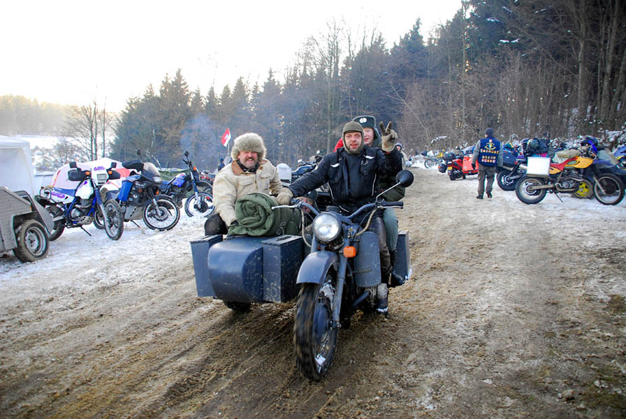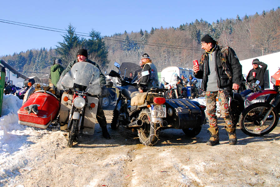 Algo que no ha cambiado en esta concentración son sus motos y los moteros que las montan, en el caso de los últimos, mucho “pureta” de cuero, jersey de lana, piel de cualquier tipo, millones de viejos parches en chupa y/o pantalones… Y en cuanto a las primeras, pues que este es el reino de los sides, de los que puedes encontrar de todas marcas, formas, tamaños y antigüedades, y respecto a esto último que el significado antiguo, aquí carece de cualquier valor, y que las viejas Zundapp KS 601 de la Segunda Guerra Mundial y que dieron nombre a esta concentración siguen llegando aquí año tras año, junto a las Jawa, MZ, BMW Guerra y cualquier viejo cacharro que te puedas imaginar. De igual manera, los inventos para protegerse del frío son para todos los gustos y los skys en algunas motos y especialmente las cadenas para poder transitar por el interior de la zona (y mucho años simplemente para poder llagar hasta la concentración) son más que habituales.