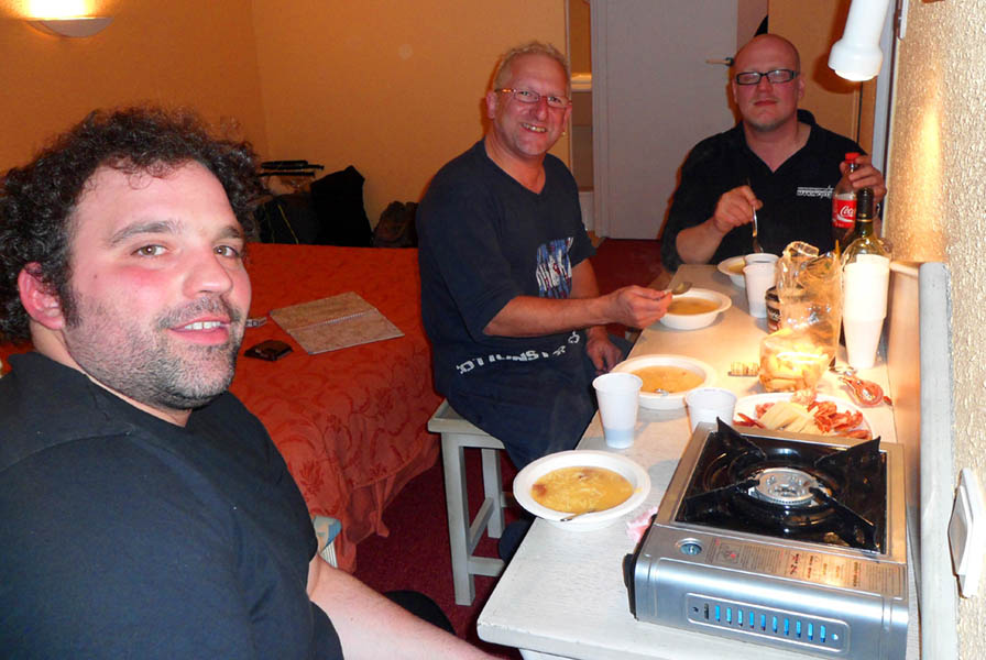 Con un frío considerable en la que alcanzamos mínimas de -7º, fuimos devorando Km. en etapas de alrededor de 200 Km. hasta llegar a Brive-La Gallarde, donde tras 910 Km. decidimos que dábamos por concluida la etapa del día. Buscamos un hotel en el que nos ofrecieron un apartamento de dos habitaciones para los cuatro, en el que nos organizamos la primera de nuestras “cenas recuperadoras” a base de sopa (llevábamos cocina), embutido ibérico de todos los colores, buen queso manchego, vino de Rioja y hasta tequila.