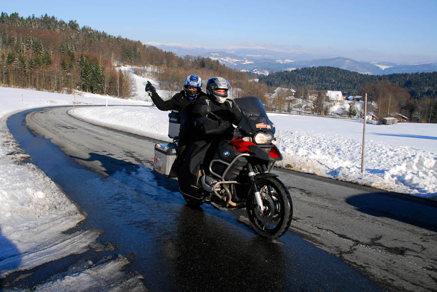 La idea era hacernos ese día la mayor cantidad de Km. posibles y dejarnos para los siguientes días etapas más cortas por si el tiempo se ponía complicado. Tras haber estado atentos al tiempo las jornadas precedentes, decidimos coger la “vía alemana” para ir a la concentración, dejando de lado la italiana por la costa azul que ya tenemos súper machacada y la suiza, por ser donde más probabilidades había de encontrar demasiada nieve.