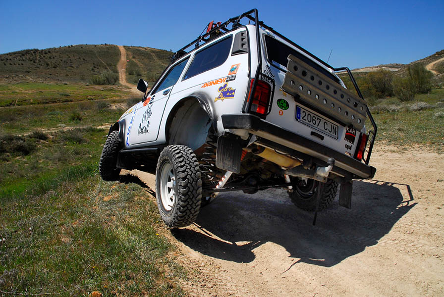 Puesto en manos de Valeriano Medina, de Medina Motor en Fuenlabrada (Madrid), mecánico oficial Lada y uno de los mayores conocedores de este pequeño TT, lo primero fue conseguir más altura, de la buena con unos muelles +5 cm. delante y detrás, y de la mejor, con unos neumáticos 215-75/15 Mud Terrain de BF Goodrich, que mejoraron los angulos de ataque, ventral y salida y la capacidad de tracción, unos amortiguadores Trail Master +8 cm. permitieron que la rueda trasera descolgase mucho más, llegando a traccionar en situaciones en las cuales antes no podía, si bien ello llevó a tener que alargar el tirante del repartidor de frenada así como los latiguillos de freno trasero, a sujetar los muelles a su cazoleta inferior para evitar que se saliesen en las descolgadas más grandes ya ajustar la caja transfer para evitar vibraciones y que las transmisiones trabajasen forzadas.