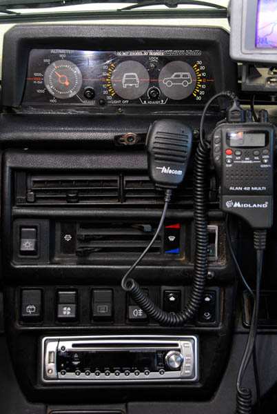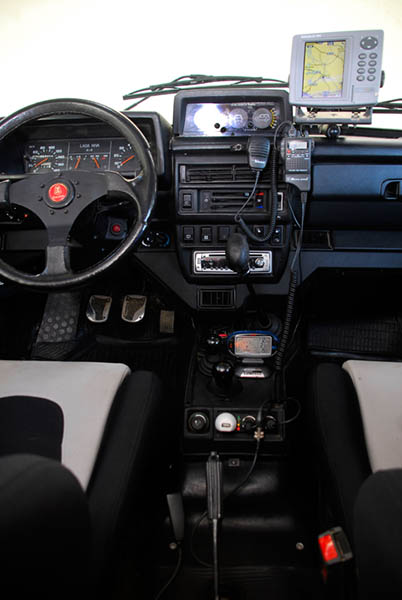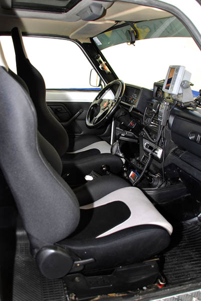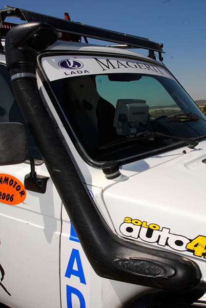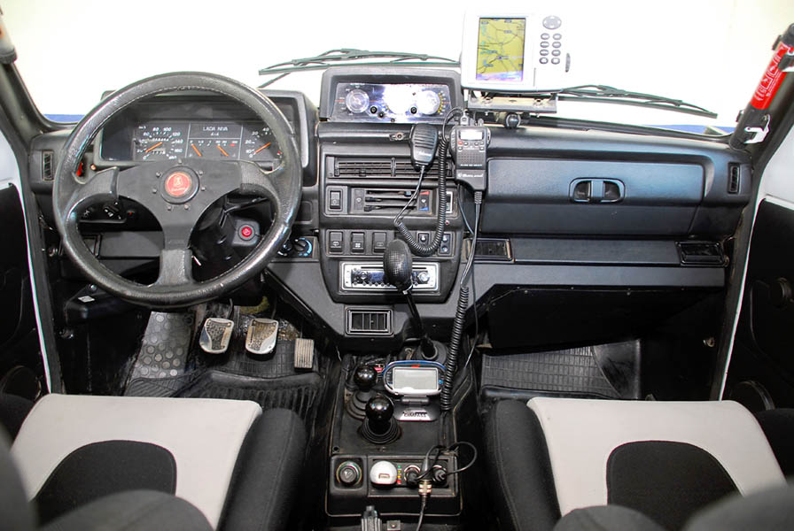 El equipamiento para viajar, ganar autonomía y capacidad de desatasco está compuesto por una baca africana modular que puede llevar hasta cuatro ruedas completas más el gato HI-lift, un soporte para las planchas en el portón trasero, un compresor fijo en el vano del motor, un cabrestante T-Max 6500, eslingas, grilletes y completa equipación de herramientas además de depósitos auxiliares para gasolina y agua, consiguiendo que entre todo perfectamente gracias al desmontaje de los asientos traseros, lo que permite disponer de una gran caja de carga (prácticamente todo el coche). La emisora, un GPS Eagle Intellimap, brújula digital, un inclinómetro-altímetro, cargadores USB y de pilas, radio CD con MP3, inhibidor de fuego, linterna y lunas tintadas junto al aire acondicionado completan el equipamiento interior y permiten a este Niva atacar los más grandes viajes, algo a lo que también colabora la nueva dirección asistida. Por abajo, una plancha cubrecarter y un sistema de doble amortiguación heredado de los Nivas de Rallys, con dos amortiguadores Koni Heavy Track además de los originales, protegen y mejoran todo el sistema de tracción y amortiguación delanteros.