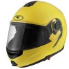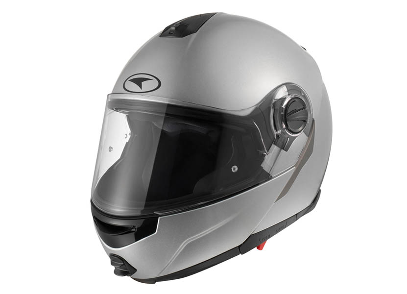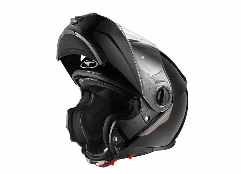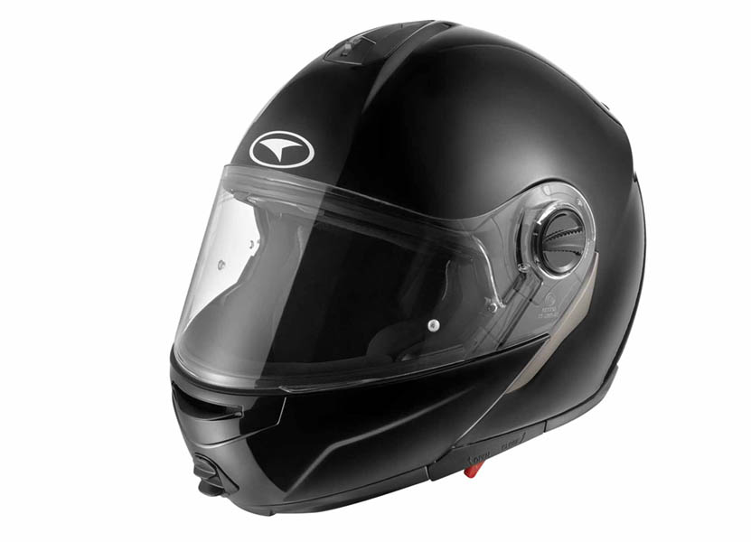 Uno de los aspectos a destacar de este casco modular es el sistema de apertura de su mentonera. Ésta se eleva mediante una trayectoria elíptica que mejora la aerodinámica del casco, ya que reduce la superficie frontal cuando se circula con ella abierta. Además incorpora un sistema de seguridad que fija la mentonera en la parte superior del casco y evita su cierre accidental en marcha. El Modus también cuenta con una visera termoformada anti rasguños, fácilmente desmontable e intercambiable que se completa con unas gafas de sol integradas que mejoran la visibilidad ante posibles deslumbramientos. Tanto la mentonera como las gafas protectoras, se accionan mediante botones exteriores, especialmente diseñados para su utilización con guantes.