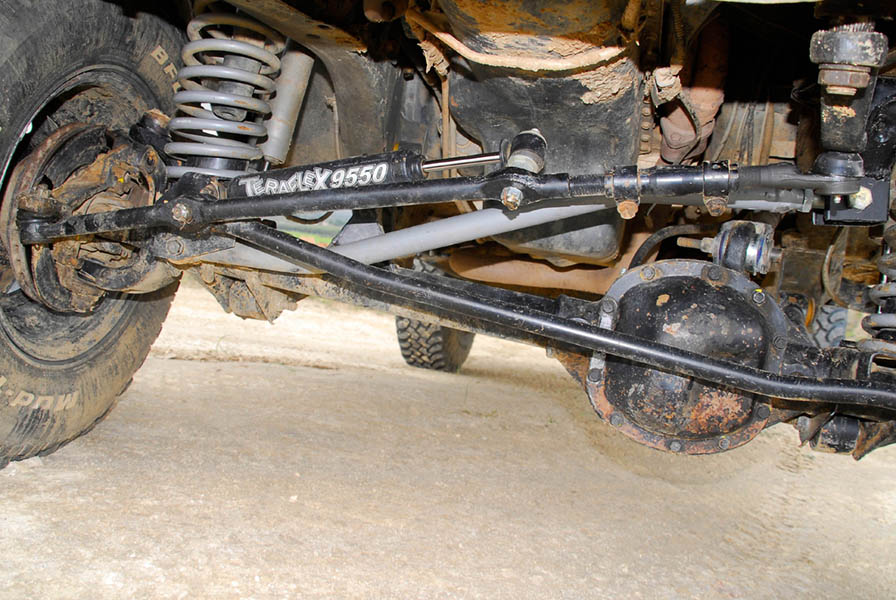 Puesto en contacto con Alfonso y Nacho, de Mas4x4, y explicándole sus deseos, lo primero que se hizo fue instalarle un Kit Rubicón Express de 4´5 pulgadas, kit que lleva incluido la modificación del soporte de la barra panhard, barra panhard con rotulas de chromolly, tacos superiores de 4 cm. en los muelles delanteros, además de añadirle en la parte trasera unas gemelas extensibles tipo revolver. A lo anterior se le añadió un amortiguador de dirección Teraflex y se montaron barras de dirección reforzadas. Es de destacar que la estabilizadora es desconectable, lo que le permite ganar en recorrido cuando está trialeando a la vez que mantener la estabilidad si la conectamos para circular por carretera.