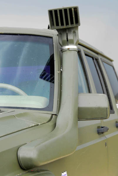 Exteriormente se pintó todo el coche de verde militar, lo que le da un aspecto aún más rudo y se tintaron las lunas, para ganar en intimidad durante las rutas y seguridad ante la posible rotura de alguna de ellas. La antena de la emisora montada en el capó delantero es, además de lo anterior, lo único que destaca exteriormente.