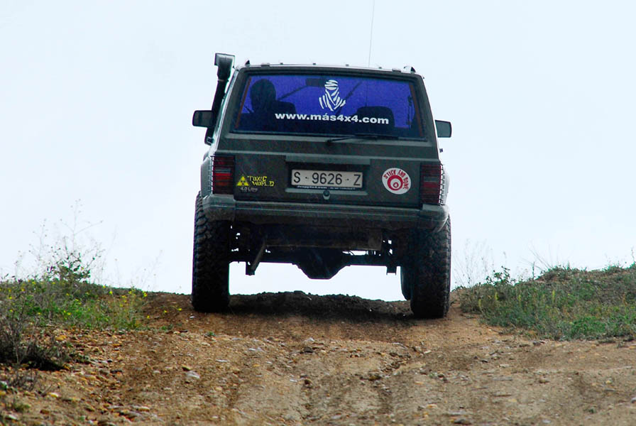 Al llegar, “ataqué” la zona como lo hago habitualmente, algo que solo sirvió para que el Cherokee estirara sus suspensiones, descolgando sus dos ejes rígidos pero sin llegar a separar las ruedas ni un centímetro del suelo, por lo que tuve que ir a buscar, ya con más “mala leche”, una postura que me permitiera verle con las ruedas en el aire, algo que me mostró como su recorrido de suspensión le permite descolgar tanto las ruedas delanteras como las traseras hasta, prácticamente alinear la parte superior de los neumáticos con la línea de la carrocería. También, al ver semejante recorrido en el eje delantero, se me escapó alguna que otra lágrima en honor de los prácticamente desaparecidos ejes rígidos delanteros que tan buenas prestaciones dan a la hora de superar obstáculos, snif, snif. Como último detalle diré que durante la sesión de fotos, la barra estabilizadora estaba conectada…