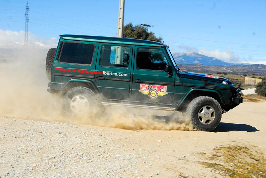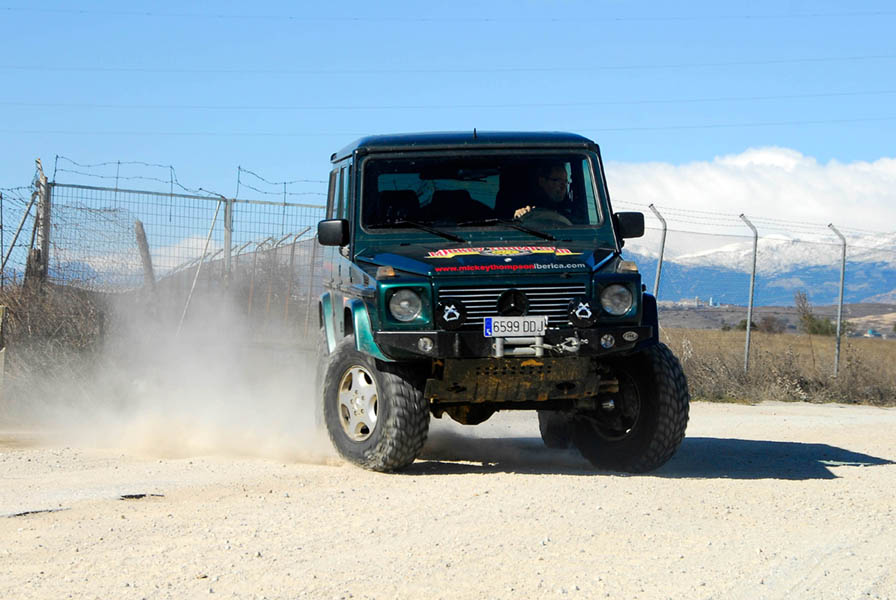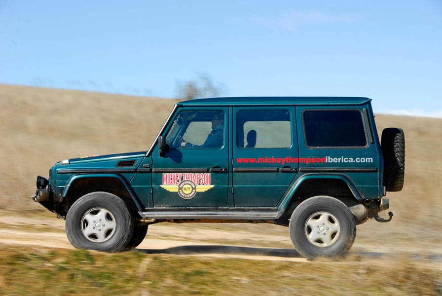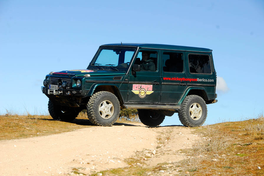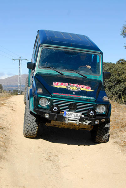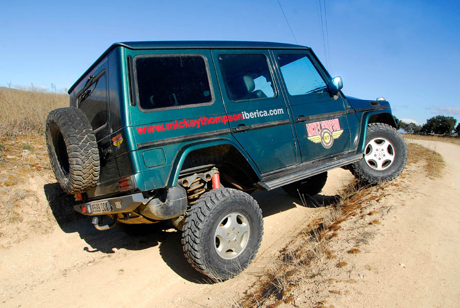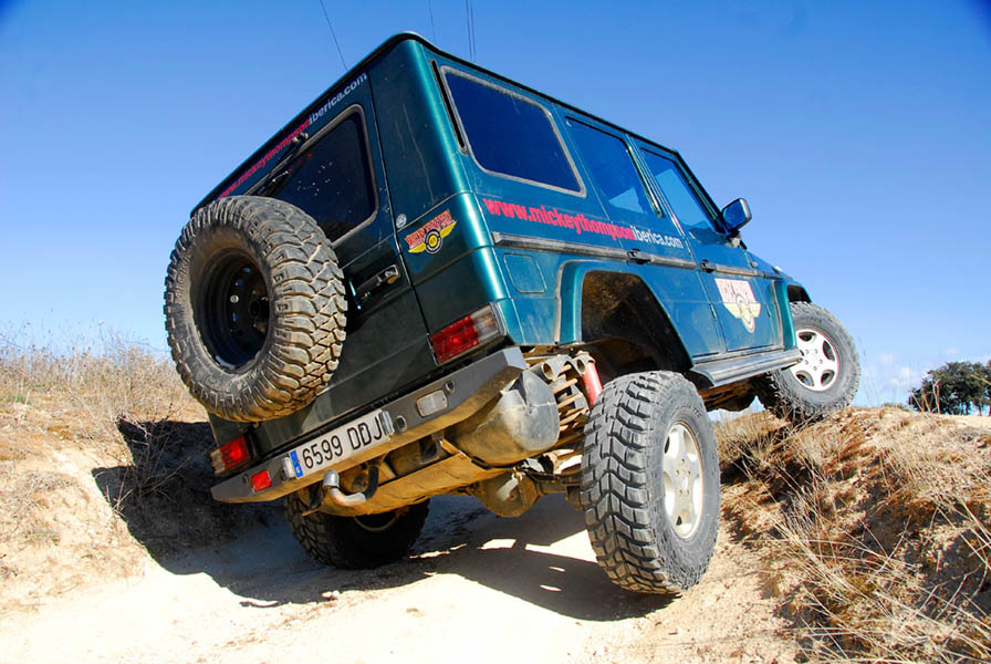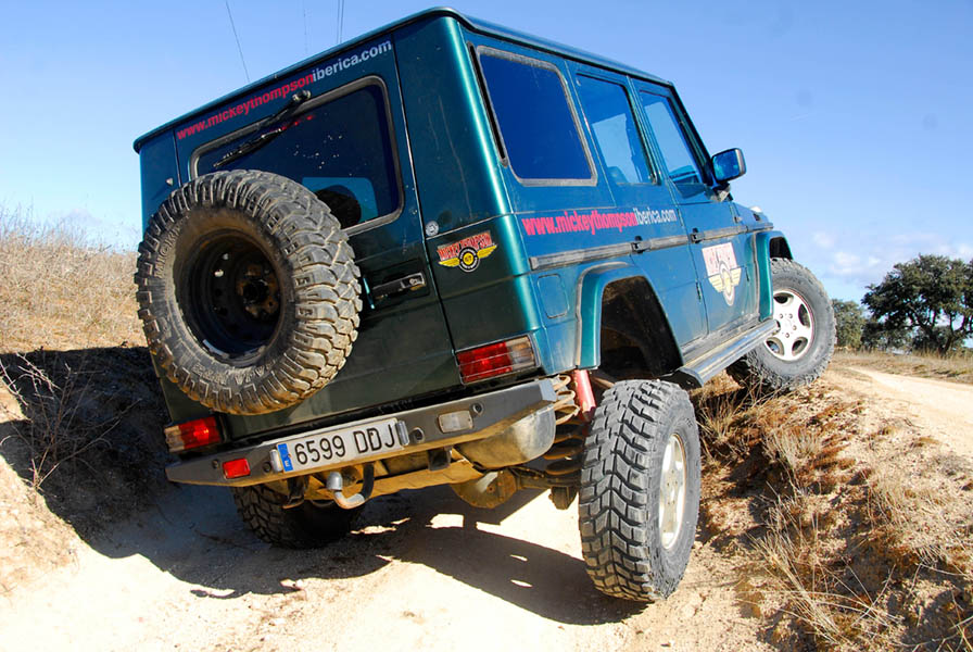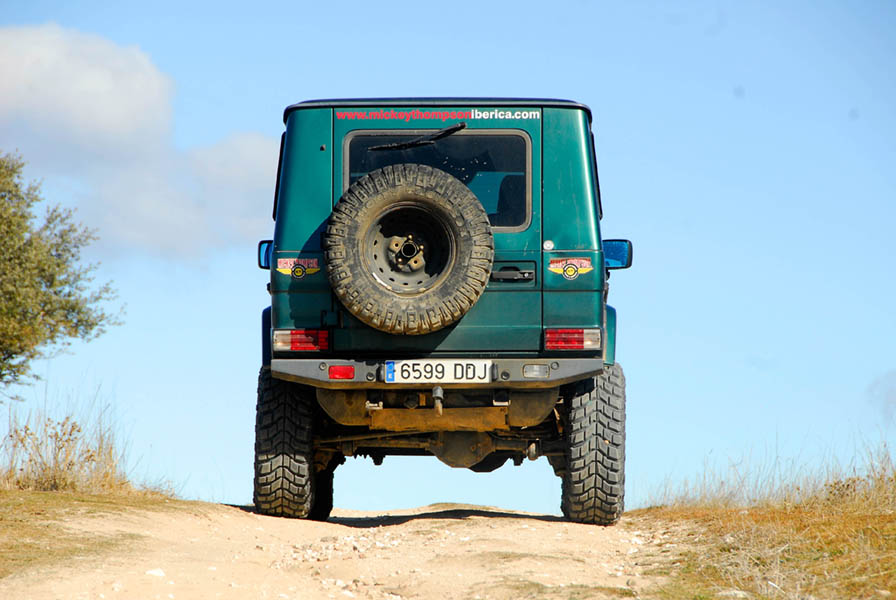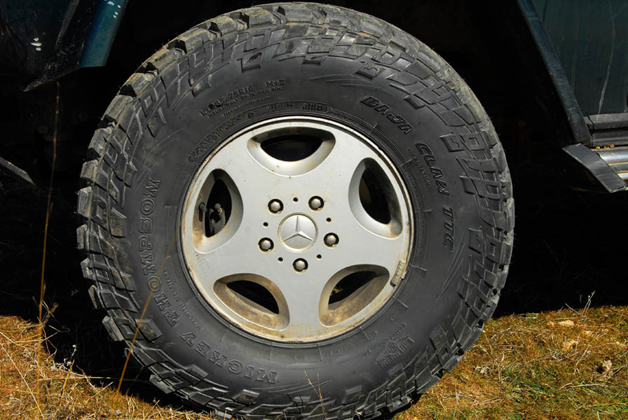 En cuanto a las ruedas y empezando por el principio, le puse unas llantas de 16” originales de Mercedes y como llevan un desplazamiento muy positivo (+63), le pusimos unos separadores de +30 mm. En cuanto a neumáticos, siempre he montado unas 285/75-16, que sin ser una medida excesiva, si es cuatro veces mayor a la original (265/60-18). Por supuesto, siempre Mickey Thompson, primero llevé unos Baja MTZ, luego y hasta hace poco he llevado montado unos Baja Claw que iban muy bien y ahora llevo los nuevos Baja Claw TTC que van mejor todavía. Es una goma relativamente blanda que agarra excelentemente bien y que además puede llegar a durarte, en un coche tan potente como este, 50.000 Km.; en un coche con menos CV es posible que pueda durar del orden de 20-30.000 Km. más. Además de lo anterior son gomas que llevan 10 lonas, lo que te permite bajarlas muchísimo de presión, compuestos de sílice y tacos partidos, lo que consigue que apenas hagan ruido en carretera, además, tienen un gran agarre incluso en mojado, algo que muchas ruedas de tacos no hacen.