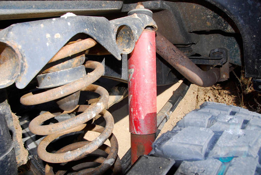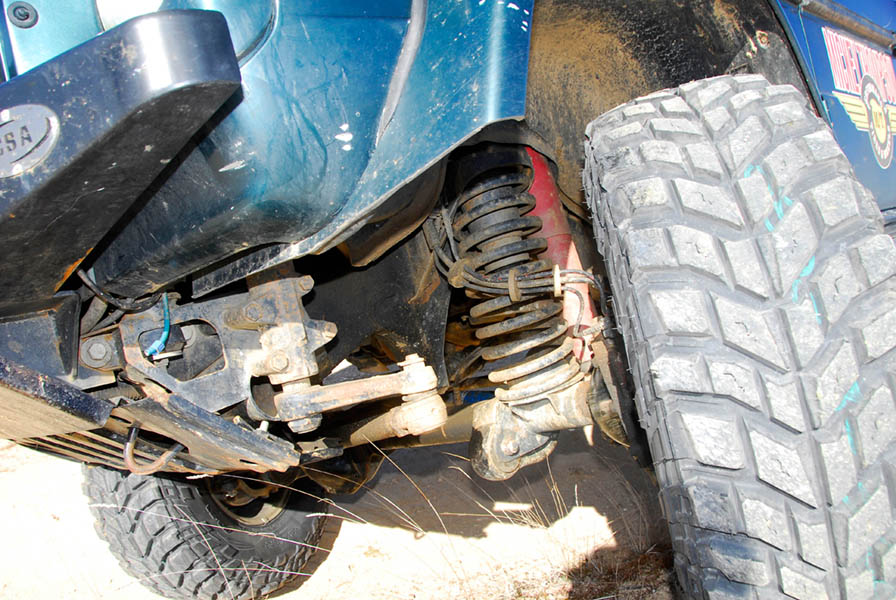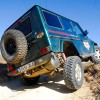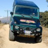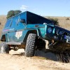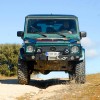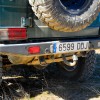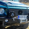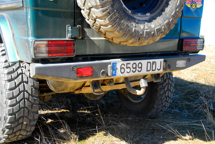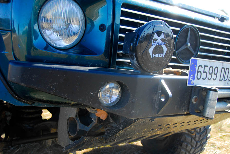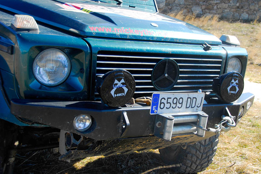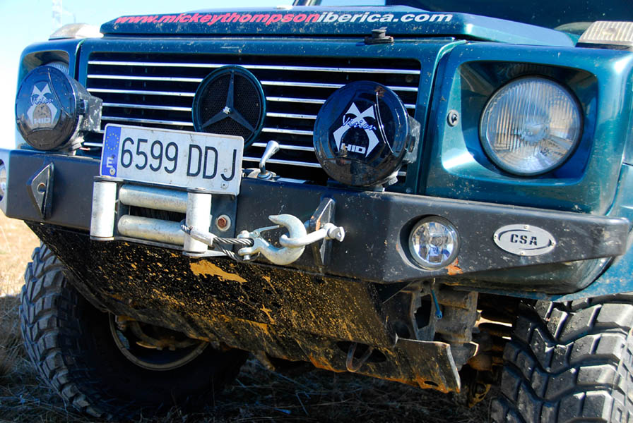 En lo que respecta a los amortiguadores, lleva los Koni de “autobús” que “hace” Carlos Acosta de CSA y que en este coche van realmente bien; llevan casi un litro de aceite, por lo cual tardan en calentarse. Una de las próximas mejoras será sustituir los delanteros porque en este coche con mucho peso y muchos CV… en ocasiones (yendo mucho rato rápido en zonas bacheadas), se quedan cortos. Ten en cuenta que delante, además del peso del motor llevo un Winch de 11.000 Lbs. No se puede montar menos en un G porque con menos de 5 CV en el winch, cuando lo necesitas de verdad, no te saca (o lo quemas), el parachoques también es de hierro, hecho a medida, también en CSA, las planchas de protección, las barras de dirección blindadas (macizas)…