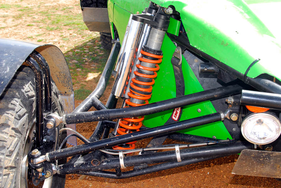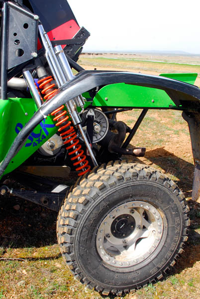 Junto a esto, la amortiguación ha sido encargada a un par de amortiguadores VOGTLAND de ¡50 cm.! de recorrido por rueda, uno de ellos con muelle y ambos con todo tipo de regulación (precarga, compresión, extensión, etc.). Ambos trenes llevan limitadores de suspensión.