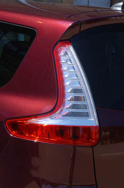 A diferencia del Scenic “pequeño”, su diseño es más serio y formal, prevaleciendo la sobriedad, si bien, la alta línea de cintura ascendente hacia la trasera y la línea de techo, cayendo a la misma vez hacia atrás, terminando ambas en los modernos grupos ópticos traseros, le otorgan un aire de modernidad.