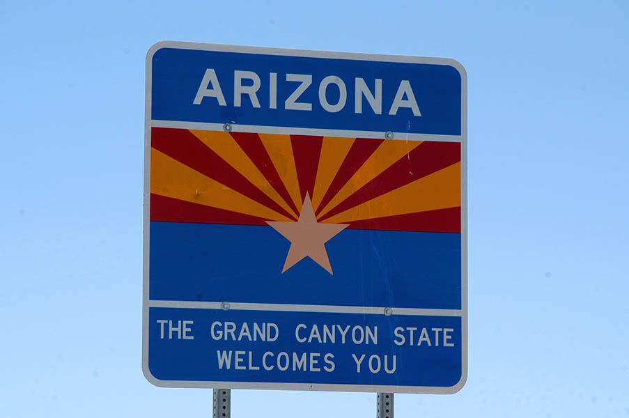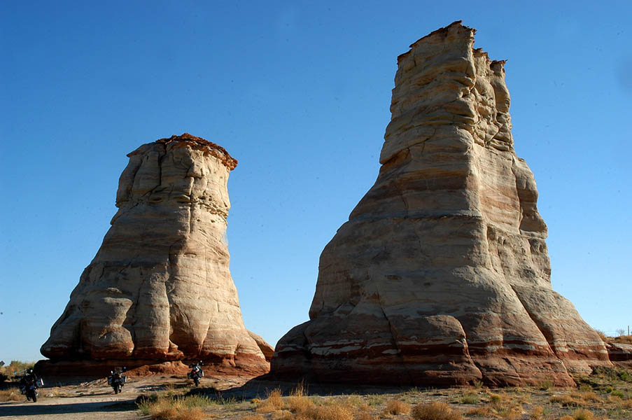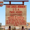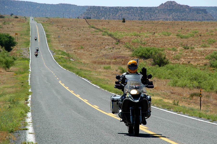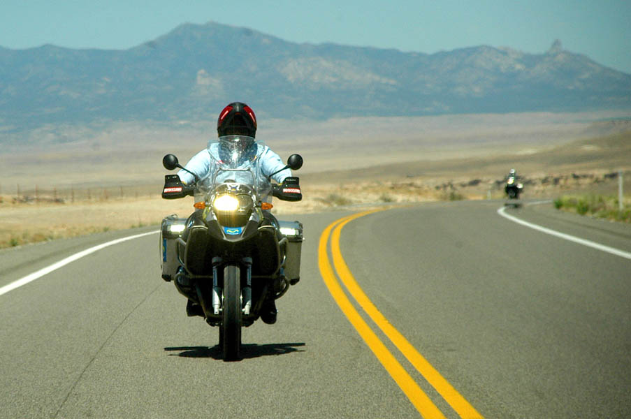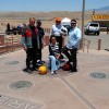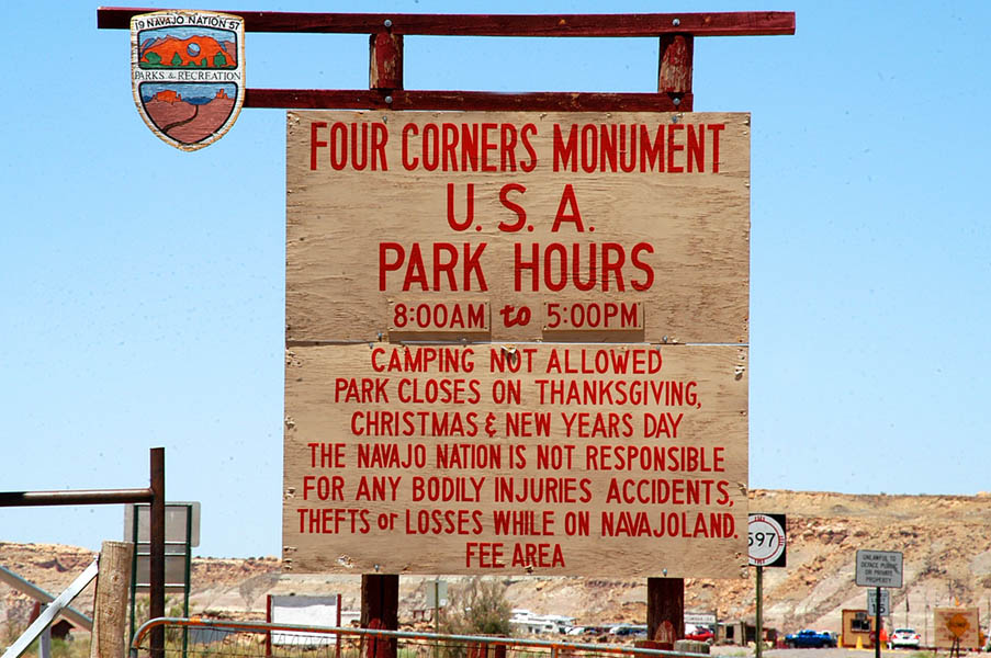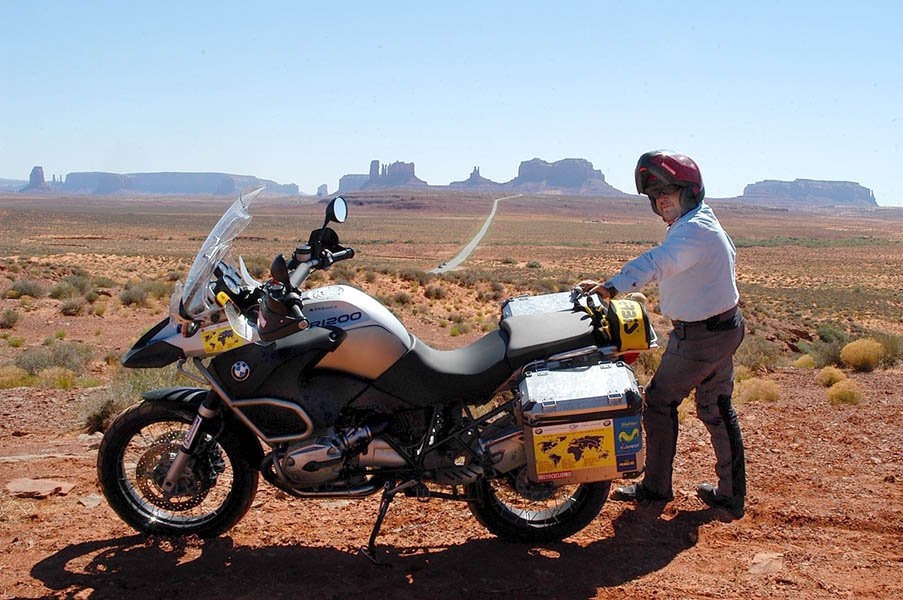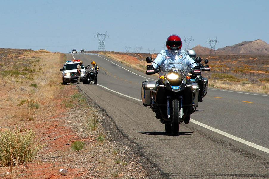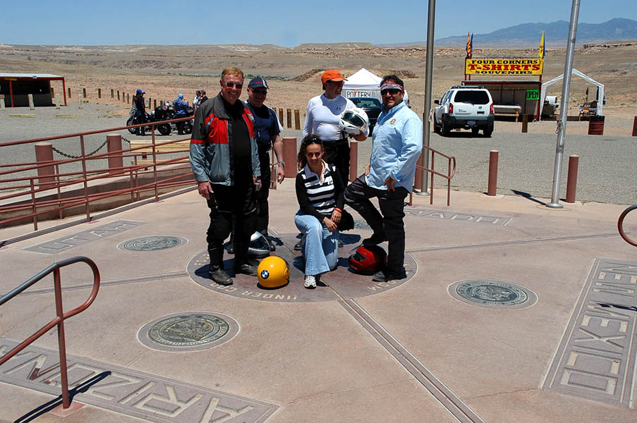 Tras desayunar en Cortez en una tranquila terraza junto a la carretera en la que los colibríes venían a beber al lado tuyo, seguimos camino hacia “Four Córners Monument”, el único punto de los USA en que se juntan cuatro estados (New México, Colorado, Arizona y Utah). El punto exacto está marcado con una plataforma de granito, sobre la que tomamos una foto curiosa, pues cada uno de nosotros estaba física y legalmente en un estado diferente. También aprovechamos para comprar algunos recuerdos fabricados por los indios navajos. El calor pegaba a base de bien, por lo que decidimos continuar dentro del estado de Arizona en dirección a Kayenta. Yo iba segundo, detrás de Bob y un poco sorprendido por la velocidad que llevaba, íbamos circulando por un límite de 60 millas y yo, yendo a 80 no le alcanzaba, siendo un punto cada vez más lejano en la larga recta de la carretera, cuando de repente al irnos a cruzar con dos coches de la policía que venían de frente, vemos como el segundo hace un giro brusco delante de nosotros y sale disparado en nuestra misma dirección con todas las luces encendidas. Iba a por Bob, tras alcanzarle y pasar despacio junto a él, paramos un poco más adelante en la cuneta y pudimos hacer la foto del “empapelamiento” del viaje, que como digo, y por suerte, fue la única.