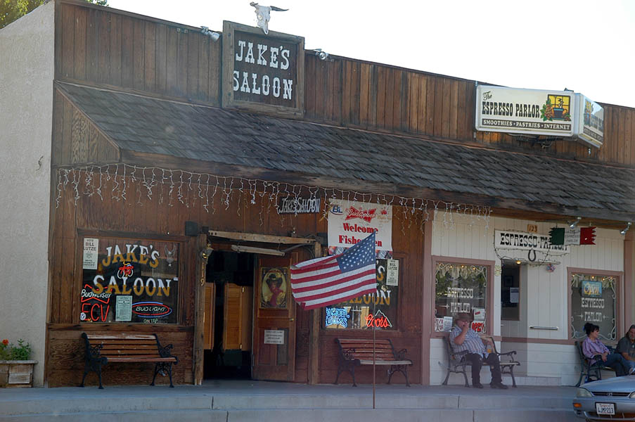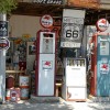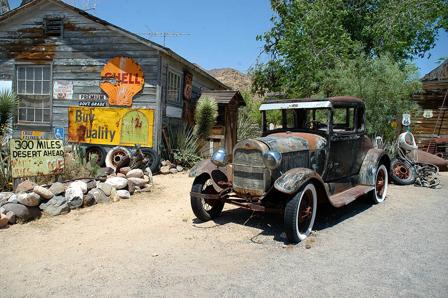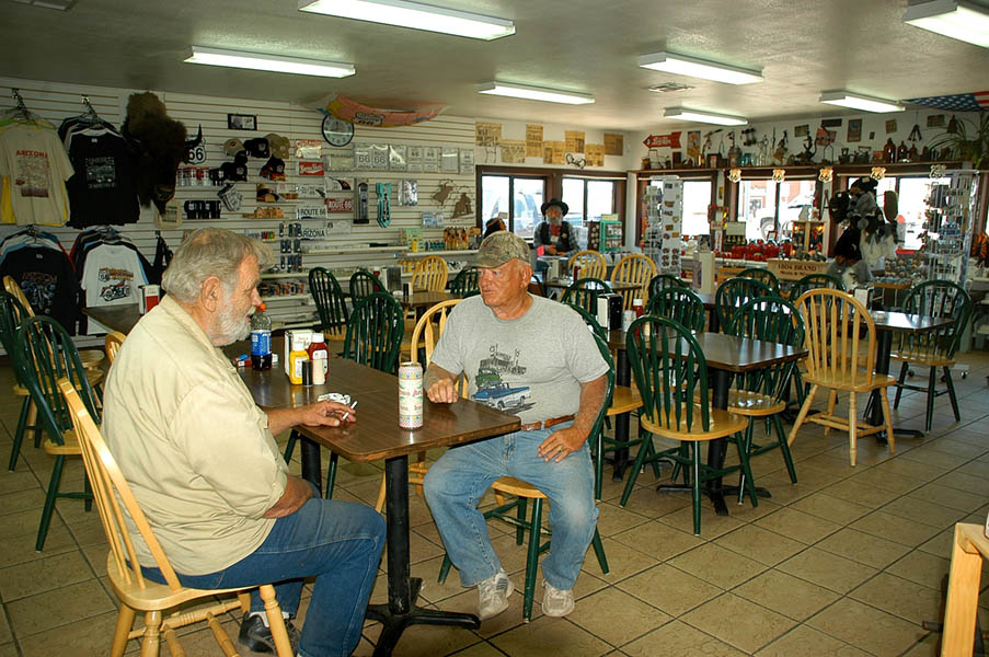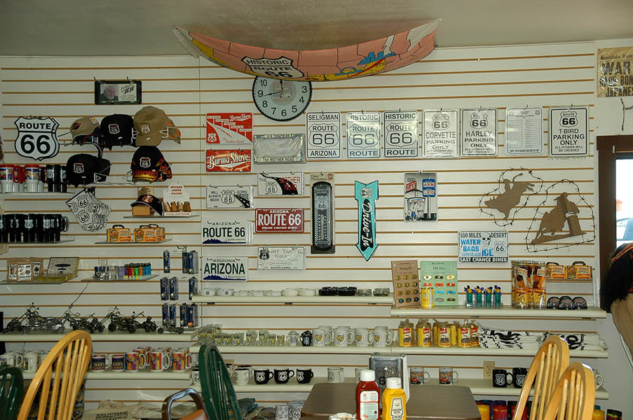 A las 6 de la mañana David se levantó para engrasar y ajustar la cadena de su bici, y a las 9, tras fotografiarnos con las motos y la bici, todos salimos en dirección a Sin City, (Ciudad del Pecado) Las Vegas. A distintas velocidades. El intrépido belga fue pronto un punto en nuestros retrovisores. Nosotros llegaríamos a Las Vegas en unas 7 horas, él en 4 días. Salimos por la 64 sur dirección a Willians, desechando la posibilidad de ver Flagstaff, la ciudad donde nació el hombre de negocios que convenció a políticos y demás fuerzas vivas para que se construyera la Ruta 66, pero sabedores que tras andar unos km. por la interestatal 40, llegaríamos a Seligman, pueblo en el que cogeríamos otras vez la Old Route 66 para recorrer sobre ella las 100 millas que separan Seligman de Kingman, posiblemente el mejor tramo de toda la 66 que pasando por Yampai, Nelson, Truxton, Valentine o Hackberry, nos muestra las mejores estampas de lo que la ruta fue en su día, con viejas gasolineras, neones, coches y carteles de la época conservados de muy distintas maneras unos de otros.