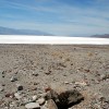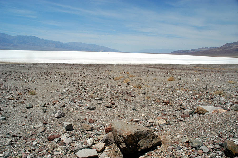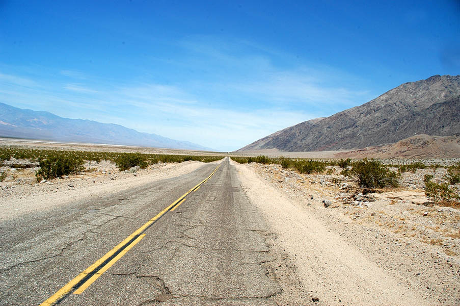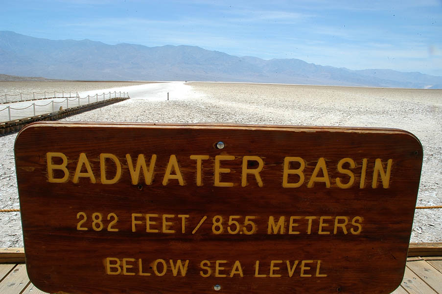 El Death Valley (Valle de la Muerte), en el desierto de Mojave, es donde se alcanzan algunas de las temperaturas más altas del planeta. Y realmente comprobamos que era cierto, pues según nos fuimos adentrando en el parque, el calor se fue haciendo más y más sofocante hasta el punto de quemar. Paramos en Badwater Basin, a 85 metros y medio bajo el nivel del mar, el punto más bajo de los Estados Unidos y donde el calor es tal que te hace sentir preocupación, no es extraño el nombre de este sitio, “Valle de la Muerte”, el simple hecho de pensar el atravesarlo a caballo en verano, como hacían antiguamente, te da angustia. Las larguisimas rectas de la carretera, rodeadas de “nada”, impresionan.