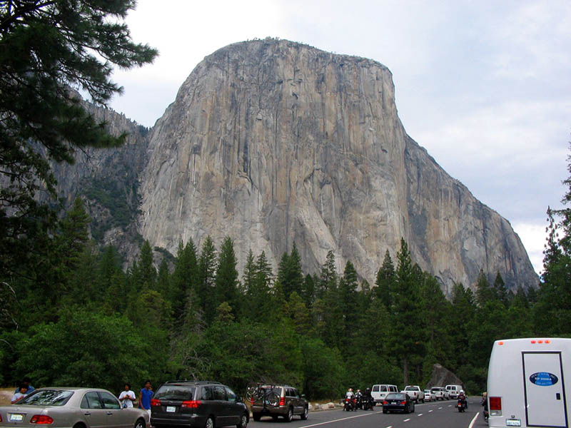 A unos 60 Km. de Mono Lake, giramos hacia el oeste e iniciamos el ascenso de la sierra por una carretera muy revirada, con curvas cerradas y pendientes muy empinadas que nos llevaban al Sonora Pass. Fueron 72 Km. de montañas, bosques y ríos, hasta llegar al idílico valle, por el que discurren las aguas limpias del río Yosemite y se erige majestuoso El Capitán, lugar donde se citan escaladores de todo el mundo para conquistar sus impresionantes paredes verticales.