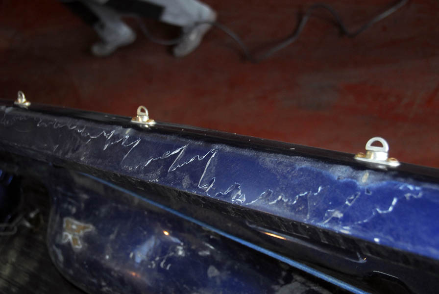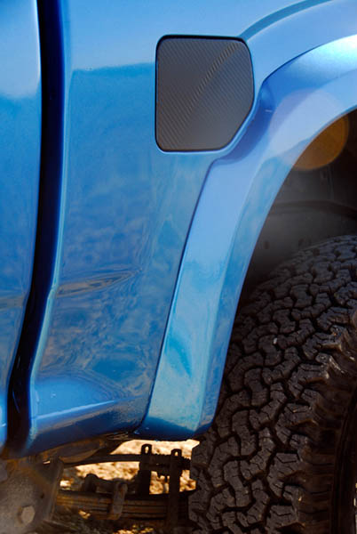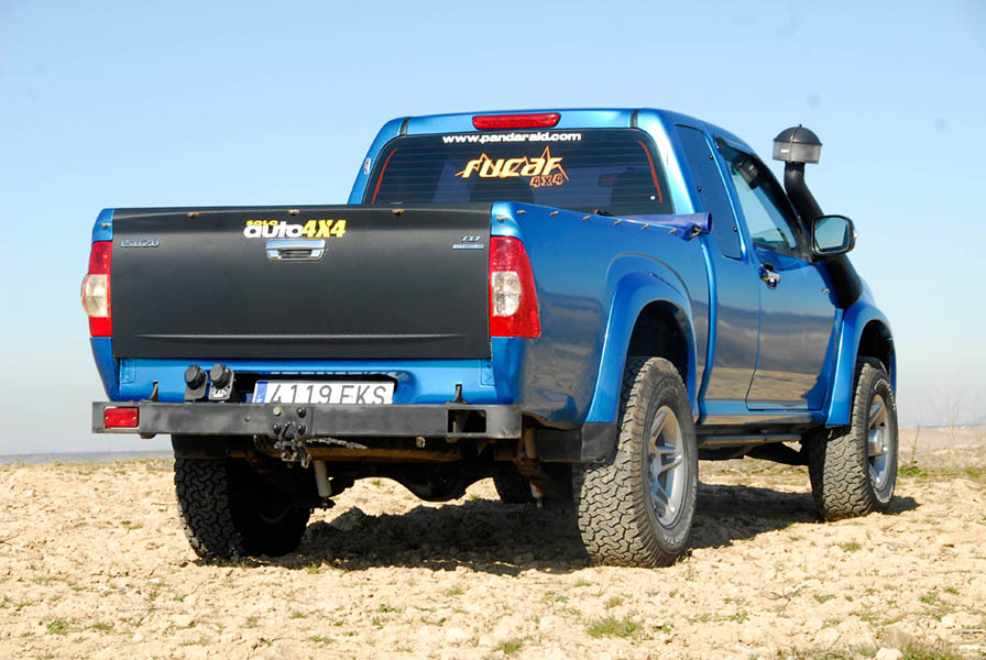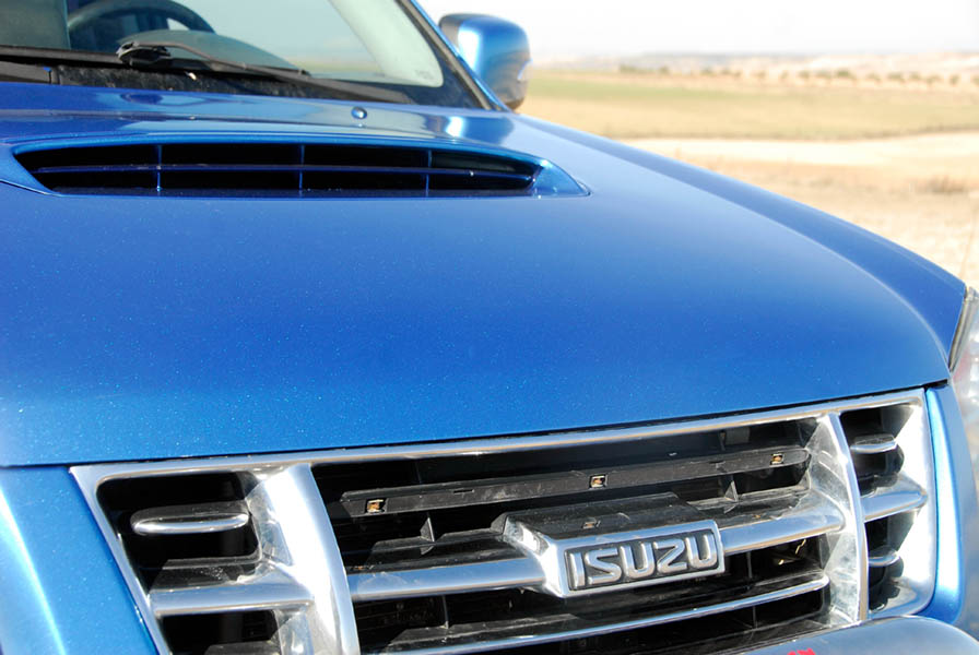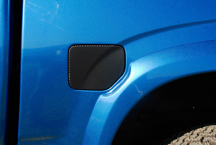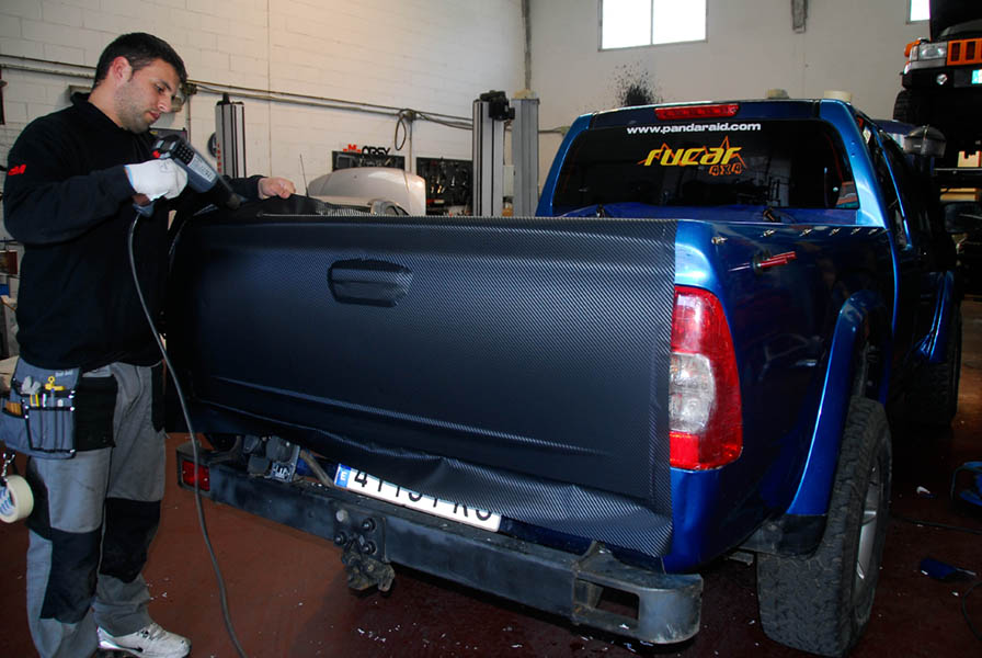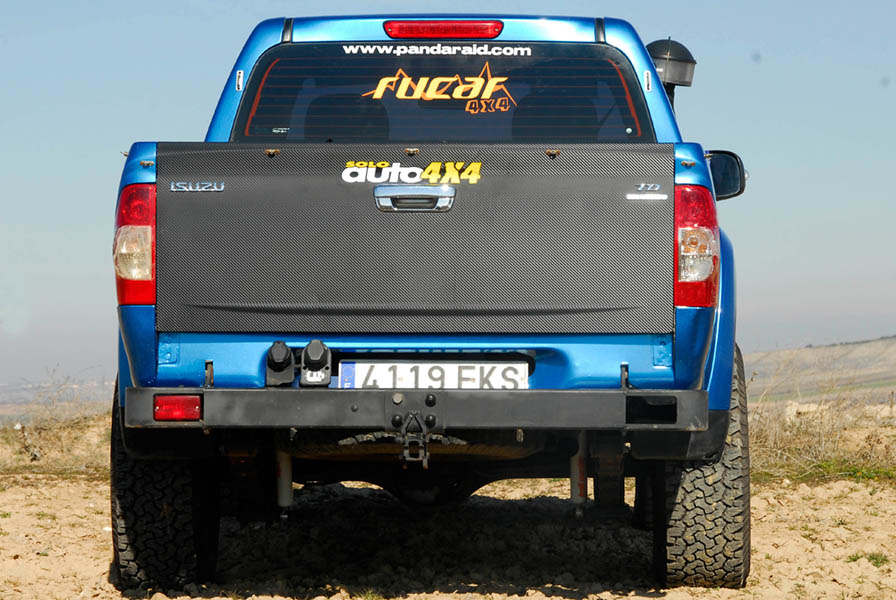 Además de lo anterior, otra de las ventajas que ofrece el vinilar el coche es la posibilidad de personalizarle de alguna manera, y más allá de que el tono escogido no existe en el catalogo de Isuzu, aprovechamos la ocasión para vinilar la puerta de la caja de carga y la trampilla del deposito de gasolina con una lámina imitación fibra de carbono, que queda realmente espectacular.