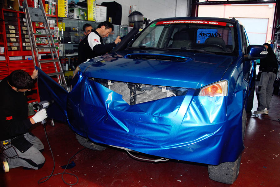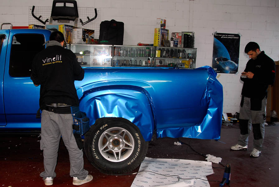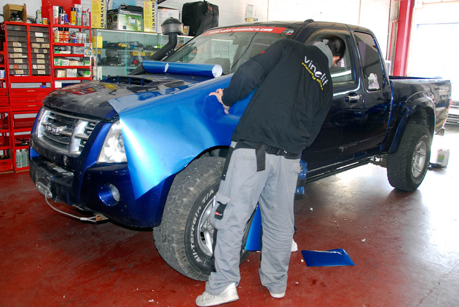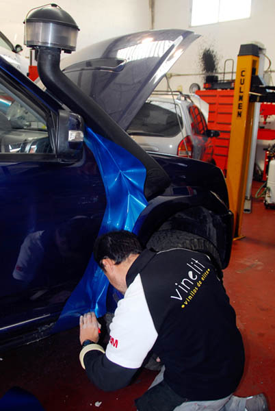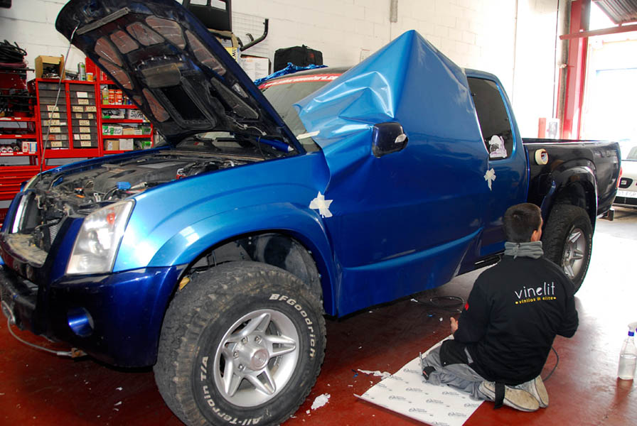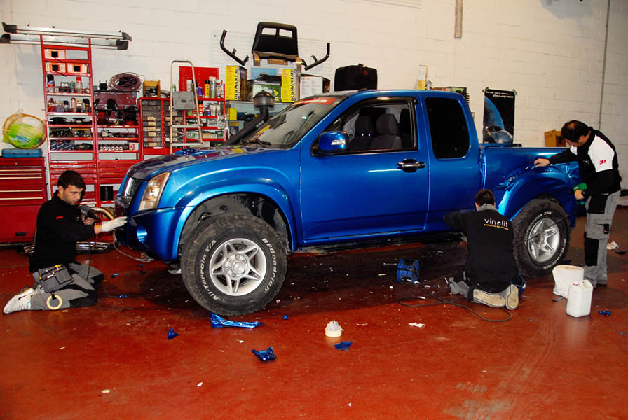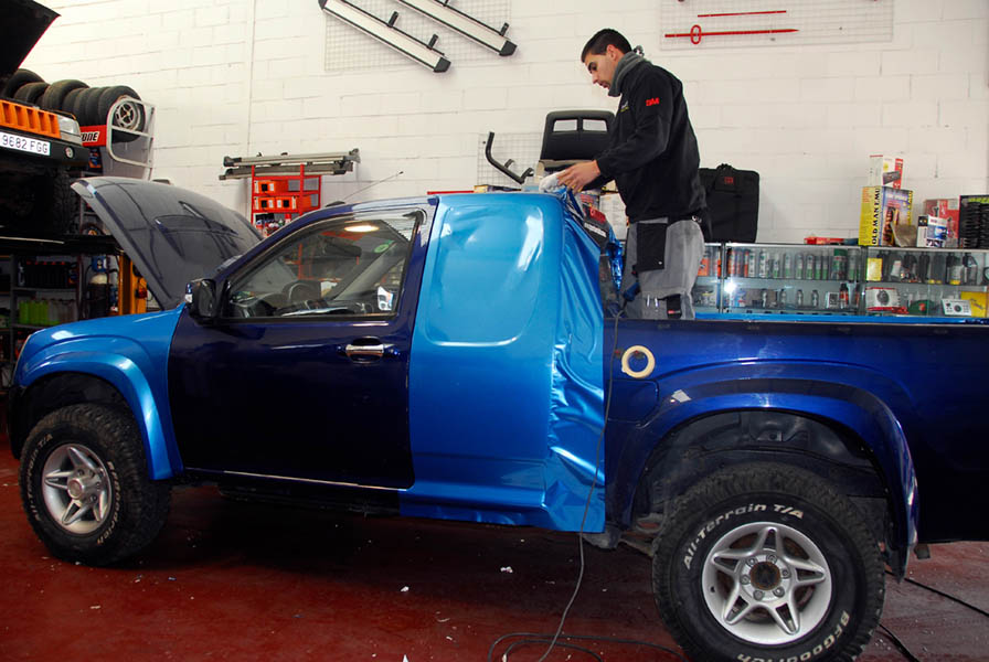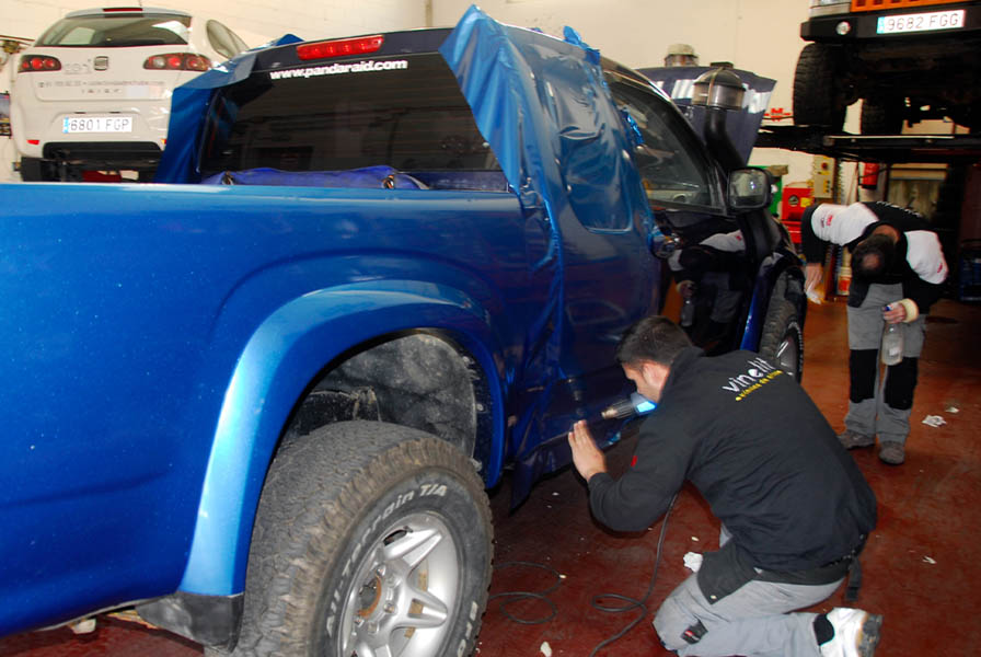¿Donde se realiza el vinilado?. Pues aunque Vinelit cuenta con una nave en la zona sur de Madrid, sus técnicos se desplazan a cualquier parte de España. tan solo hay que tener un lugar acondicionado (un taller con espacio suficiente). En el caso de la pick Up, la instalación se realizó en Rucar 4×4, taller colaborador de Vinelit, especializado en preparaciones de todo terrenos situado en Alcobendas (Madrid).