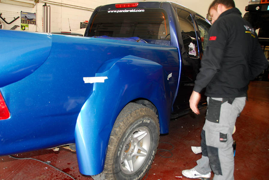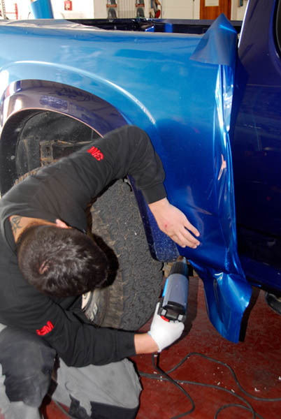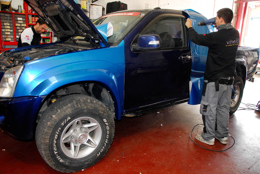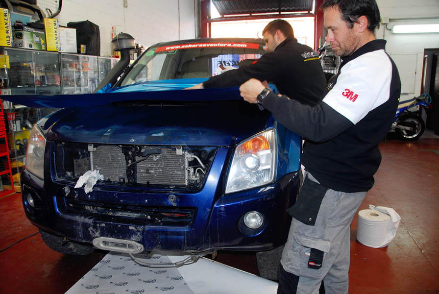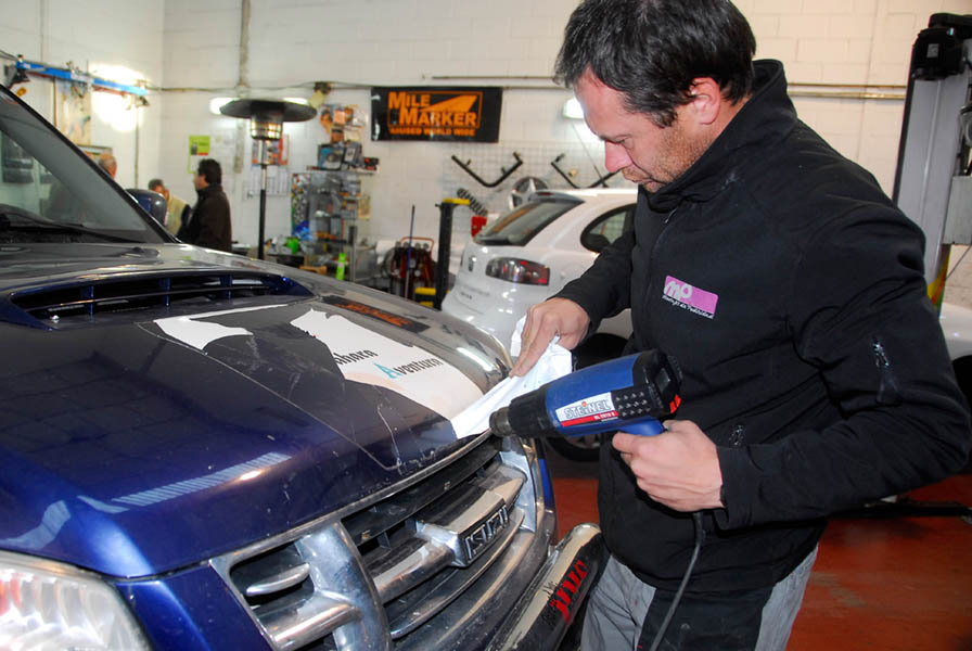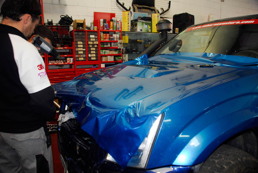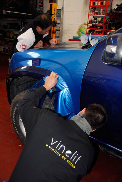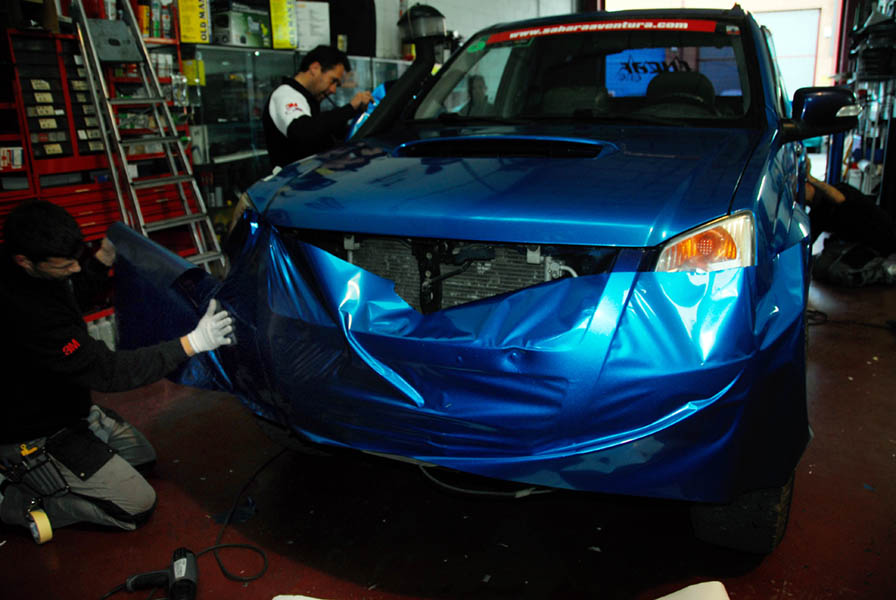 ¿Donde se realiza el vinilado?. Pues aunque Vinelit cuenta con una nave en la zona sur de Madrid, sus técnicos se desplazan a cualquier parte de España. tan solo hay que tener un lugar acondicionado (un taller con espacio suficiente). En el caso de la pick Up, la instalación se realizó en Rucar 4×4, taller colaborador de Vinelit, especializado en preparaciones de todo terrenos situado en Alcobendas (Madrid).