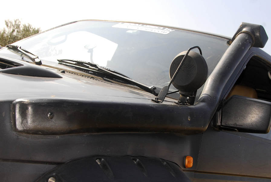 También recibió una nueva defensa delantera hecha a medida, así como la trasera, unas gruesas taloneras, para proteger la carrocería pero perfectamente instaladas bajo esta en una posición en la que no restaban prácticamente nada de ángulo ventral, un snorkel artesanal que realizó su propio suegro, la adaptación e instalación de unos aletines ensanchados para Jeep Cherokee; también recibió nuevos zapatos, que varían dependiendo de la temporada del año, y dada la importante cantidad de barro con la que se suele encontrar en su Galicia “natal” durante los mese de invierno, para estos menesteres usa las impresionantes 37/13´50-15 de las fotos sobre unas llantas de aluminio con stand y beadlock de hierro. Durante los meses de verano utiliza unas más “discretas” 35”.