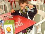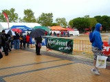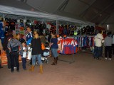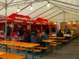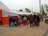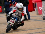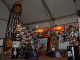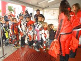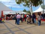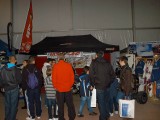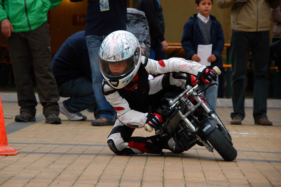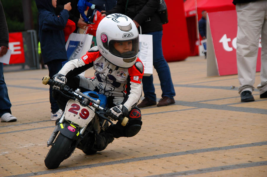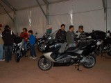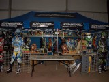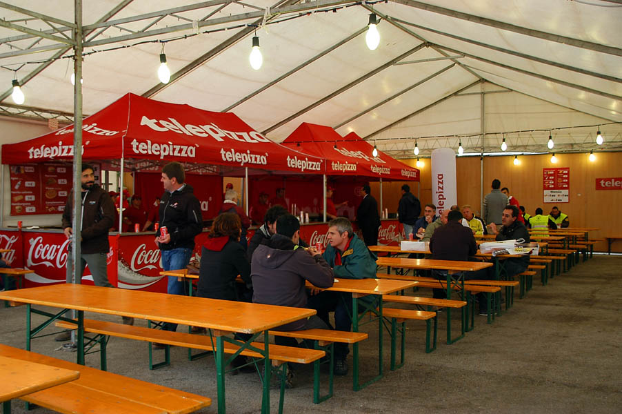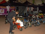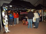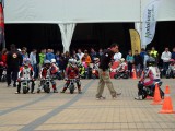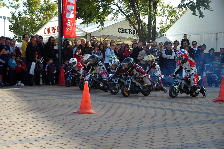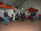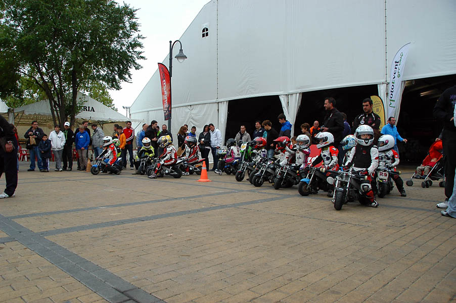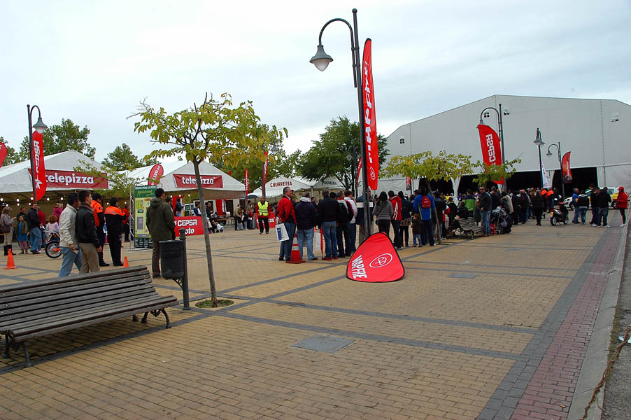 La mañana del sábado no parecía tenerlas todas consigo, y al llegar estaba chispeando, por lo que no todos dejaban su casco en la carpa guardacascos que había junto a la entrada. El cielo dio un respiro para que se pudiese celebrar la exhibición de minimotos a cargo de los niños de la Escuela Lorenzo Competición, y casi al terminar esta, volvió a llover de nuevo, por lo que el personal aprovechó para refugiarse en las carpas, tanto en la principal como en las de restauración, y de esta manera aprovechar para tomar algo calentito, ya que el aire frío todavía estaba haciendo de las suyas.