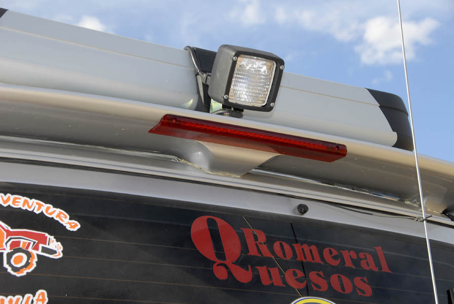 Su “encuentro con la tercera fase” consistió en añadirle una baca Rhino Rack africana, en medida de 1,2 metros de largo, sobre barras de techo de la misma marca y atornillada al techo, ya que el coche no lleva enganche de baca, a la que añadió unos soportes para los focos, el gato Hi Lift y el enganche para llevar la rueda de repuesto encima; cuatro focos delanteros para la baca, dos Maxtel y dos Hella Jumbo 320, todos ellos con bombillas Amolux Xenon Laser de 100 watios y un foco para la baca trasera Hella FF con la misma bombilla que los anteriores.