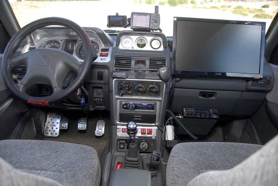 También le siguió el montaje de una pantalla plana Led de 18,5 pulgadas, para enchufar el portátil, en la consola central fabricó una consola más pequeña en aluminio, para ubicar todos los interruptores de los accesorios eléctricos del coche, focos, fuente de alimentación, compresor, manómetro del compresor, junto con una iluminación led, para que se puedan ver por la noche; el altímetro del coche fue sustituido por un reloj que mide la presión de soplado del turbo; instaló unos pedales y palanca de cambios de la marca Sparco y se fabricó en madera de contrachapado una cajonera para el maletero de dos cajones, que una vez terminada tapizó, dejando un hueco en el lado derecho en donde instaló toda la centralización de los accesorios eléctricos del coche, los relés, los fusibles, el convertidos de 12 a 220 voltios y el compresor de aire; en la misma cajonera instaló un enchufe de corriente de 220 voltios y un enchufe para los accesorios de aire del compresor. Sobre la cajonera instaló unas anillas, para sujetar garrafas de combustible, cajas de herramientas, una caja con todos los recambios de fusibles, bombillas, y accesorios pequeños, y lo protegió con una lámina de goma, para no estropear el tapizado.