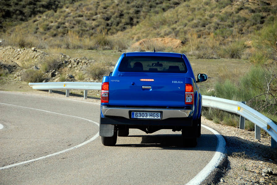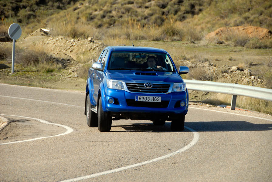 Si el 4×4 es todo un Hilux, esto es una obligación, y primero por pistas rápidas, nos metimos a descubrir cuales eran las capacidades de este nuevo Hilux. En este tipo de terreno (pistas rápidas y relativamente fáciles), gracias entre otras cosas a su longitud, se comporta de manera muy, muy noble, mostrándose siempre controlable, contando además, con los controles de tracción y estabilidad para facilitarnos la vida en aquellos momentos en que nos hemos animado demasiado, el problema es que el significado “demasiado” comienza muy pronto para la electrónica del Hilux, por lo que nuestras ansias se verán permanentemente coartadas por ella. Por suerte, el control de tracción se puede desconectar para disponer de un poco más de libertad, y digo bien “un poco más”, porque aún desconectado, este no lo hace del todo y en situaciones de mucho “descontrol” entra, aunque de manera menos intrusiva que cuando está conectado.