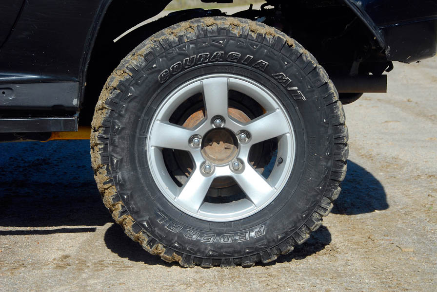Siguiendo con el proceso de hacer más campero su X90, Ricardo le colocó unos neumáticos Federal Couragia, en medidas 235/75-16, montados en unas llantas de aluminio originales de un Suzuki Jimny de serie y unos separadores + 3 cm. de doble centrado, momento en que hubo que recortar las aletas y modificar los pasos de rueda para que nada rozase.