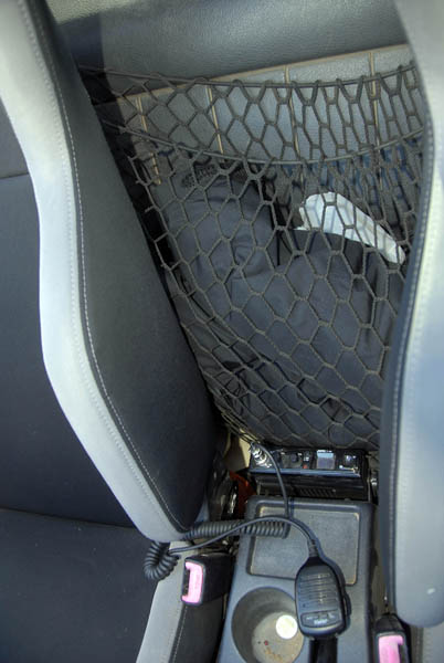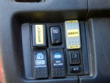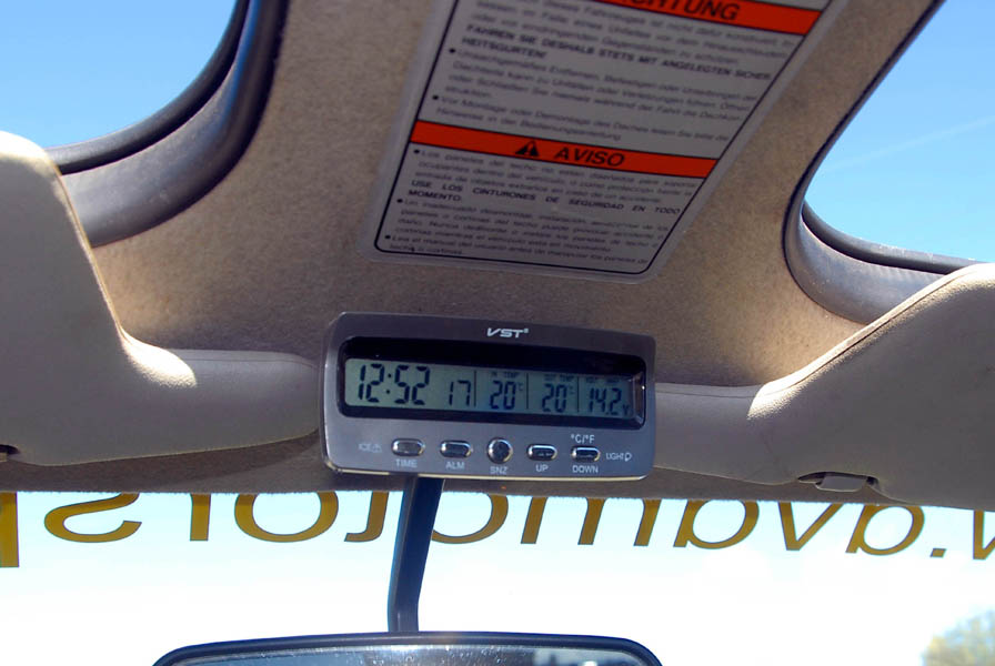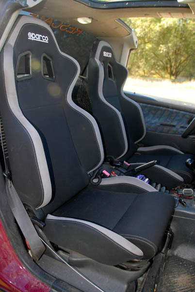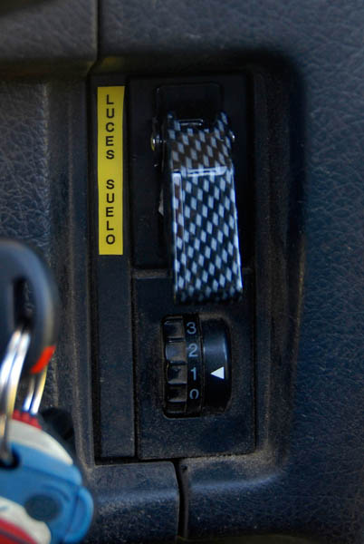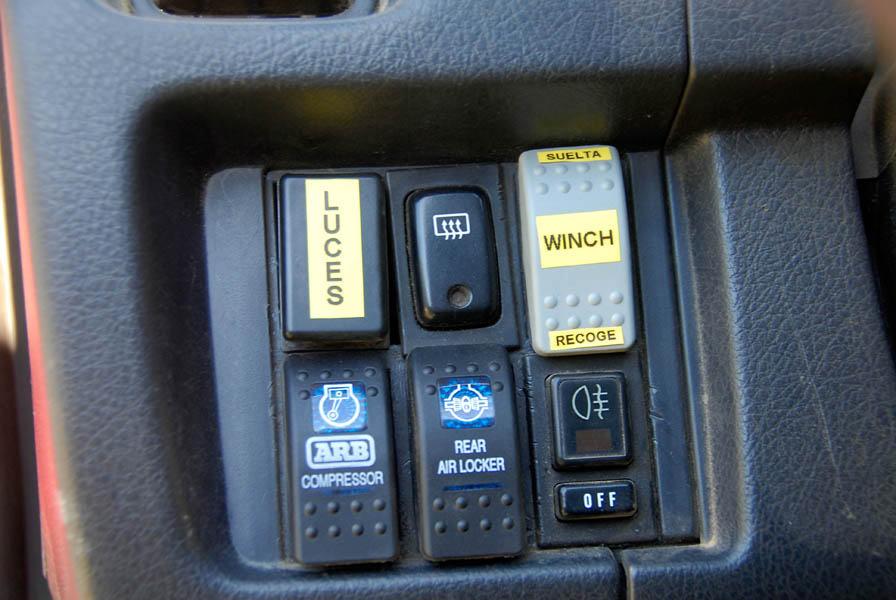 En el interior, aparte de los baquets Sparco, podemos ver el botón para activar el cabrestante, aunque también dispone de un mando a distancia, para cuando tiene que sacarse las castañas del fuego sin ayuda, la emisora de 27 Mhz, imprescindible para la coordinación (y diversión), durante las rutas, un reloj digital que le ofrece la temperatura interior y exterior, además de voltímetro, situado sobre el espejo retrovisor interior, los botones del bloqueo y del compresor, también de la marca ARB y el interruptor de las luces de suelo, que además de bonito, ayudan mucho en los desatascos cuando estos se producen de noche.