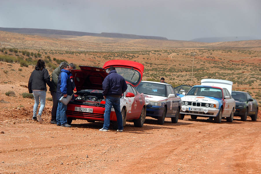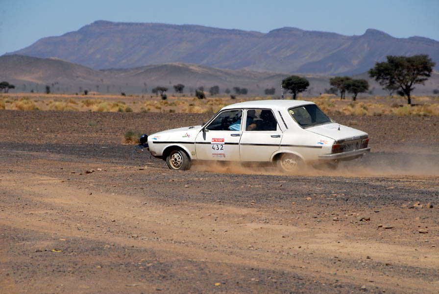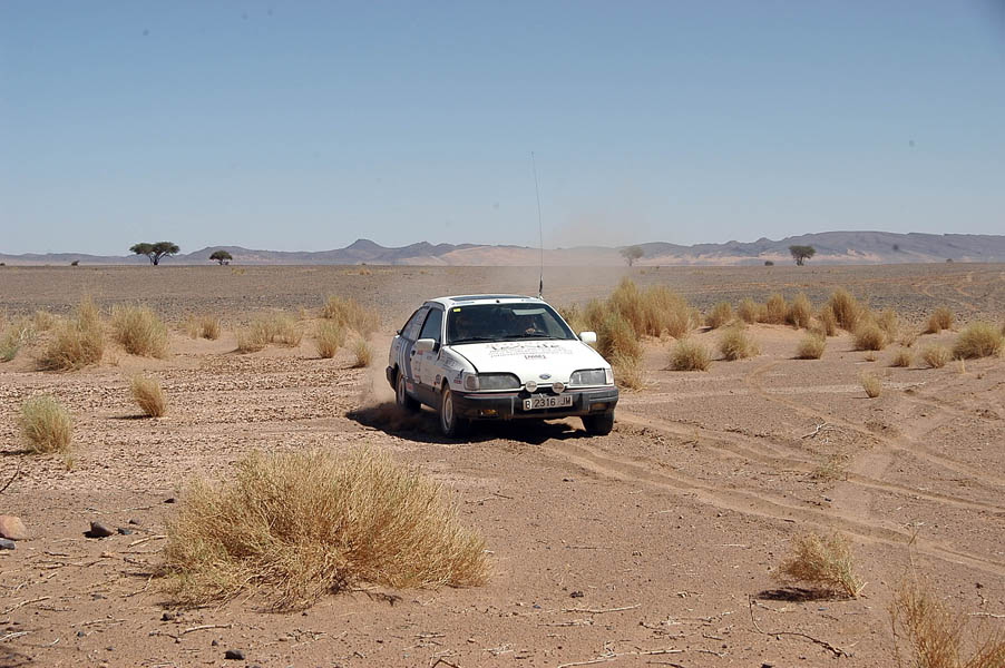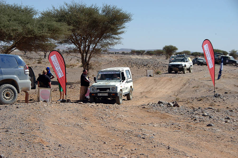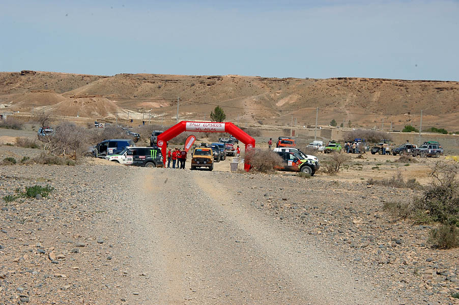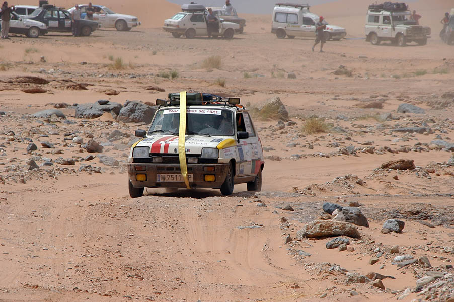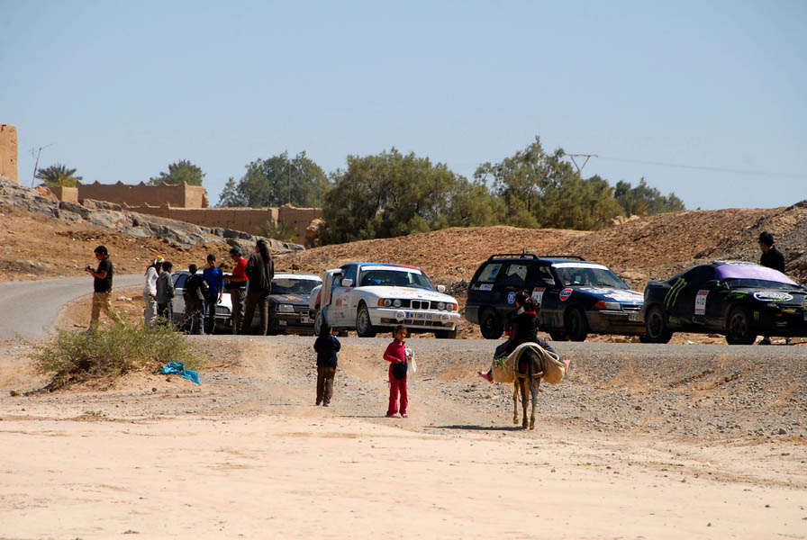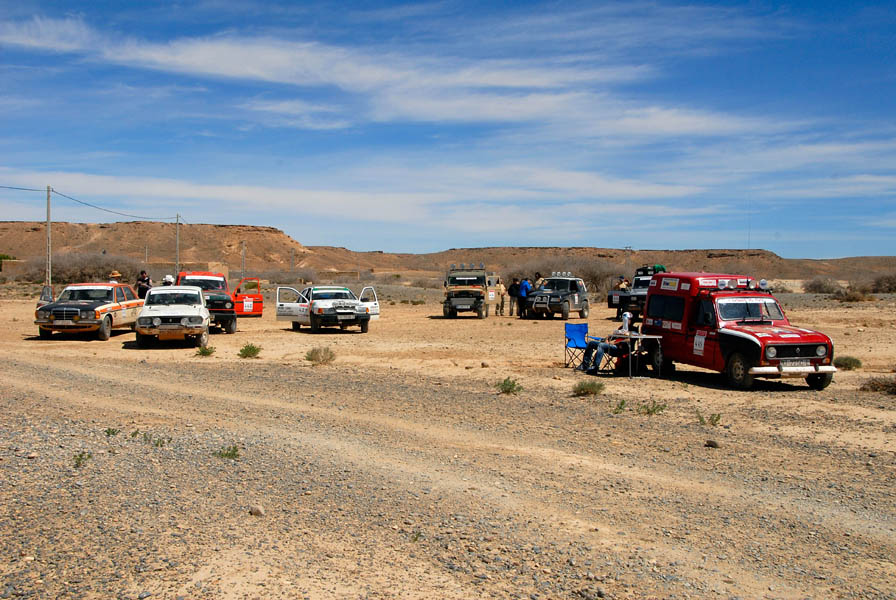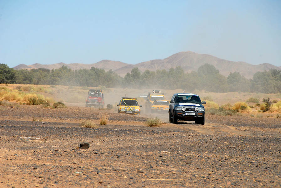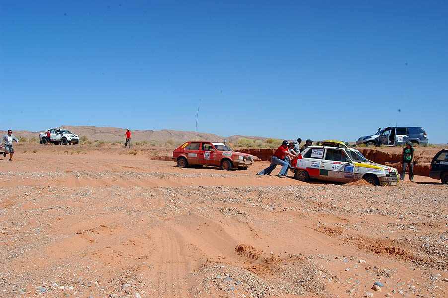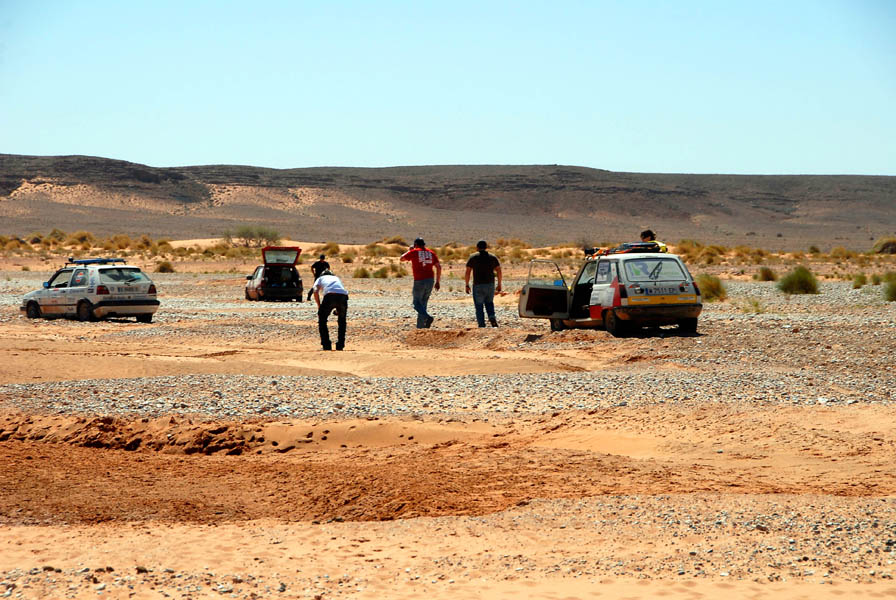 La quinta etapa incluía un tramo de orientación con brújula que se realizaría al suroeste de Rissani, tras salir del albergue se realizaría el enlace por carretera hasta llegar y atravesar esta bulliciosa ciudad, para tras los 46 Km. de enlace llegar al punto donde se daría la salida al tramo de regularidad. Casi 90 Km. de pistas de todo tipo después, el road book de los participantes dejaba de tener las clásicas informaciones para pasar a tener fotos de diferentes acacias, hacia las cuales habrían de dirigirse siguiendo los rumbos que indicaba el road book. A partir de estos momentos fue frecuente ver coches que avanzaban en muy diversas direcciones sin tener muy claro si la que habían elegido era la buena. Esto motivó que tras cumplirse el tiempo previsto de entrada de los participantes, todavía hubiese algunos que no habían encontrado el camino bueno hacia la meta, lo que motivo que los coches de organización tuviesen que ir a la “busca y captura” del participante perdido. Finalmente, encontrados los perdidos y rescatados los averiados, todos pudieron llegar hasta el camping Tifina, lugar de “residencia” para la caravana durante esa noche.