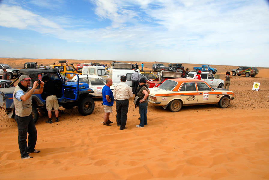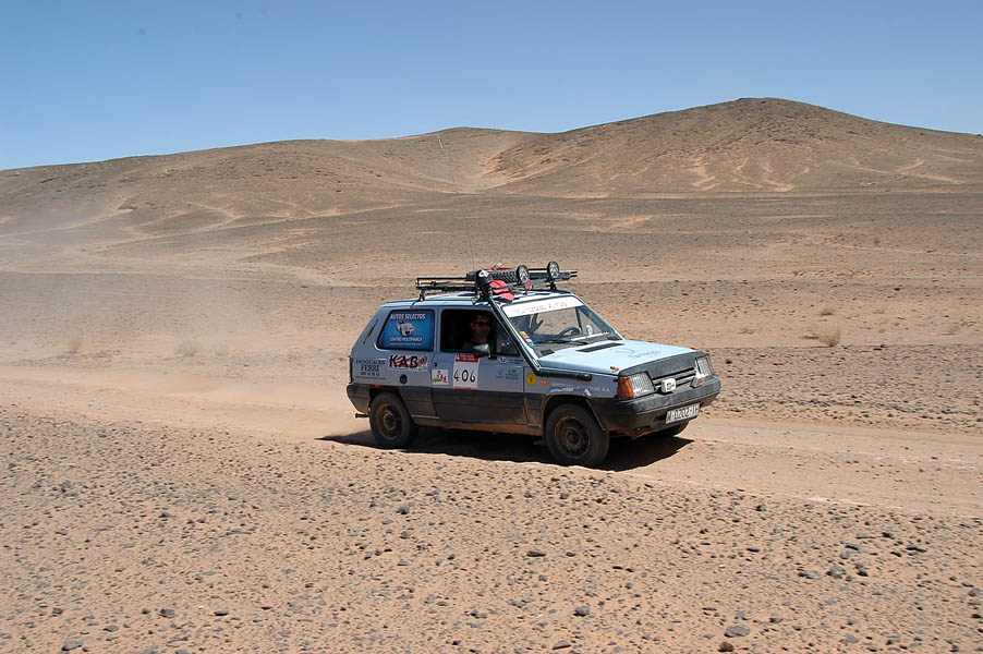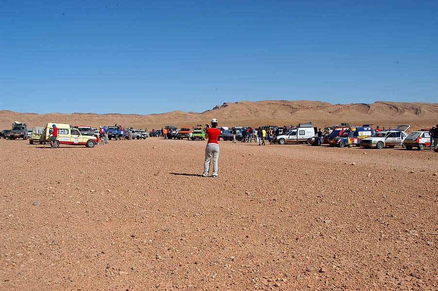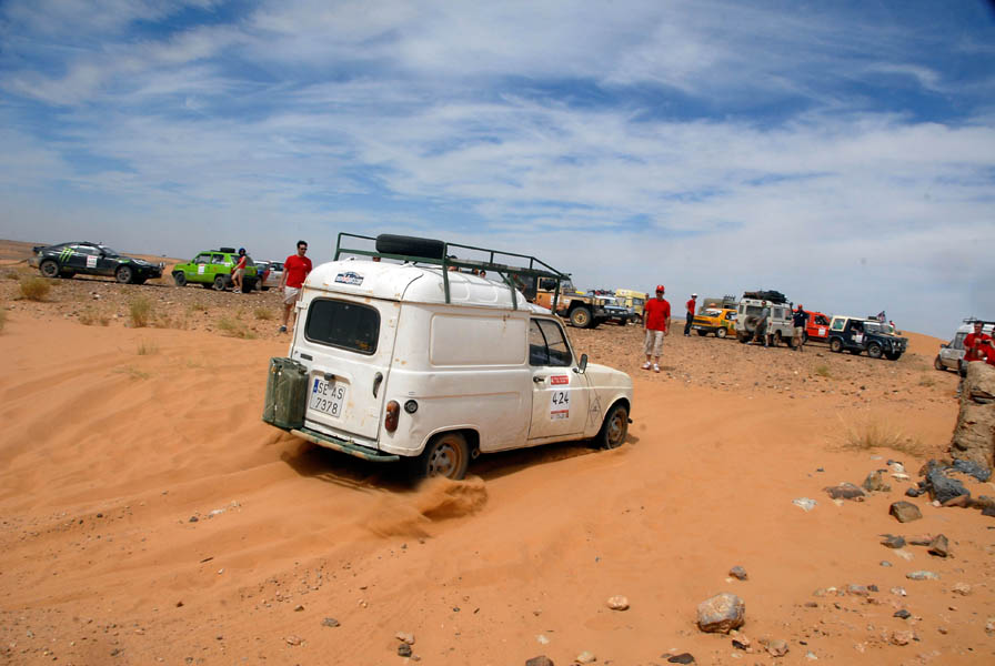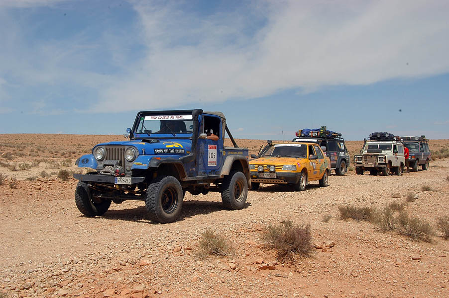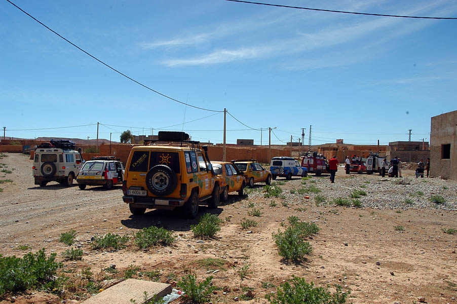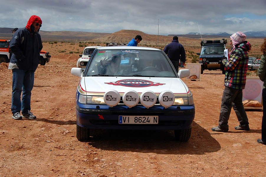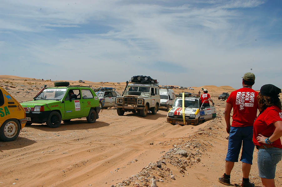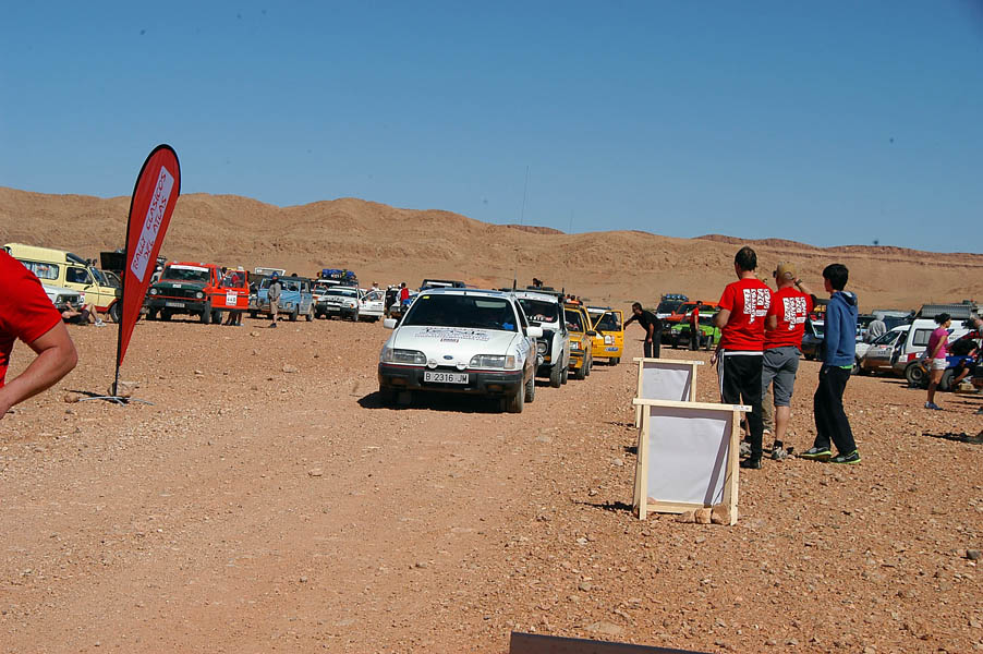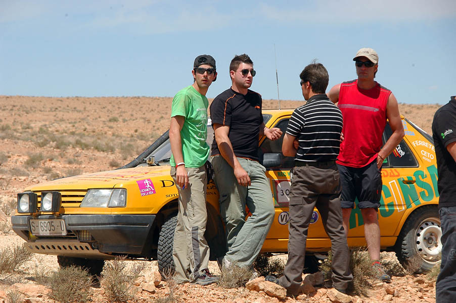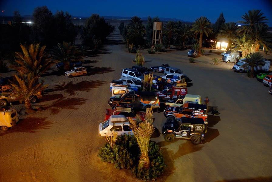La quinta etapa incluía un tramo de orientación con brújula que se realizaría al suroeste de Rissani, tras salir del albergue se realizaría el enlace por carretera hasta llegar y atravesar esta bulliciosa ciudad, para tras los 46 Km. de enlace llegar al punto donde se daría la salida al tramo de regularidad. Casi 90 Km. de pistas de todo tipo después, el road book de los participantes dejaba de tener las clásicas informaciones para pasar a tener fotos de diferentes acacias, hacia las cuales habrían de dirigirse siguiendo los rumbos que indicaba el road book. A partir de estos momentos fue frecuente ver coches que avanzaban en muy diversas direcciones sin tener muy claro si la que habían elegido era la buena. Esto motivó que tras cumplirse el tiempo previsto de entrada de los participantes, todavía hubiese algunos que no habían encontrado el camino bueno hacia la meta, lo que motivo que los coches de organización tuviesen que ir a la “busca y captura” del participante perdido. Finalmente, encontrados los perdidos y rescatados los averiados, todos pudieron llegar hasta el camping Tifina, lugar de “residencia” para la caravana durante esa noche.
