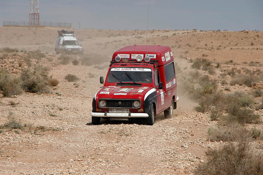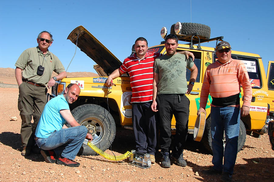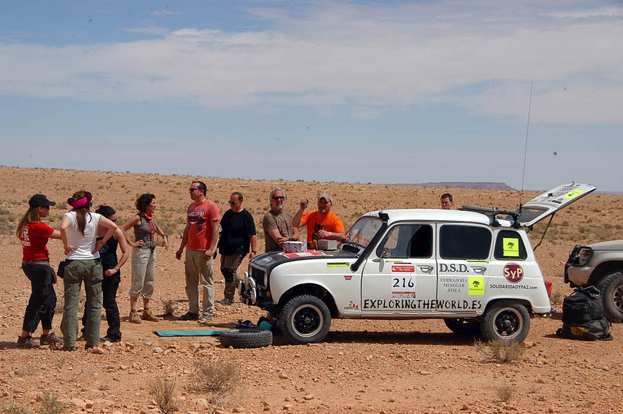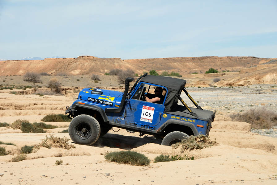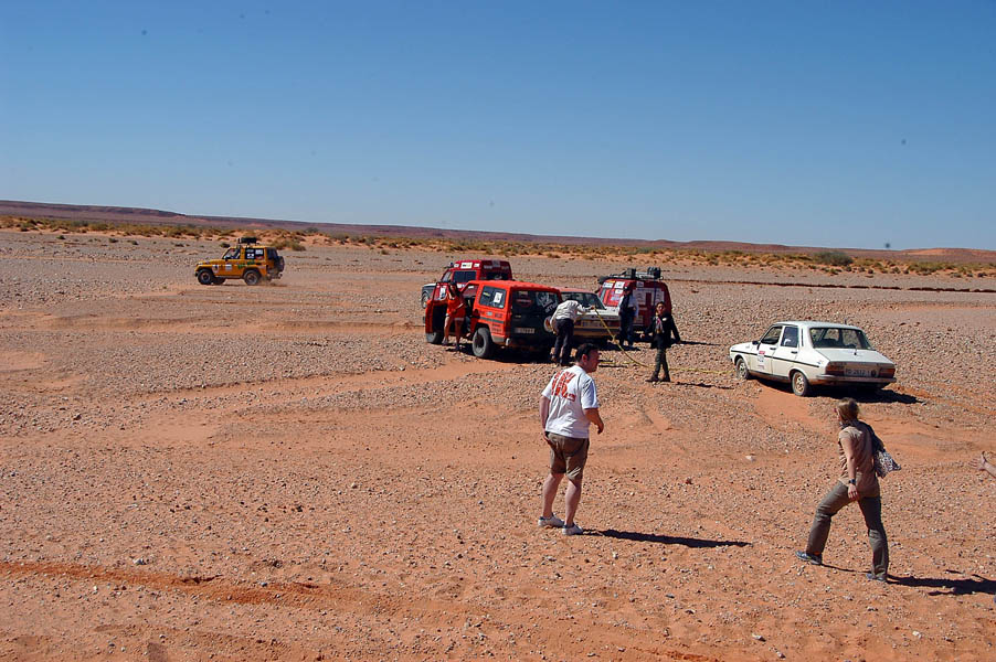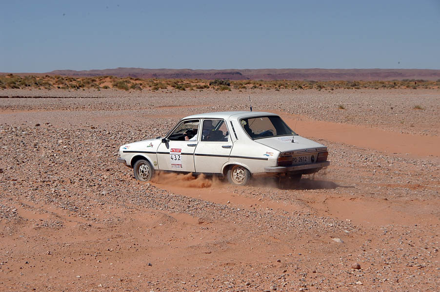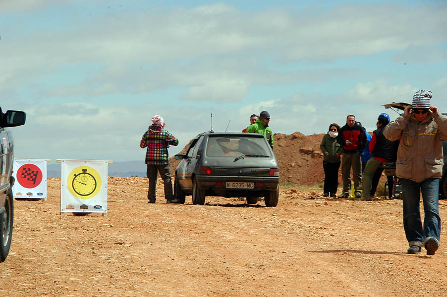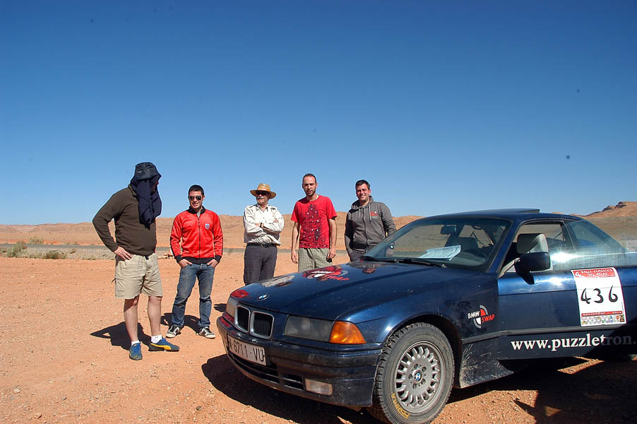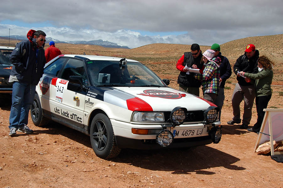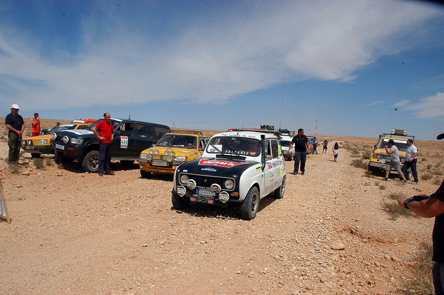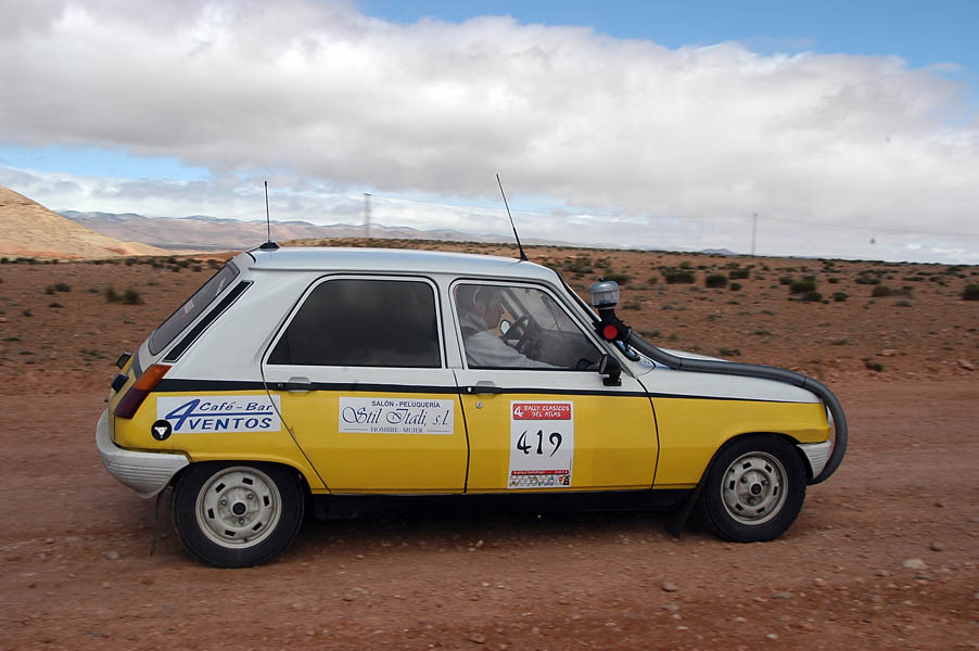 La quinta etapa incluía un tramo de orientación con brújula que se realizaría al suroeste de Rissani, tras salir del albergue se realizaría el enlace por carretera hasta llegar y atravesar esta bulliciosa ciudad, para tras los 46 Km. de enlace llegar al punto donde se daría la salida al tramo de regularidad. Casi 90 Km. de pistas de todo tipo después, el road book de los participantes dejaba de tener las clásicas informaciones para pasar a tener fotos de diferentes acacias, hacia las cuales habrían de dirigirse siguiendo los rumbos que indicaba el road book. A partir de estos momentos fue frecuente ver coches que avanzaban en muy diversas direcciones sin tener muy claro si la que habían elegido era la buena. Esto motivó que tras cumplirse el tiempo previsto de entrada de los participantes, todavía hubiese algunos que no habían encontrado el camino bueno hacia la meta, lo que motivo que los coches de organización tuviesen que ir a la “busca y captura” del participante perdido. Finalmente, encontrados los perdidos y rescatados los averiados, todos pudieron llegar hasta el camping Tifina, lugar de “residencia” para la caravana durante esa noche.